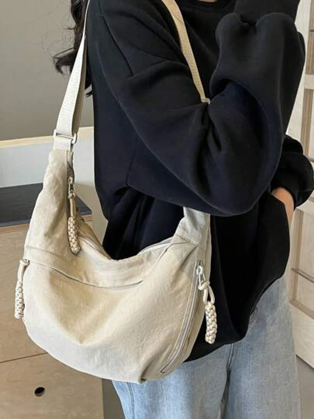 peach tree 1pc Peach Tree Crescent Moon Crossbody Bag Versatile Casual Large Capacity Adjustable Shoulder Strap Multi Pockets Vintage Lightweight Water Washed Nylon Material Christmas Men Bag Vacation