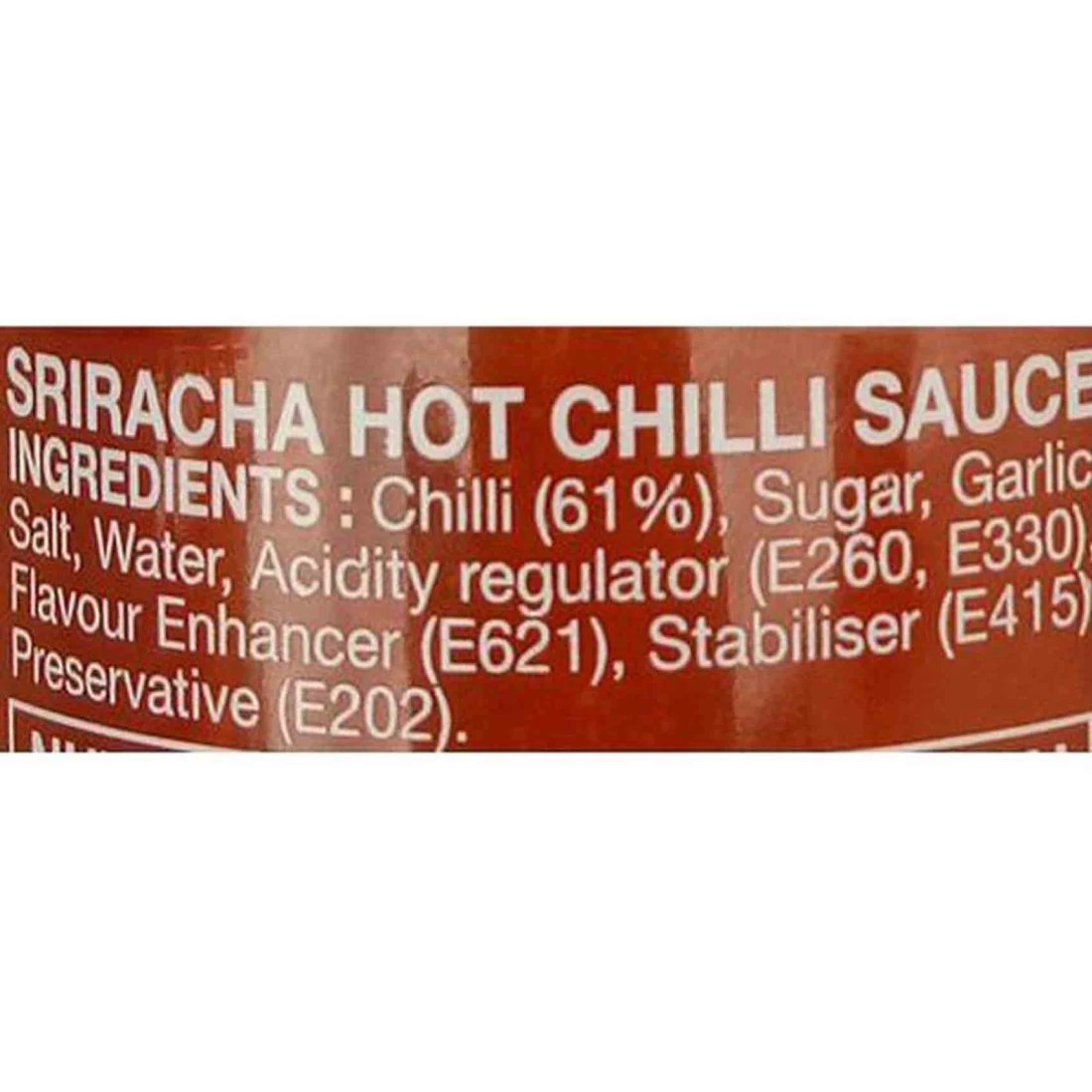 ingredients : Chilli 70%, Garlic, Sugar, Water, Flavour Enhancer (e621), Stabilizer: (e415), Citric Acid (e330), Preservative (e202)