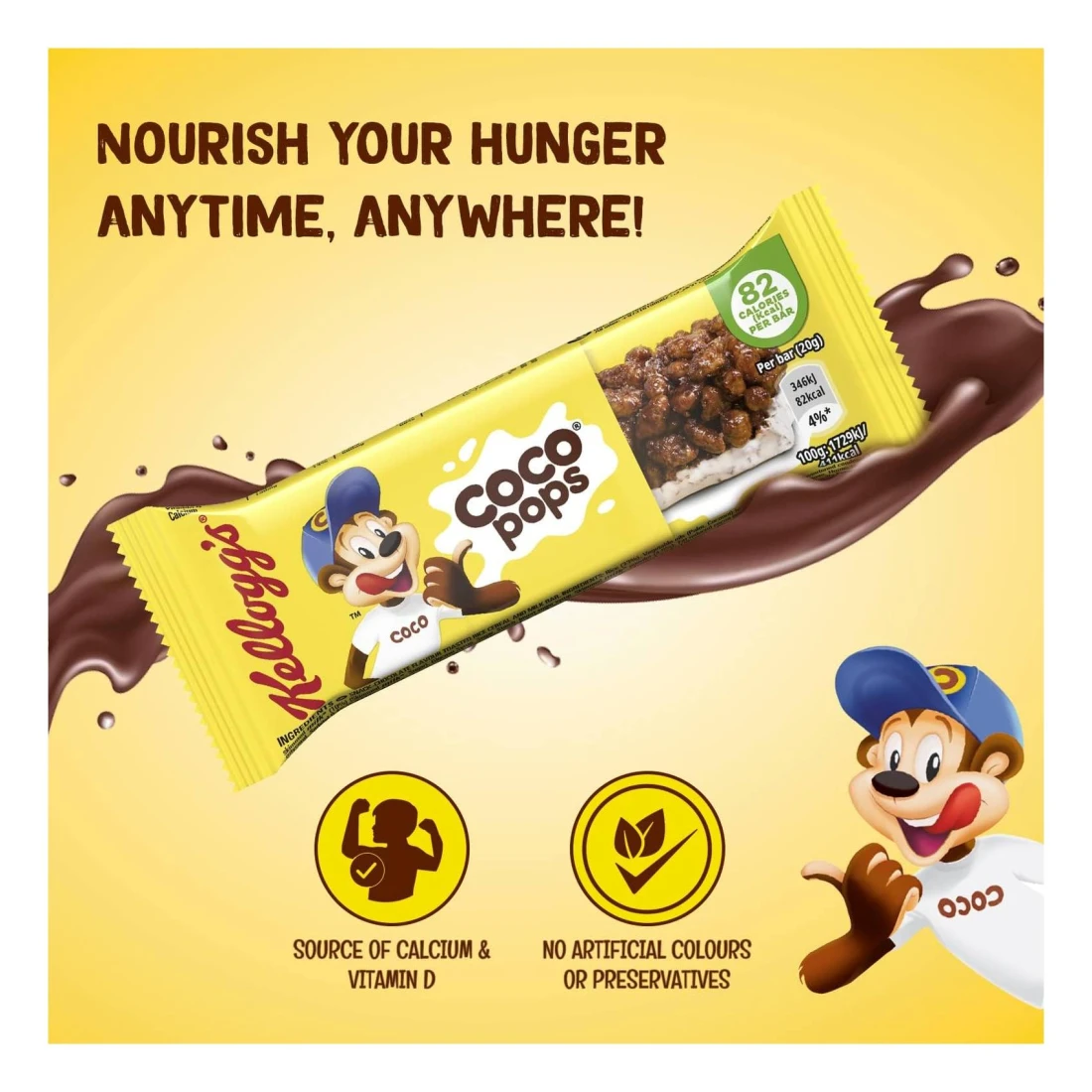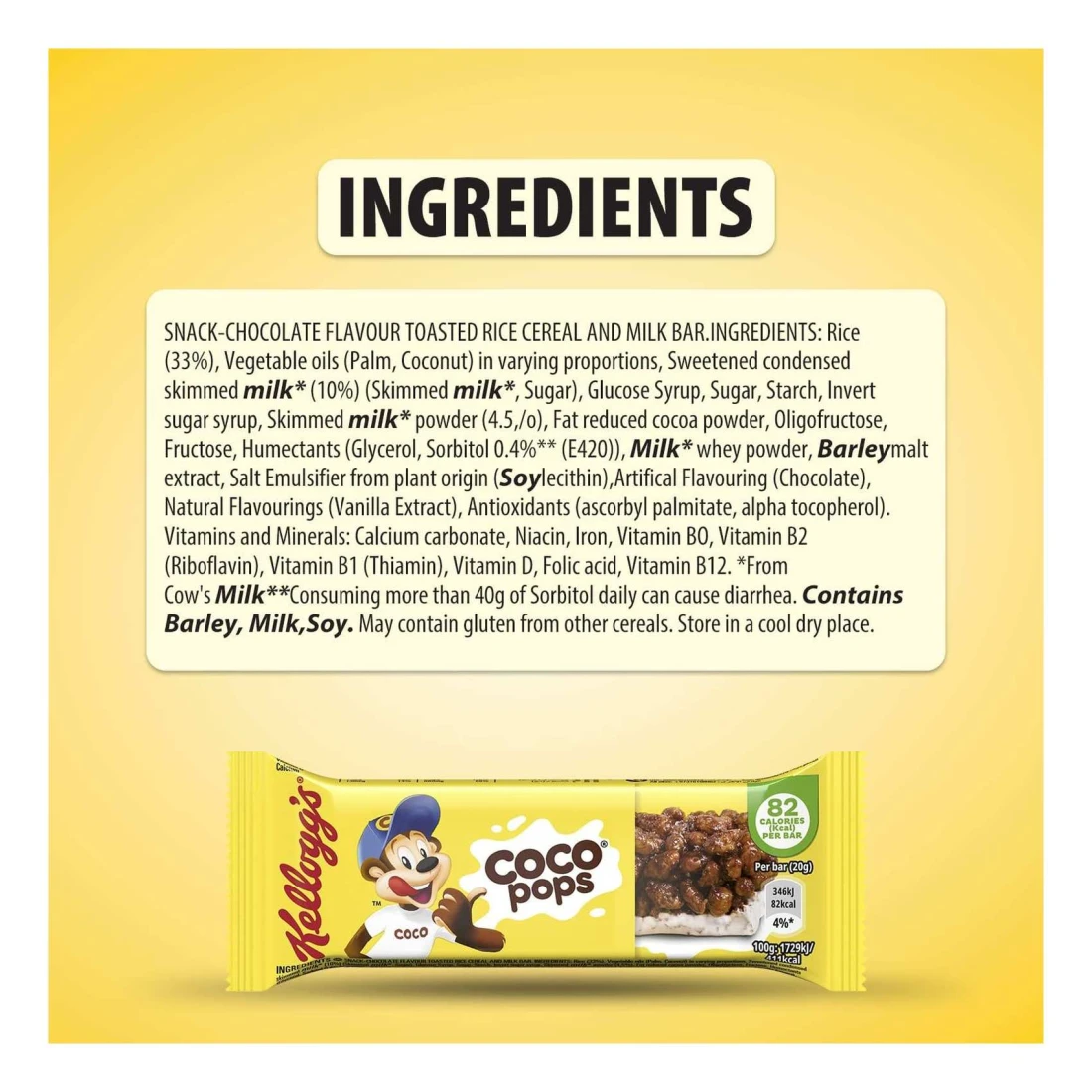 ingredients : Kellogg's Coco Pops Cereal (42%) (Rice, Glucose Syrup, Sugar, Fat Reduced Cocoa Powder, Cocoa Mass, Salt, Barley Malt Extract, Flavourings, Niacin, Iron, Vitamin B6, Vitamin B2 {Riboflavin}, Vitamin B1 {Thiamine}, Folic Acid, Vitamin D, Vitamin B12), Vegetable Oils (Palm, Palm Kernel, Coconut) In Varying Proportions, Sweetened Condensed Skimmed Milk (8%) (Skimmed Milk, Sugar), Starch, Glucose Syrup, Invert Sugar Syrup, Sugar, Dried Skimmed Milk (4%), Oligo Fructose, Stabilizer (Calcium Carbonate), Fructose, Humectants (Glycerol, Sorbitol E420 (04%)), Milk Whey Powder, Fat Reduced Cocoa Powder, Flavourings, Emulsifier (Soy Lecithin), Antioxidants (Ascorbyl Palmitate, Alpha Tocopherol), Vitamin D