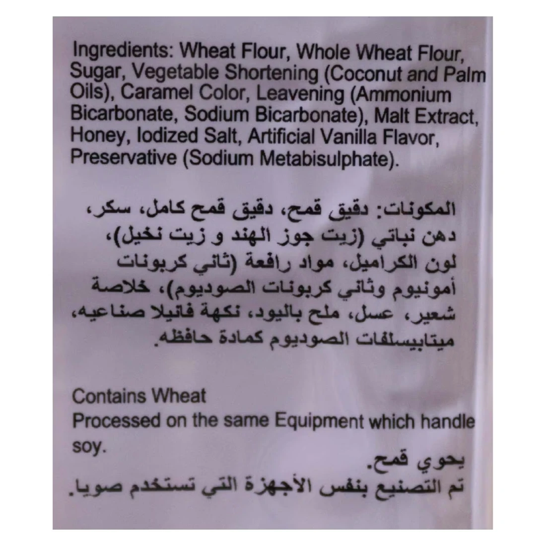 ingredients : Wheat Flour, Sugar, Vegetable Shortening (Hydrogenated Coconut and Palm Oils), Whole Wheat Flour (5%), Malt Extract, Honey (0,8%), Colouring: E150A, Salt, Acidifiers: E503, E500, Artificial Vanilla Flavour, Preservative: E223 (Sulphite)