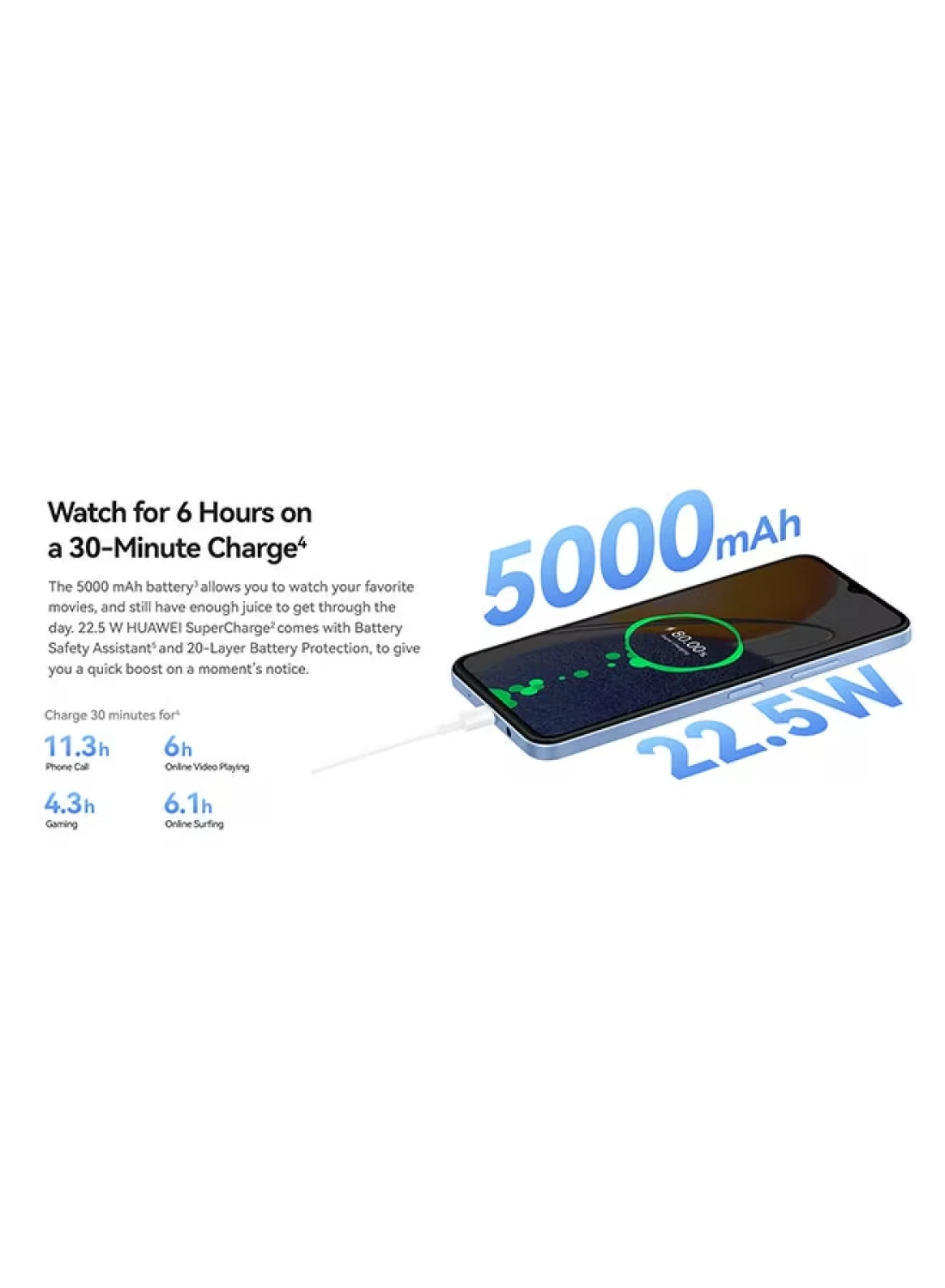 22.5W Super Charging22.5 W HUAWEI SuperCharge comes with Battery Safety Assistant*** and 20-Layer Battery Protection to give you a quick boost on a moment's notice.