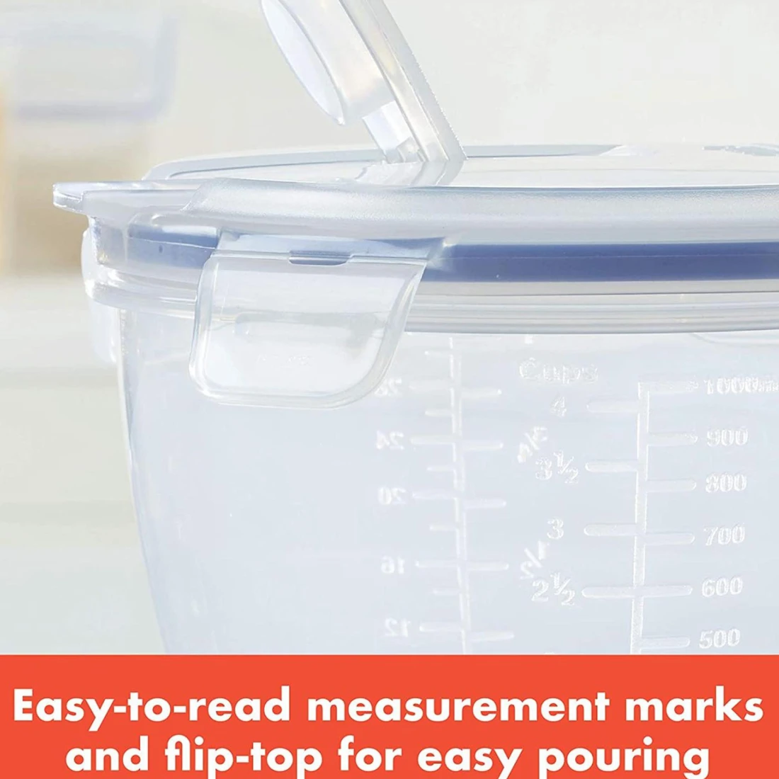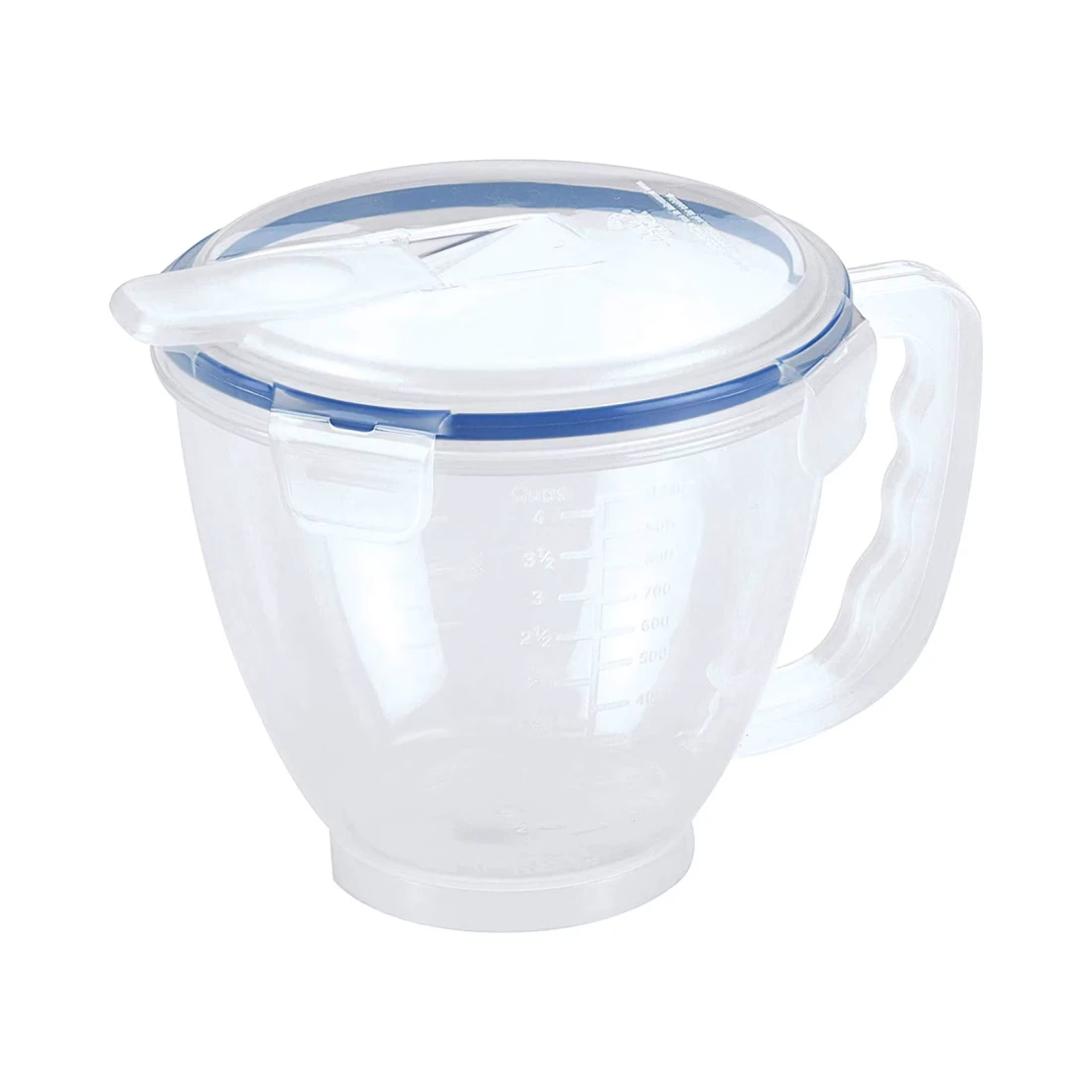 - It features a flip seal lid and is marked in increments of cups and ml and Qtz