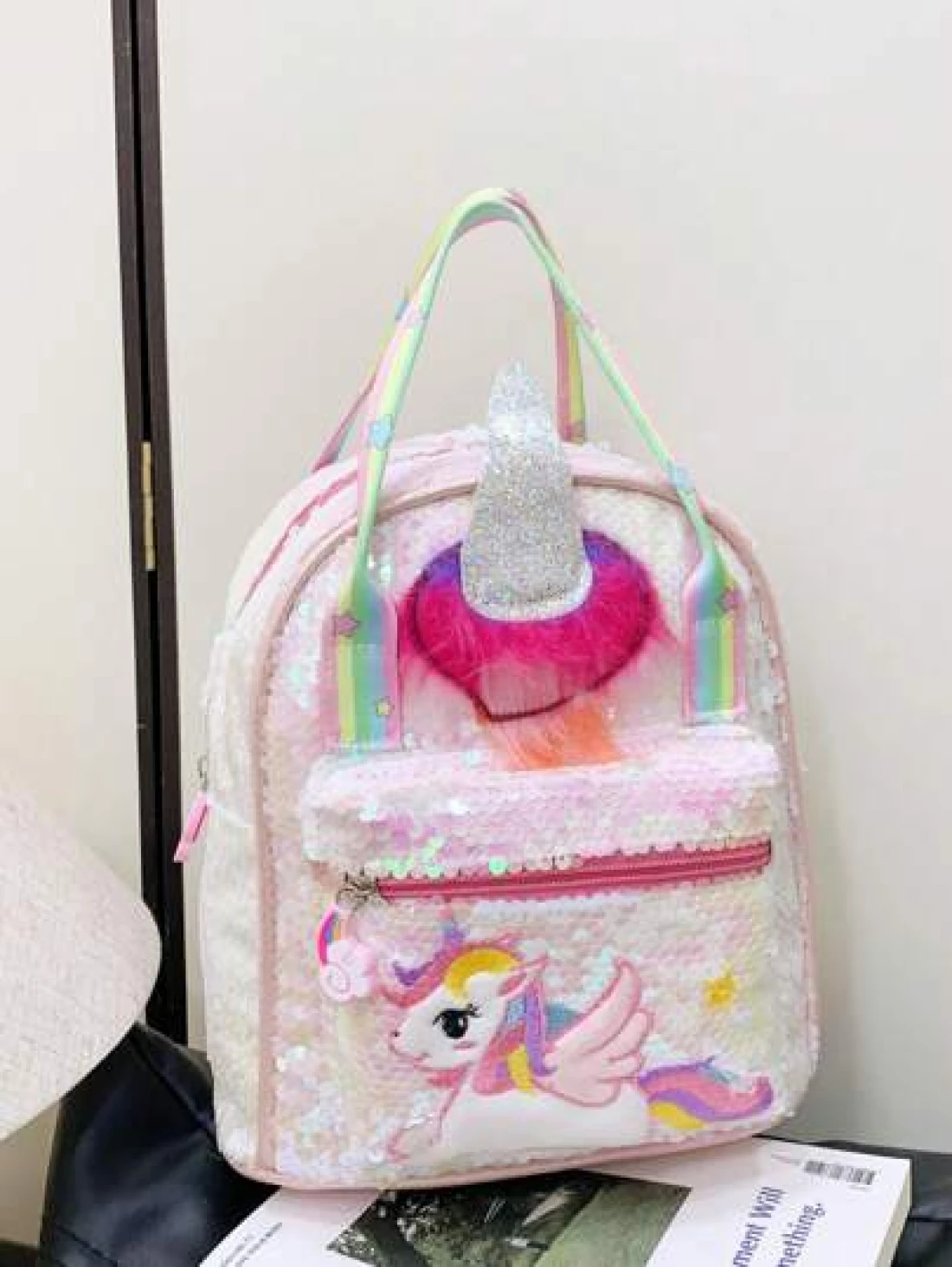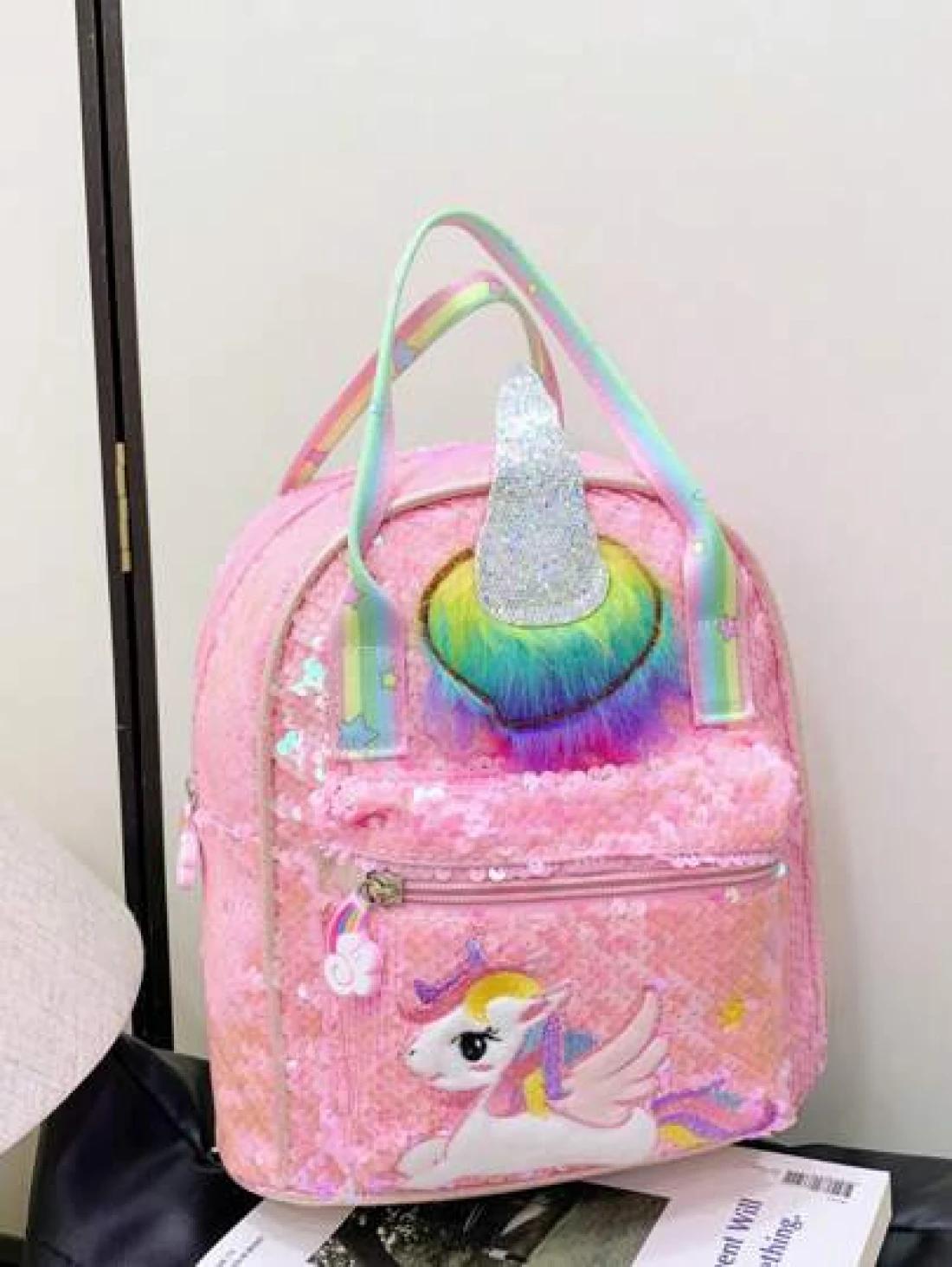 1 Pc New Sequined Material Cute Cartoon Pony Solid Color Girl Backpack Can Be Carried On One Shoulder Smooth Zipper Opening And Closing Sweet And Exquisite Elegant And Stylish Suitable For School Travel Outdoor Shopping