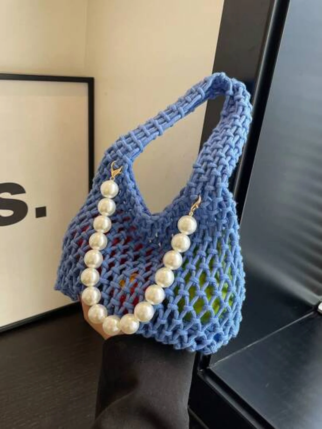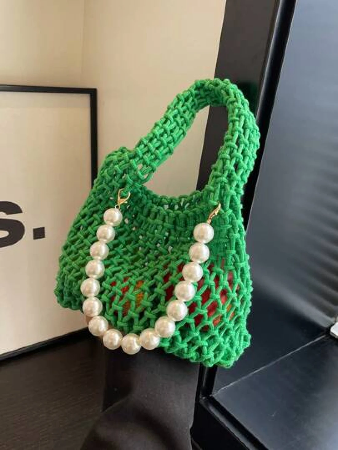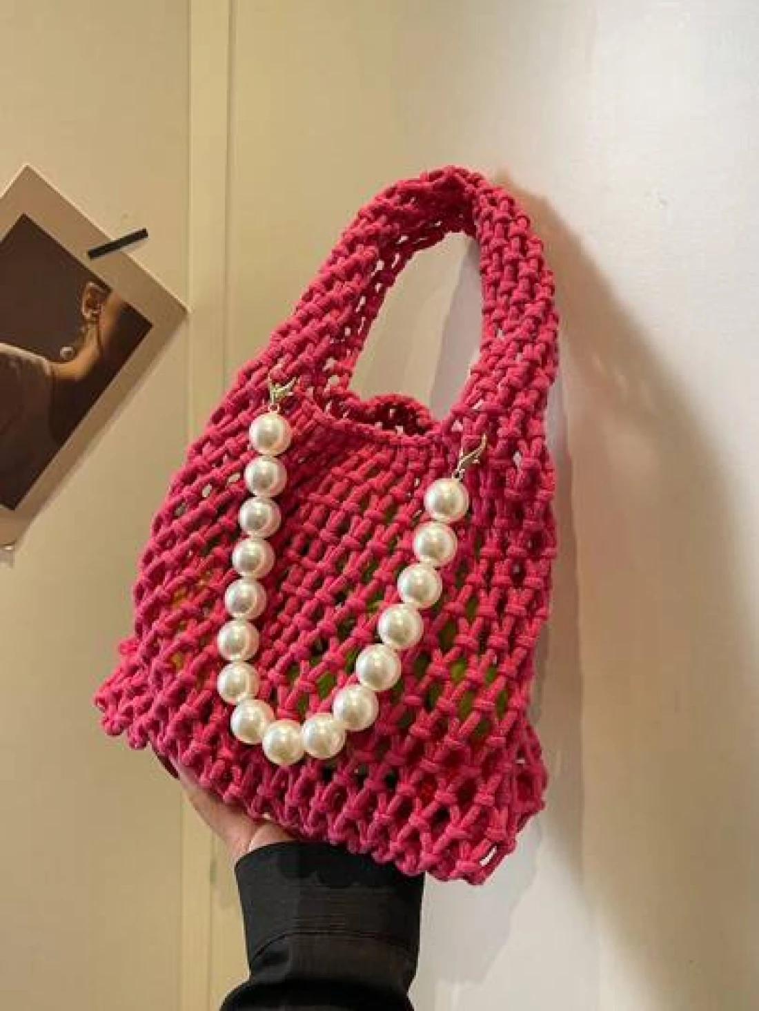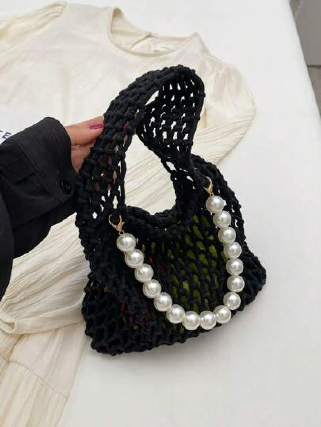 1pc Handbag Open Top Opening And Closing Niche Pearl Hollow Design Bag For Girl New Summer Fashion Braided Small Bag Casual And Versatile Beach Bag Suitable For Daily Outings And Vacations A Perfect Gift For Girls