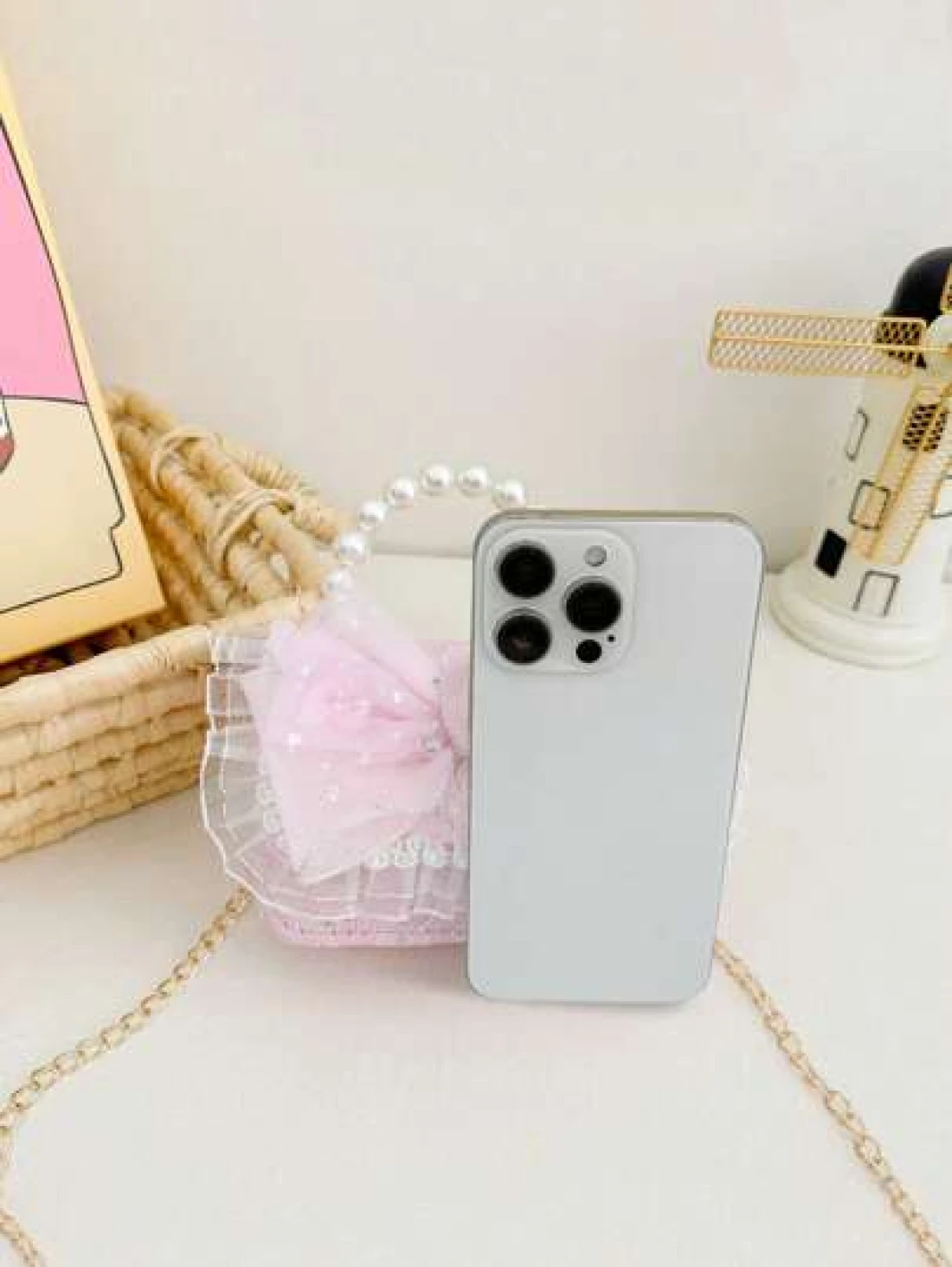 1 Pc Mini Fashion Shiny Young Children Pearl Handbag Chain Crossbody Bag Flip Bag Samll Square Bag Kawaii Princess Bag Toddler Coin Purse Cute Candy Storage Bag Portable Light Sweet Big Lace Bow Sequi