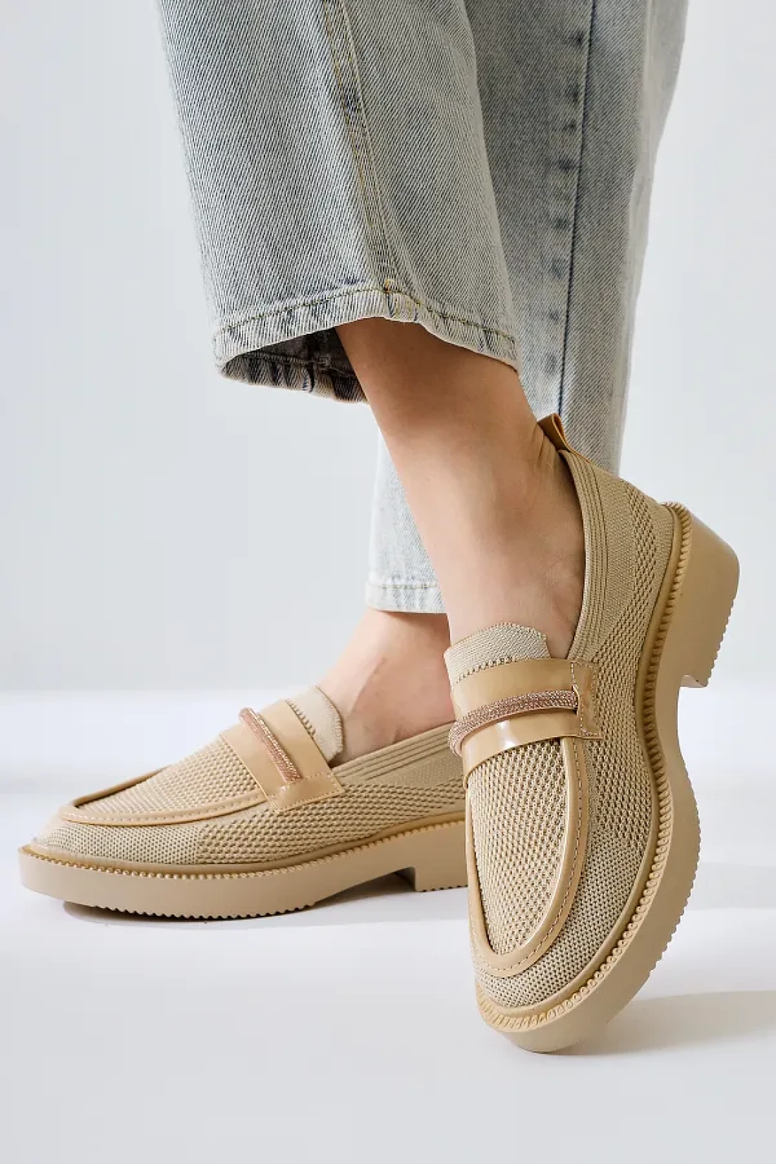 It offers a comfortable walking experience with its 4 cm) design The beige-colored knit details, which stand out with their stylish and modern appearance, match your daily combinations. The design enriched with stone band details does not compromise its durability while increasing the aesthetic value of the shoe