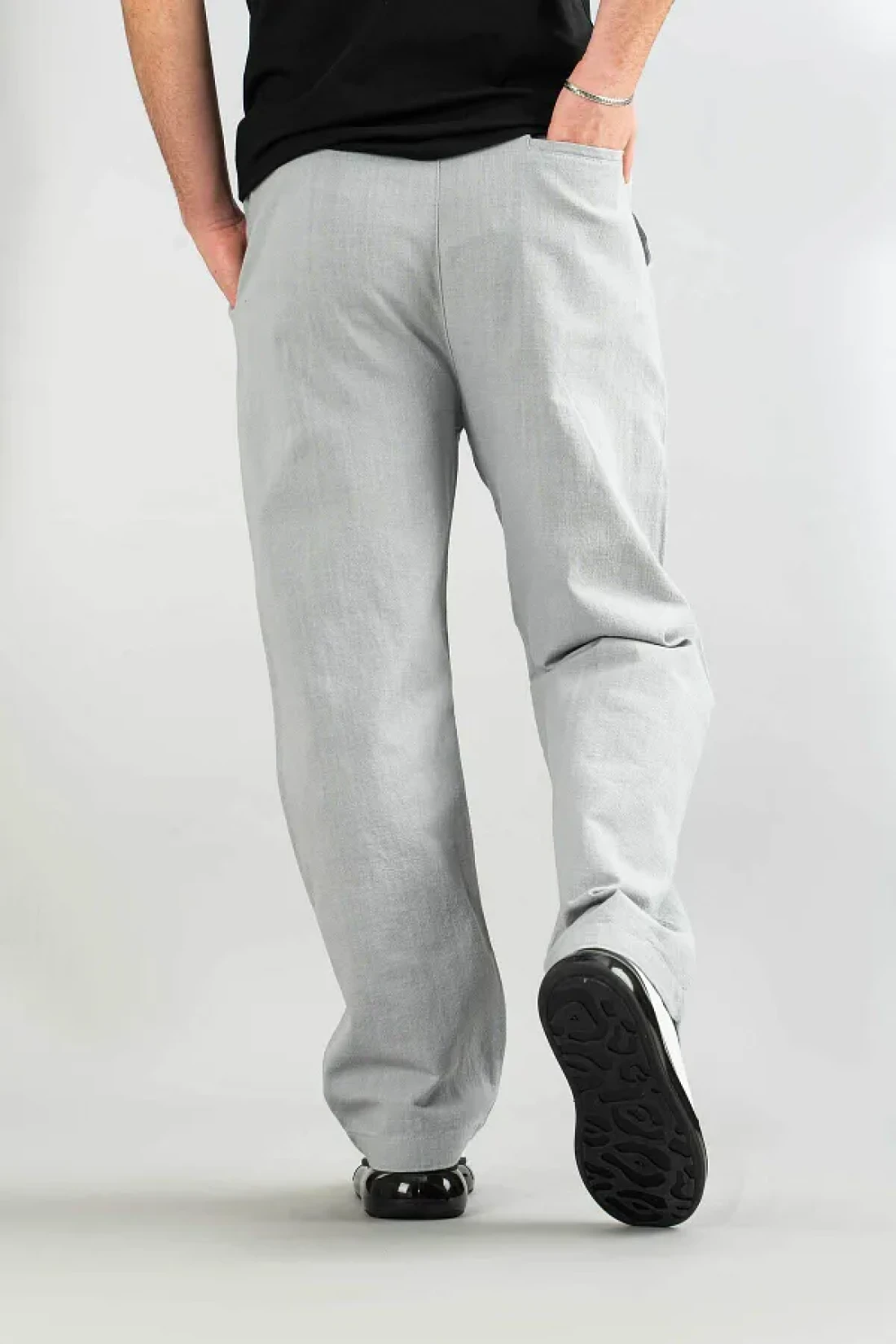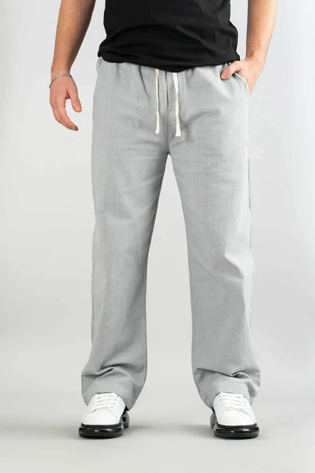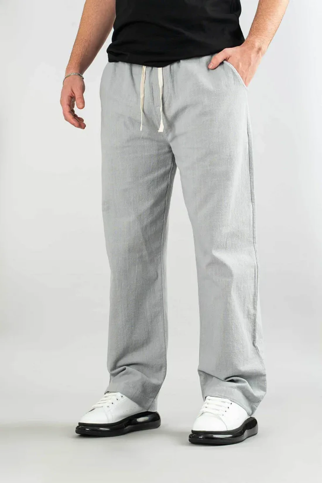 bombe Men's Gray Comfortable Fit Bagy Trousers Linen Belted Drawstring Soft Fabric Blend Trousers