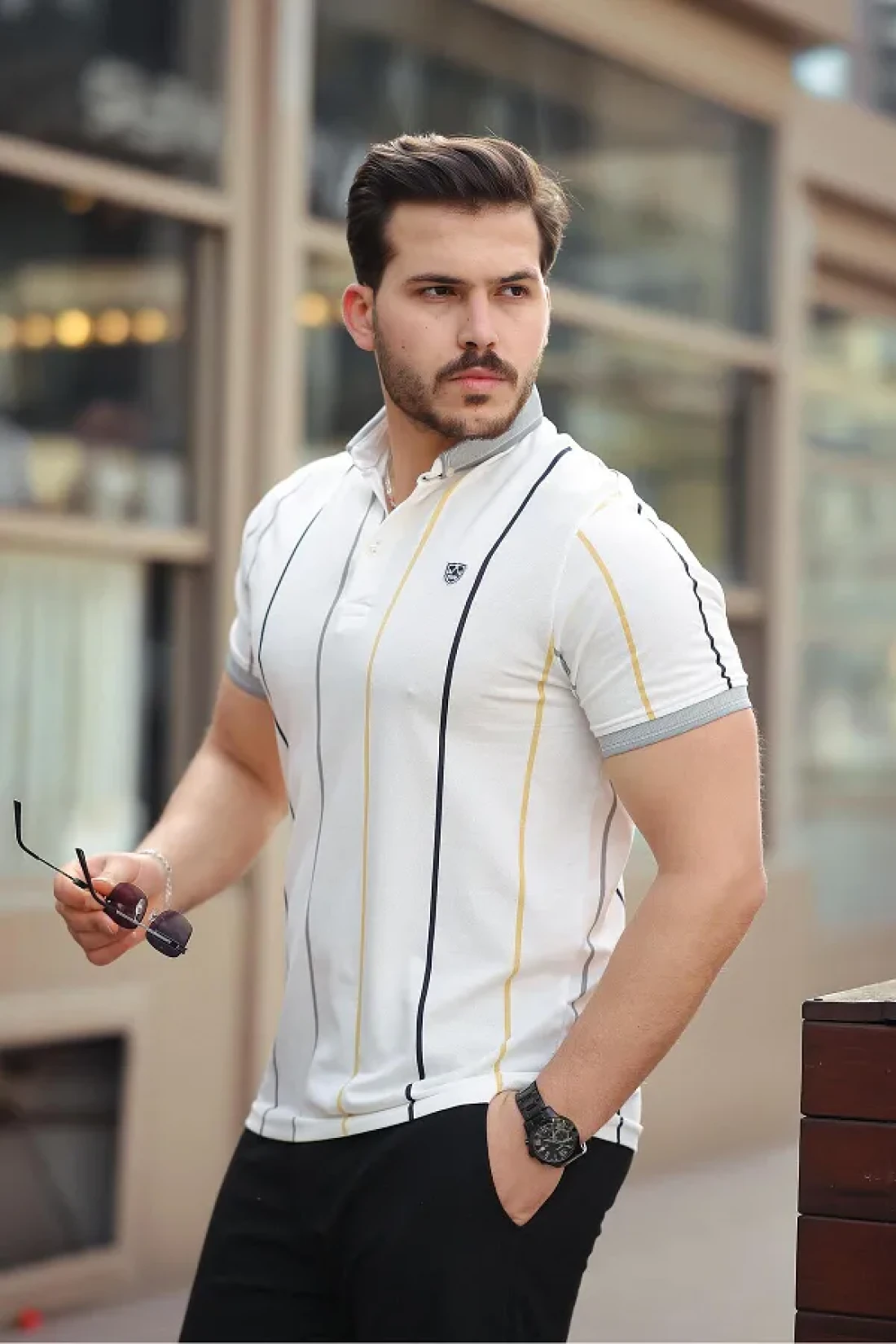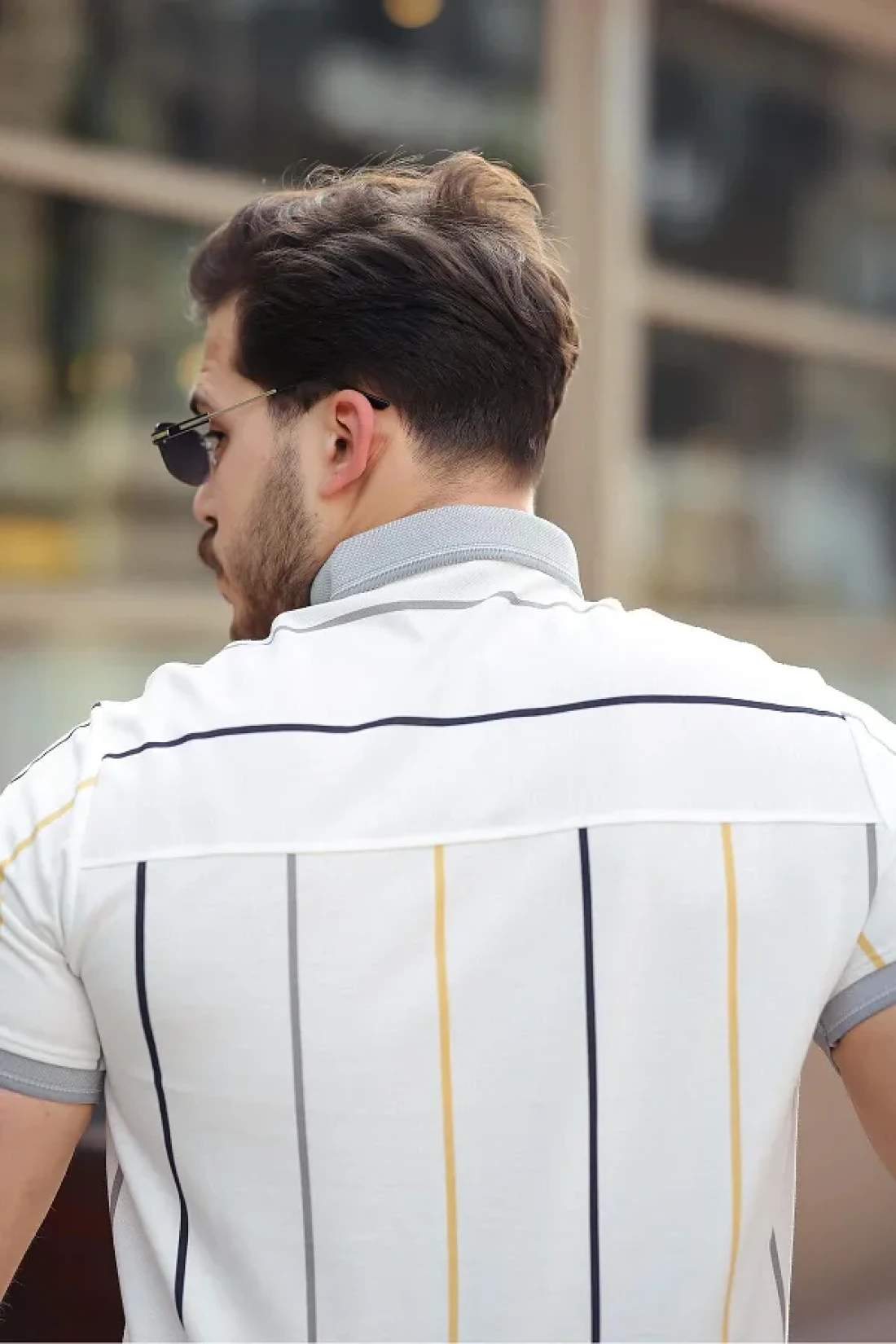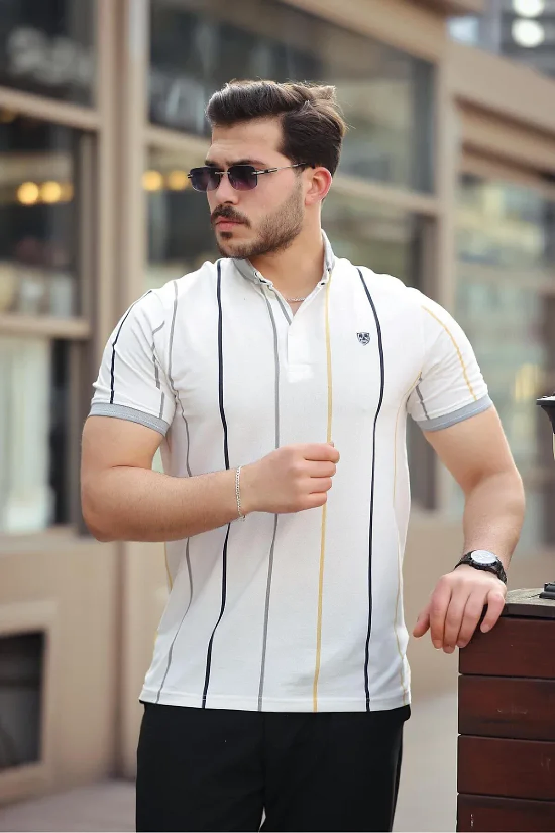 Miron White Vertical Striped Polo Neck Short Sleeve T-Shirt - 2502