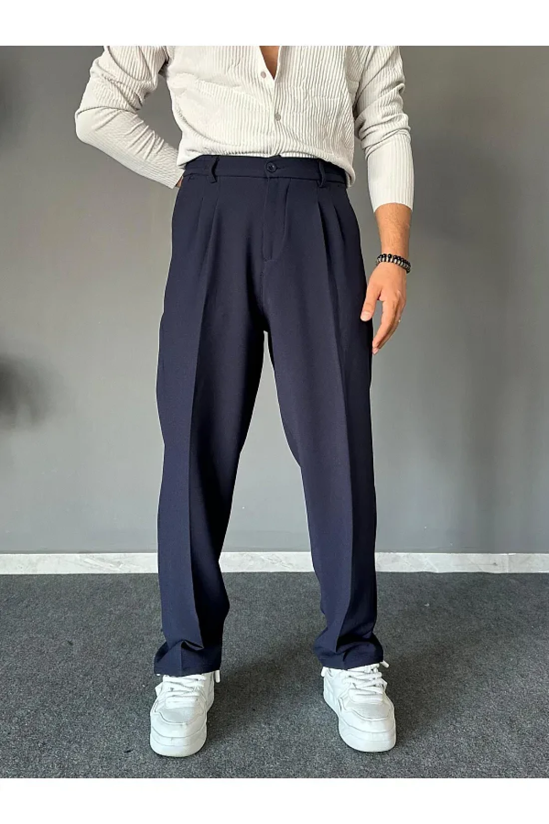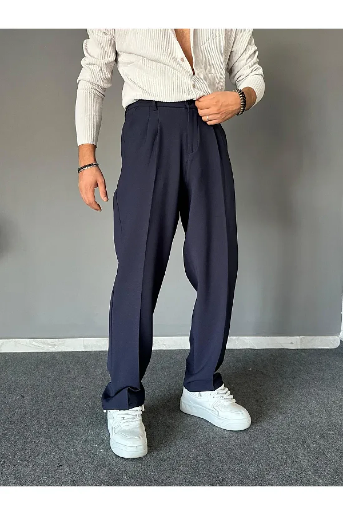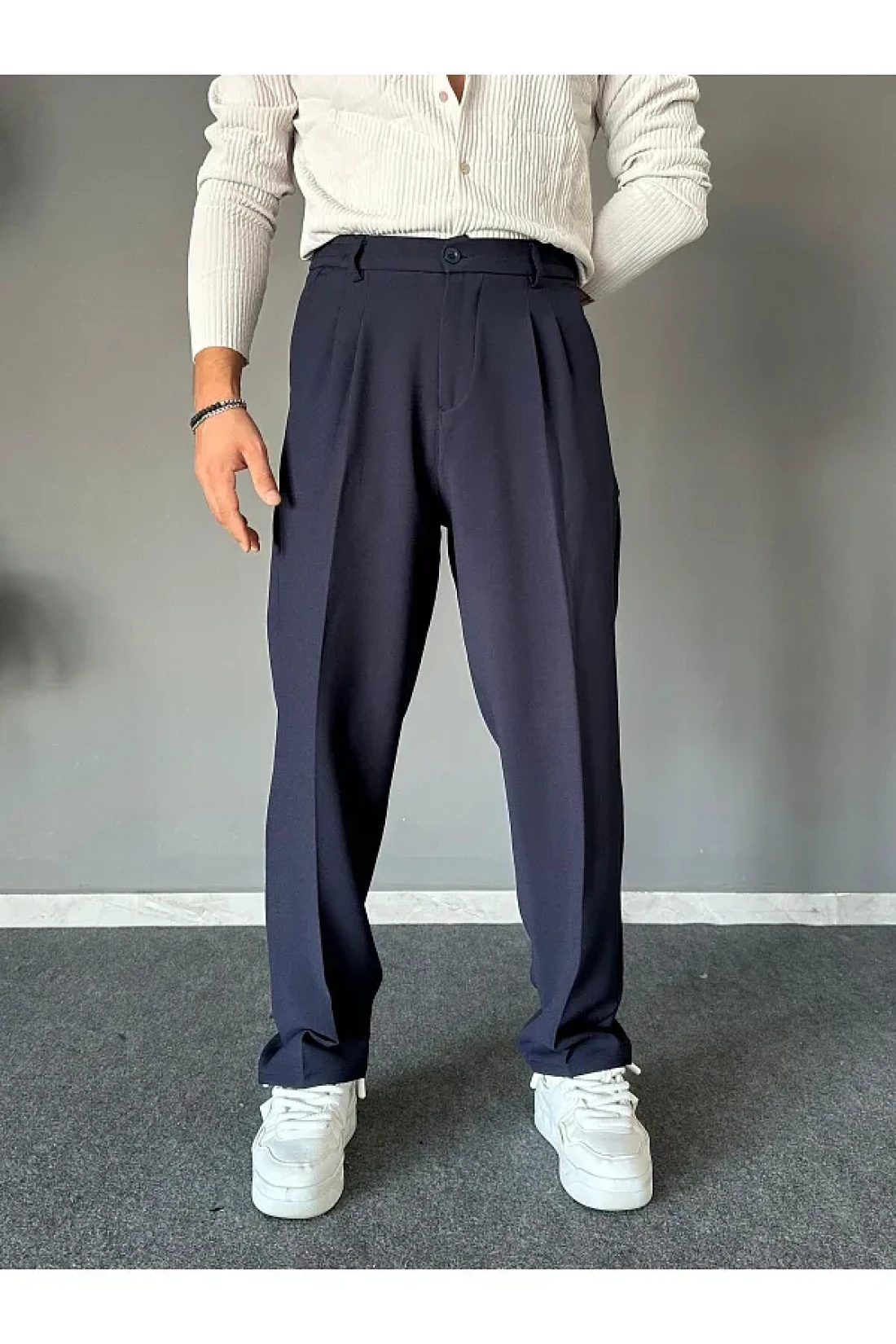 THEMANN Elastic Waist Pleated Navy Blue Baggy Fit Trousers