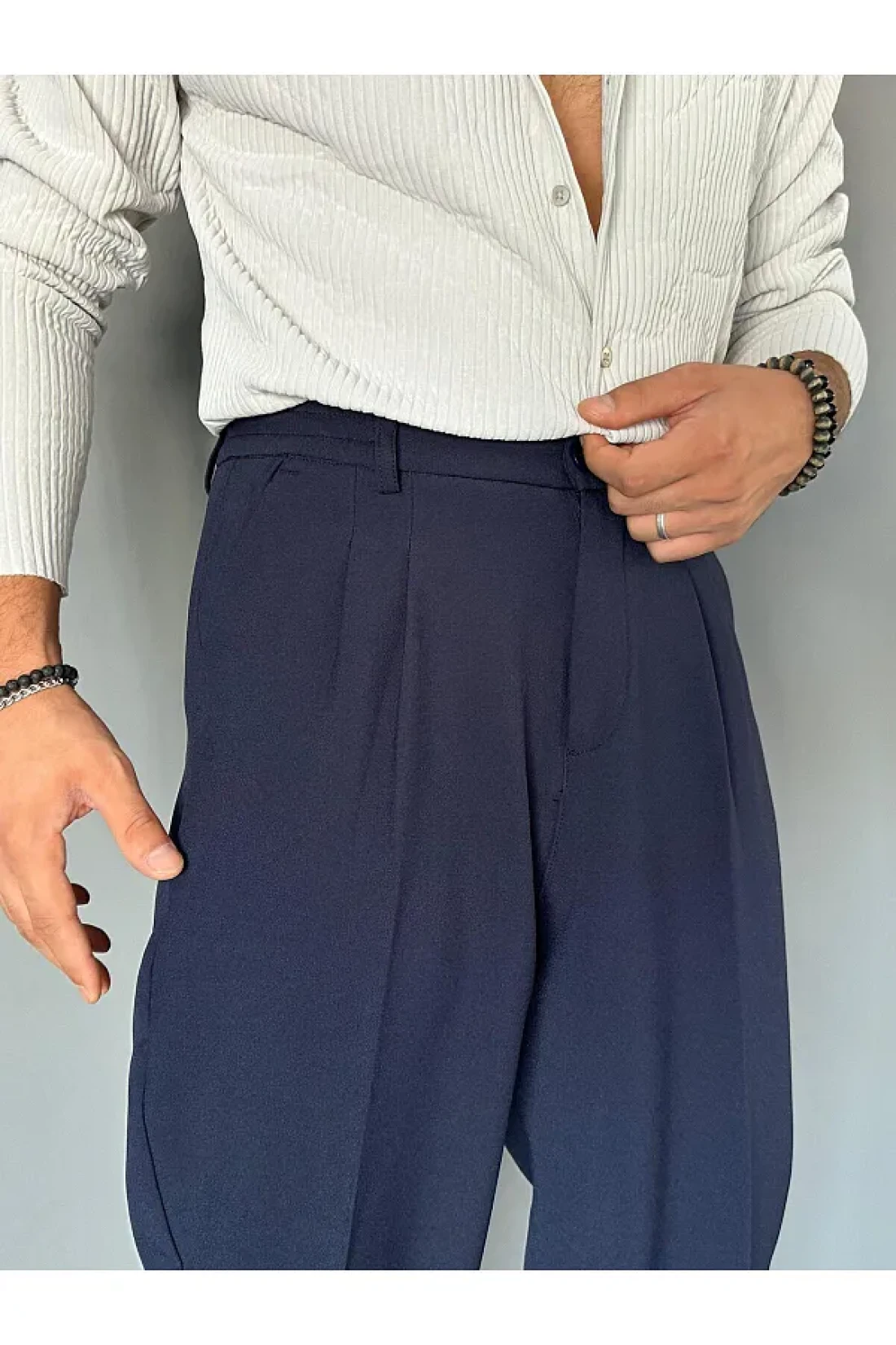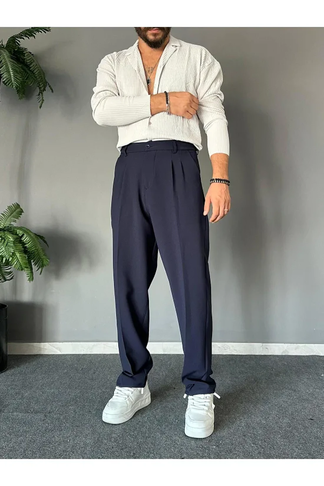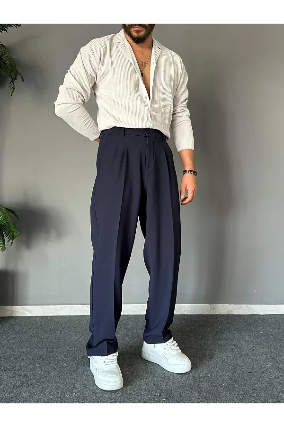 THEMANN Elastic Waist Pleated Navy Blue Baggy Fit Trousers