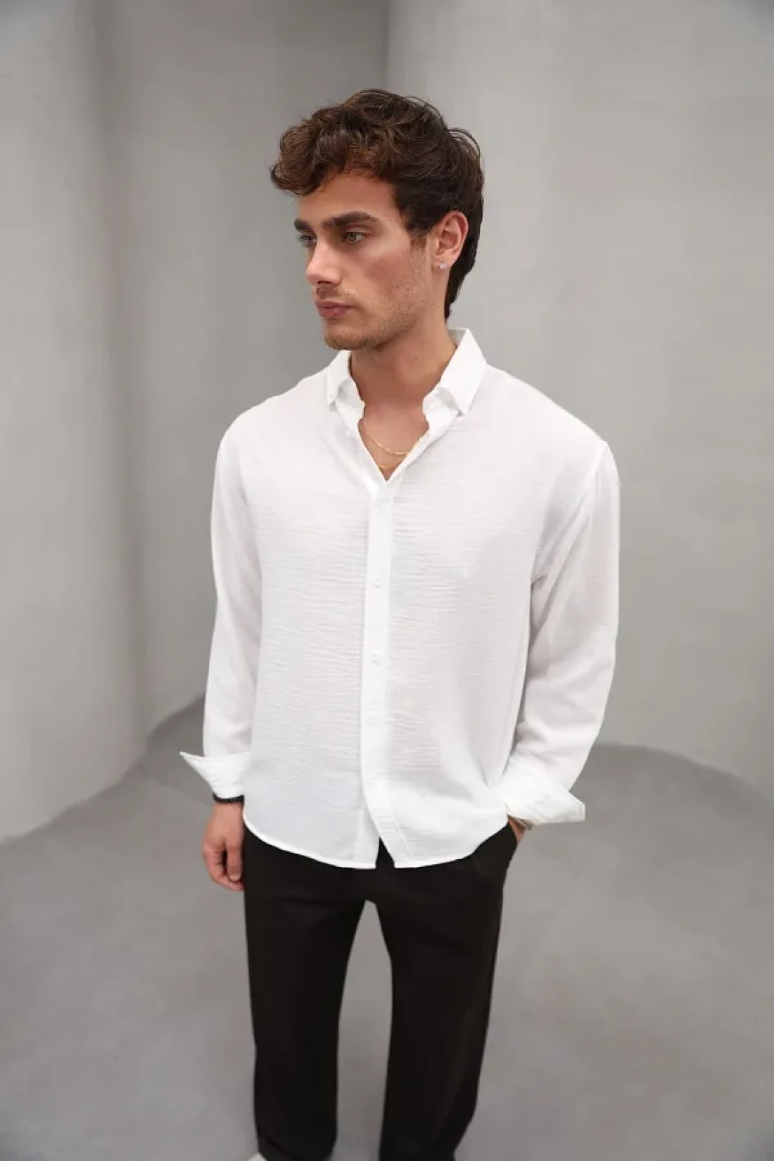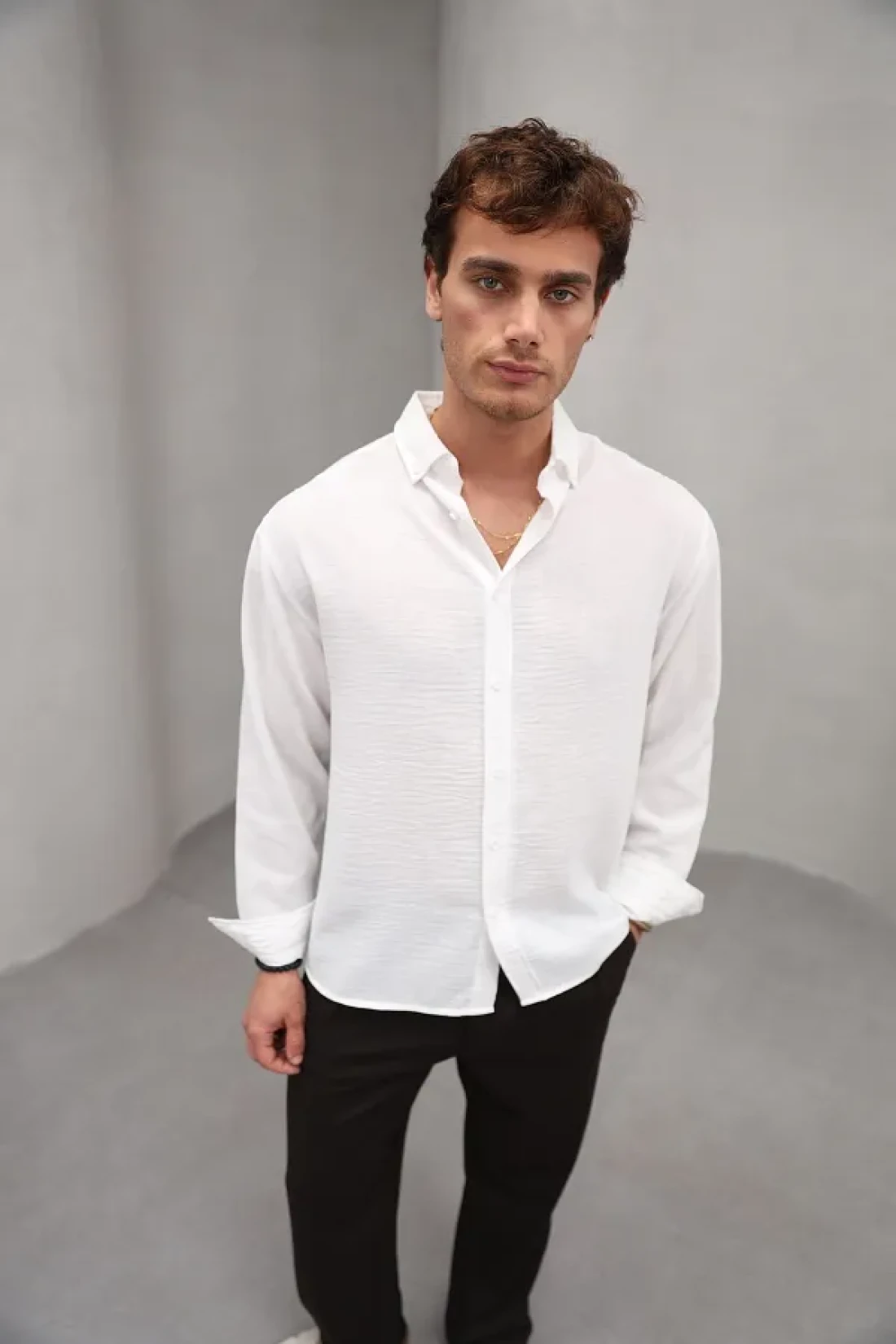 The linen-textured long-sleeved white shirt, which is indispensable for summer months, offers comfortable use with its cool structure. Thanks to its 100% polyamide material, it is durable and long-lasting. It can be easily put on and taken off with its practical button closure feature