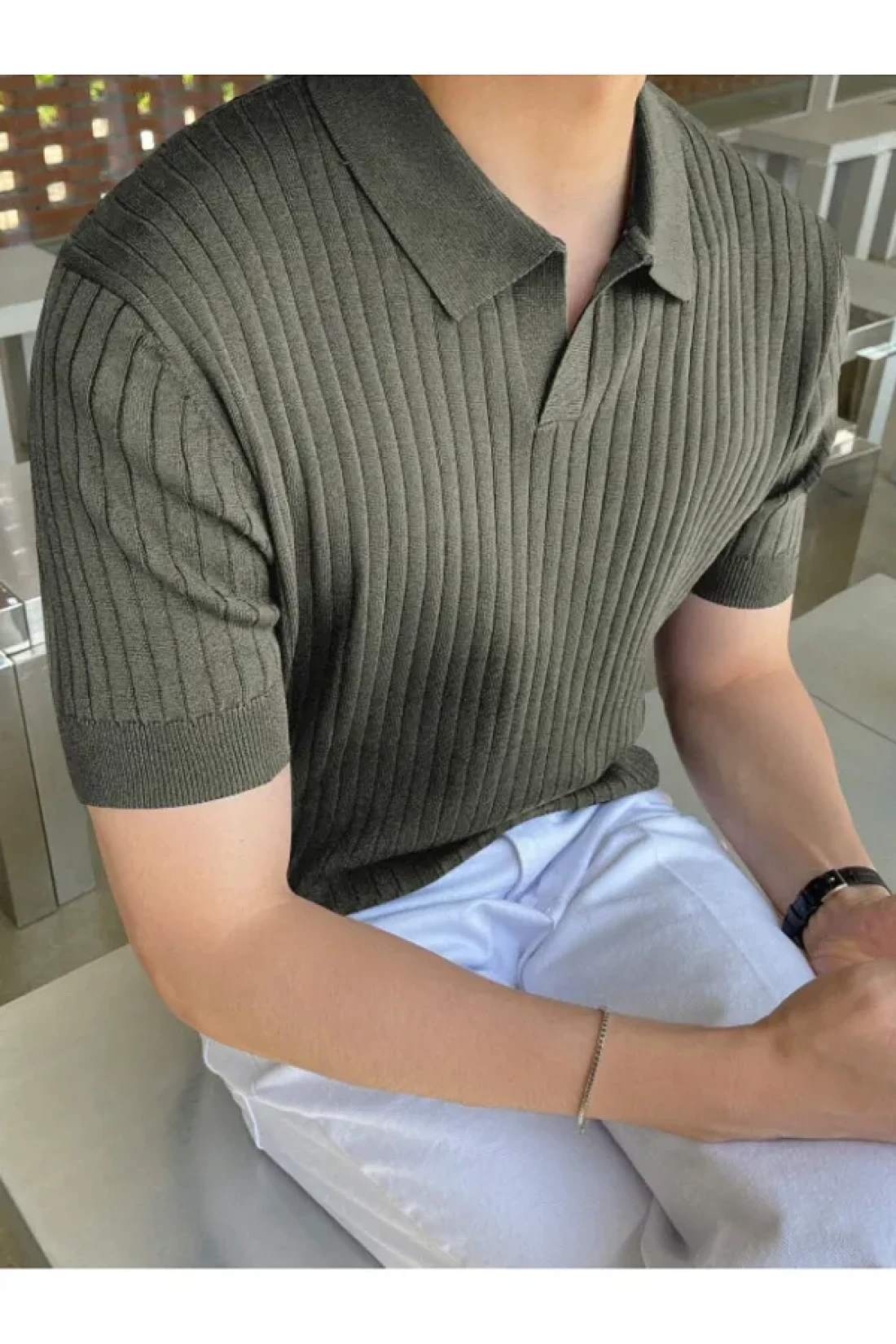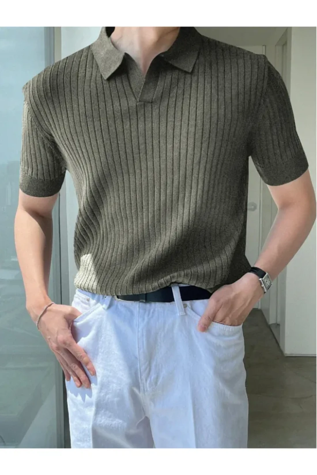 Tarz Cool Khaki Men's Ribbed Polo Collar Knitwear T-Shirt