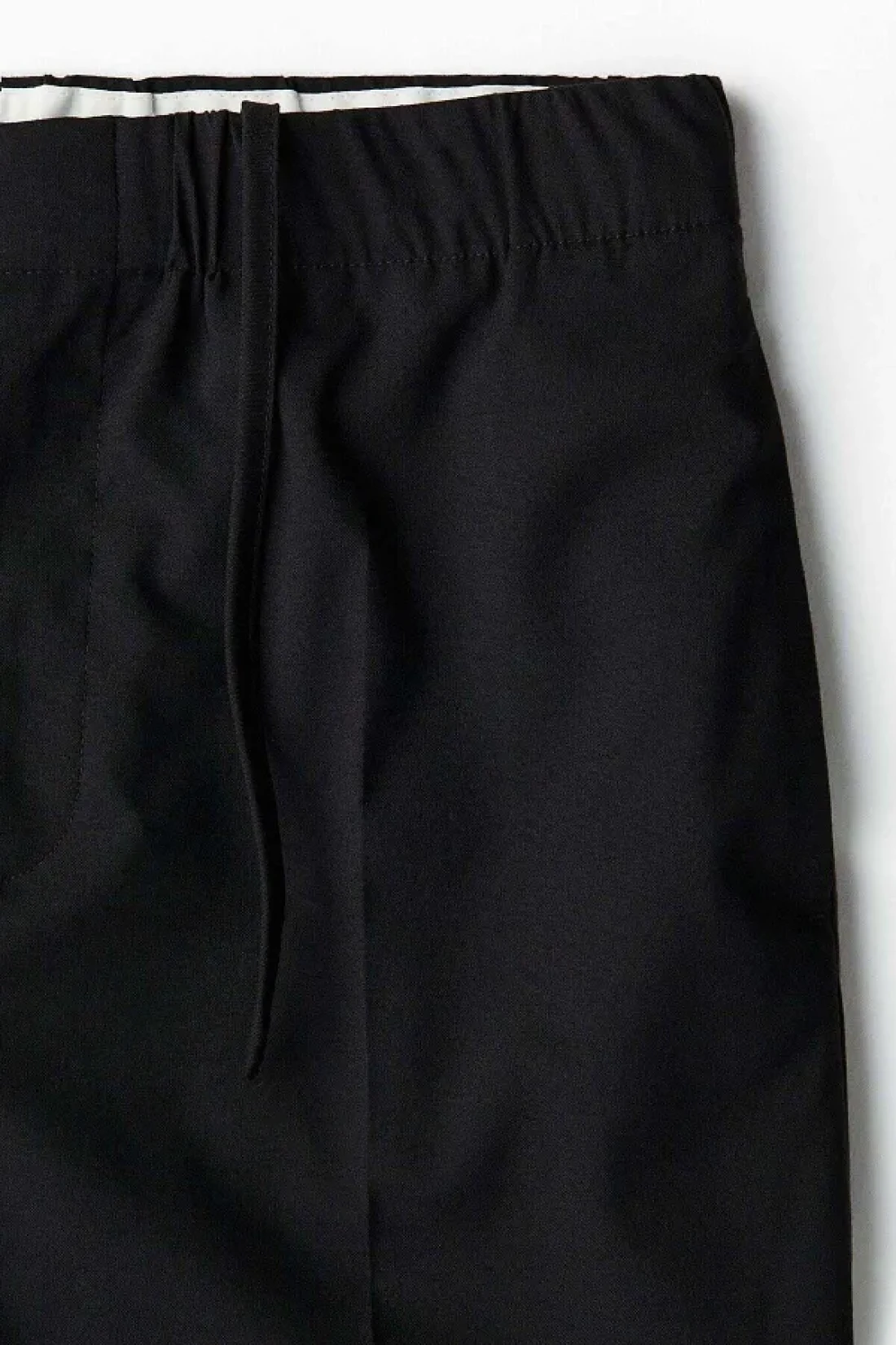 Trousers in a soft weave with covered elastication and a concealed drawstring at the waist, a zip fly and a waistband with a hook-and-bar fastener and a button.