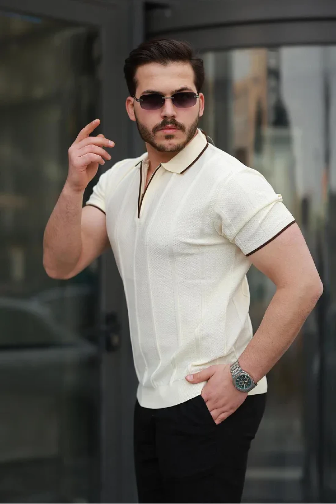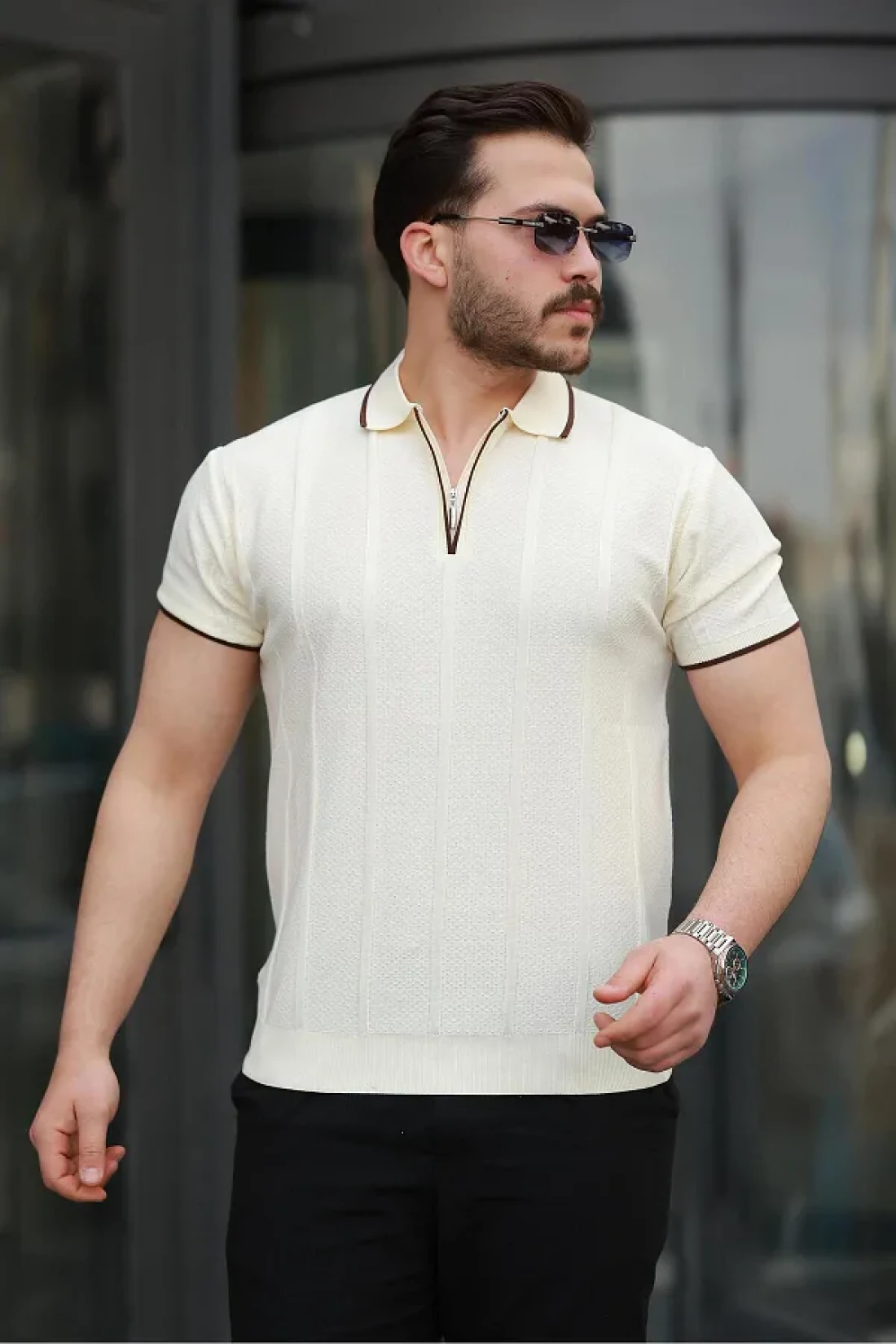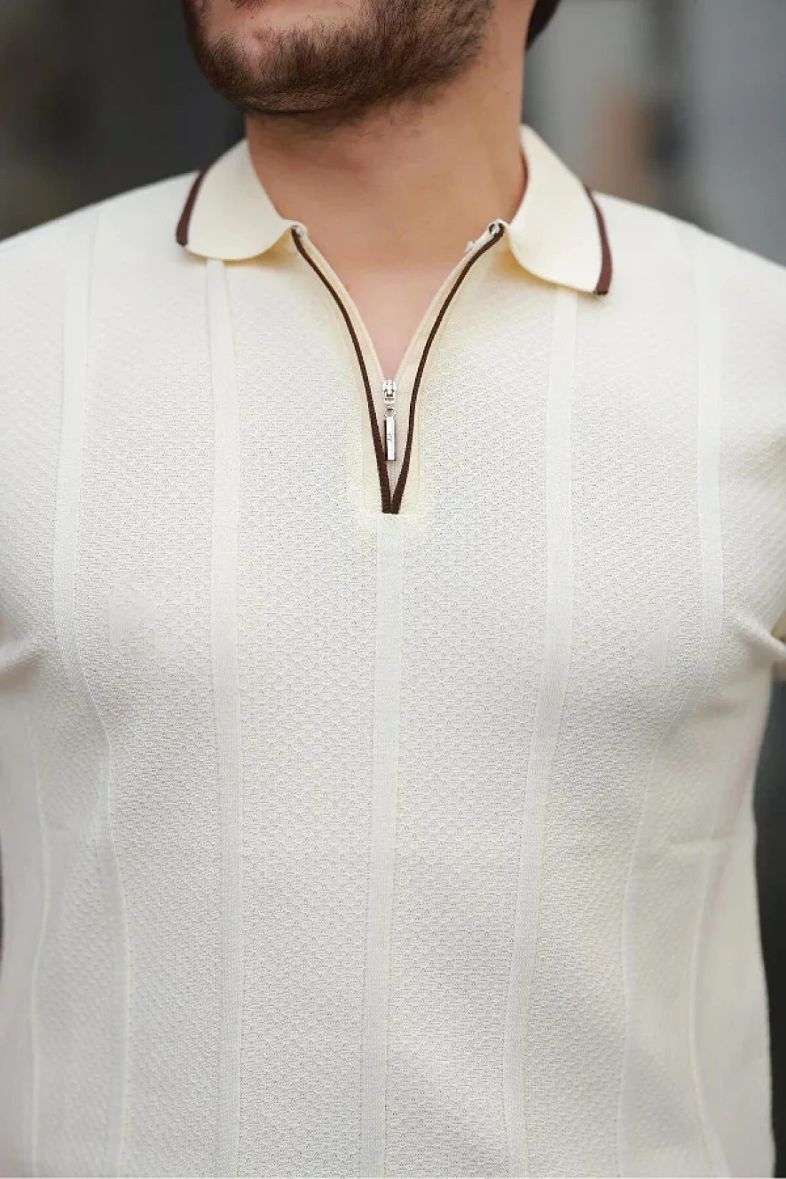 Miron Ecru Honeycomb Textured Zippered Polo Neck Knitwear Short Sleeve T-Shirt 2511
