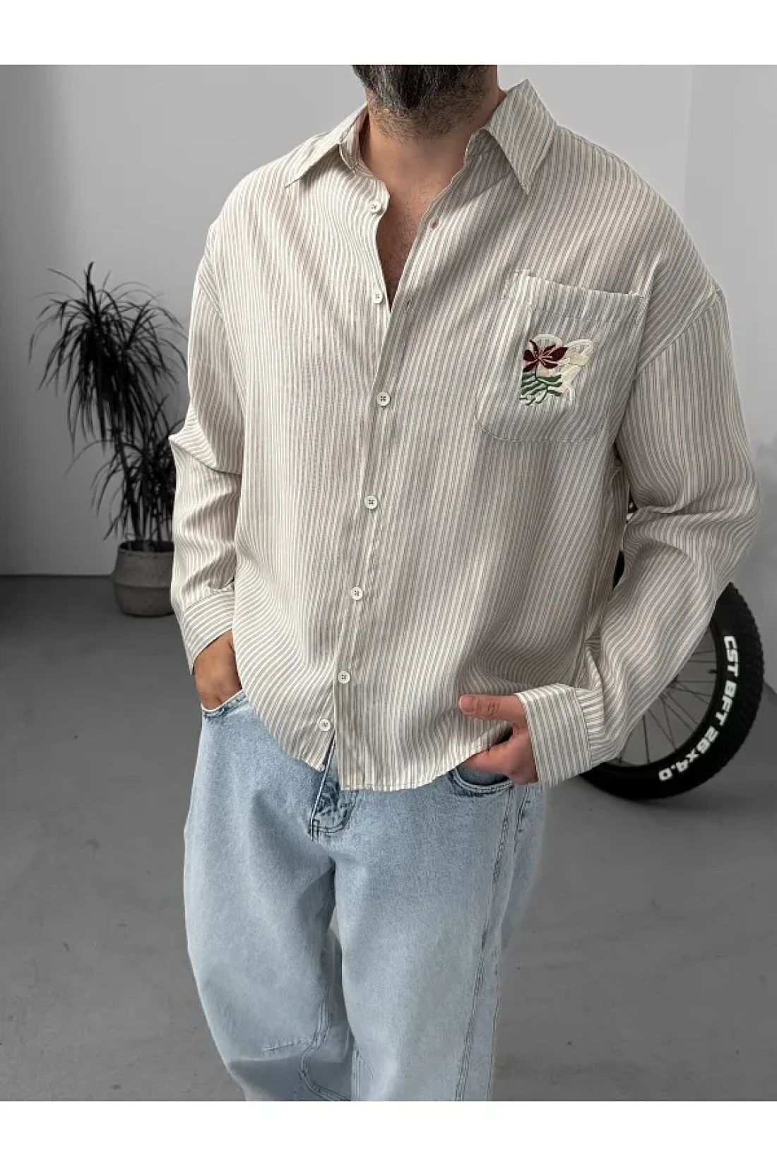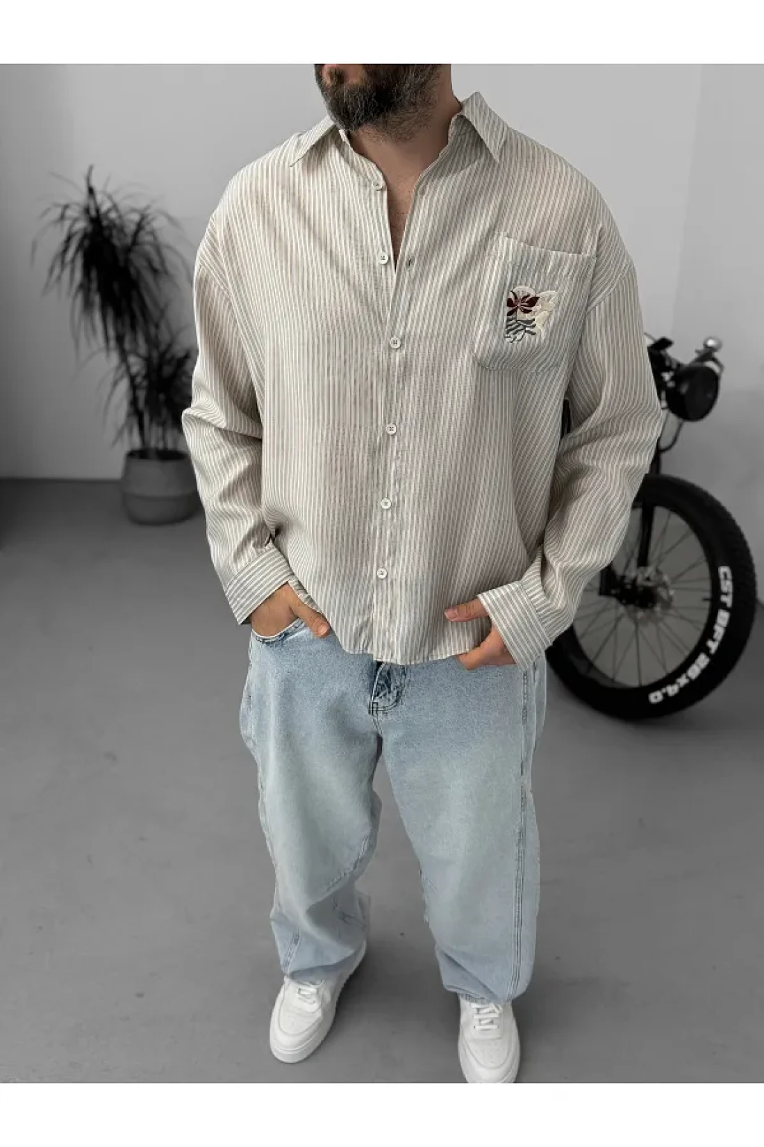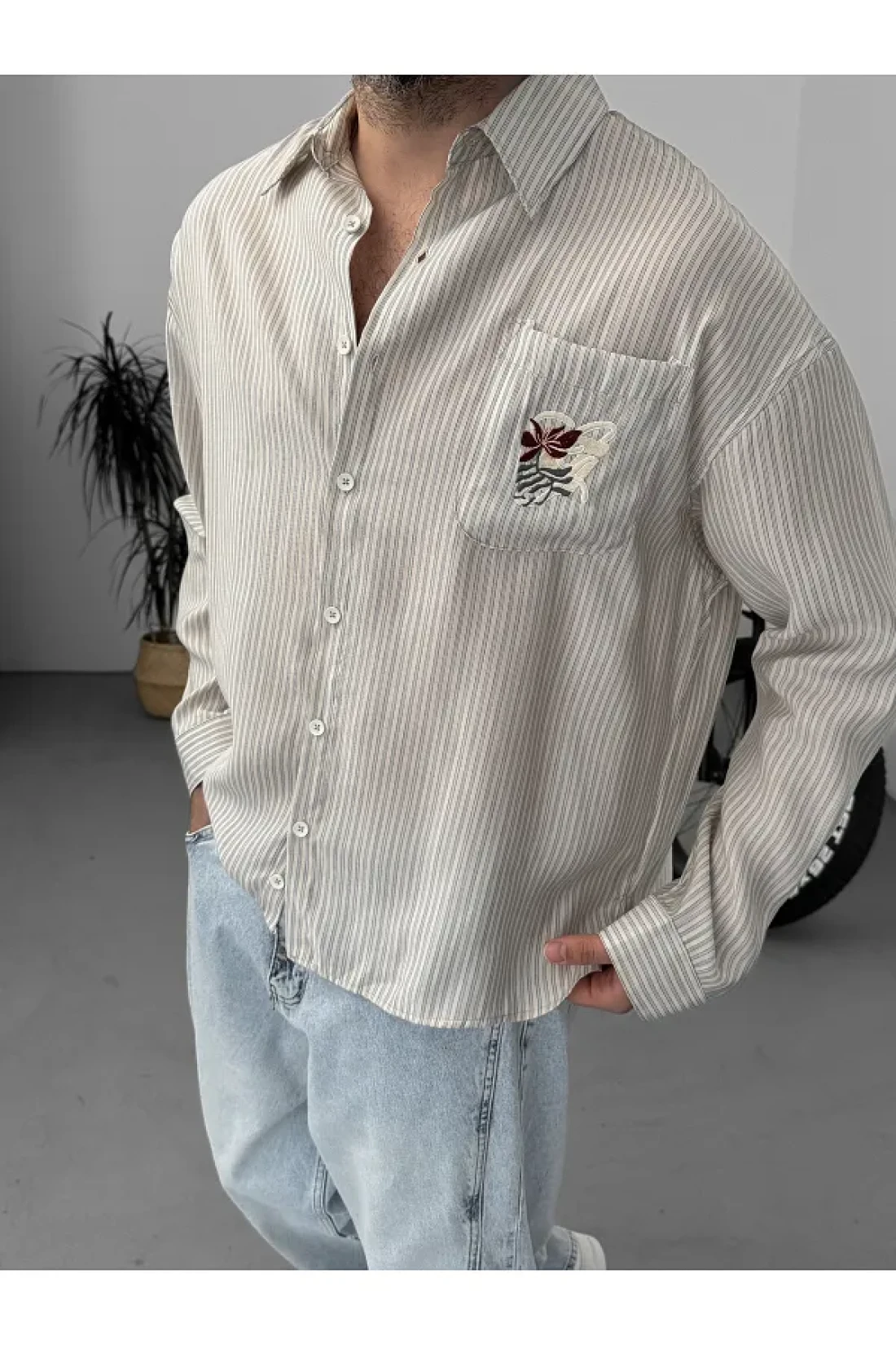 BYBASICMAN Beige Striped Pocket Embroidered Shirt G-5612/1