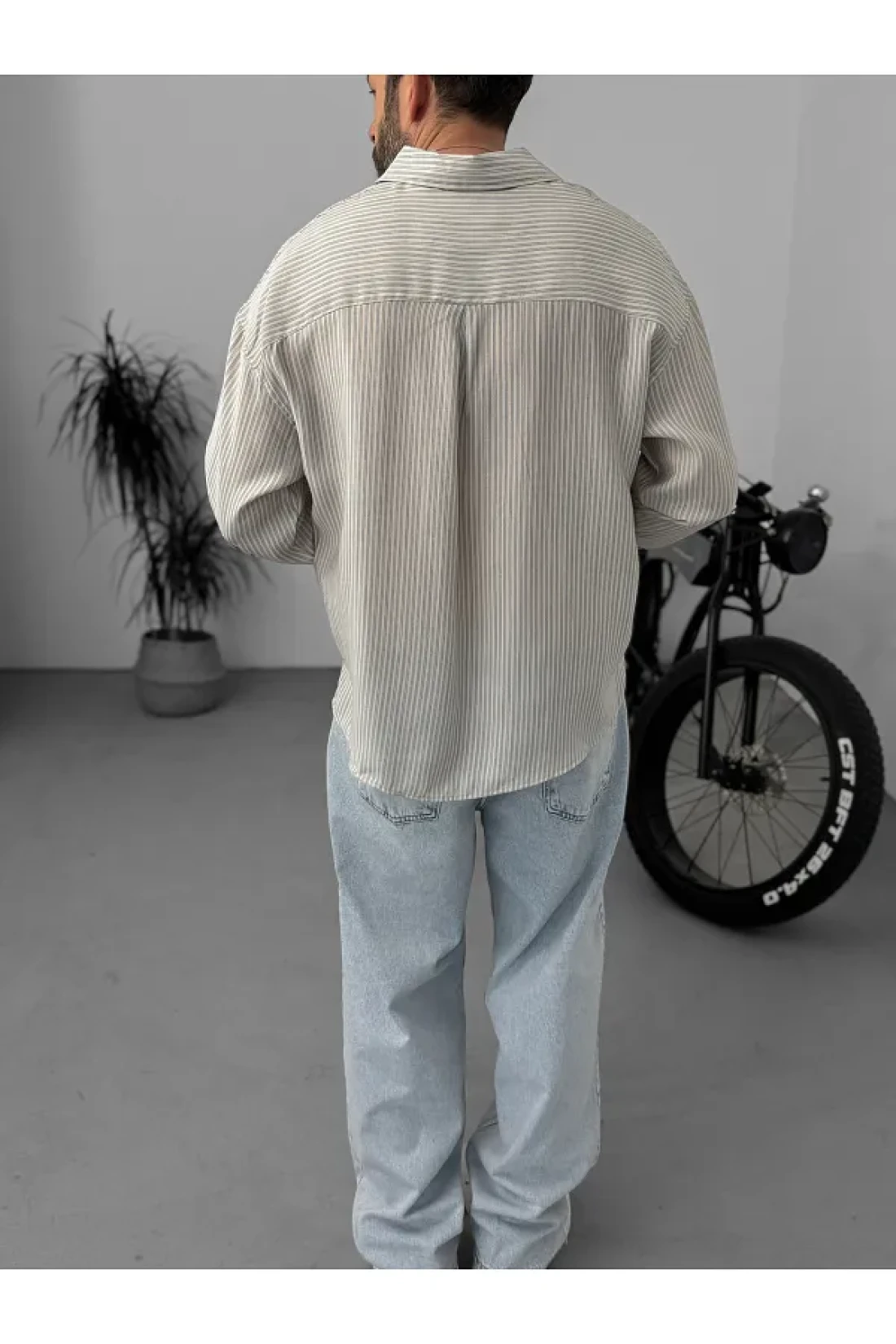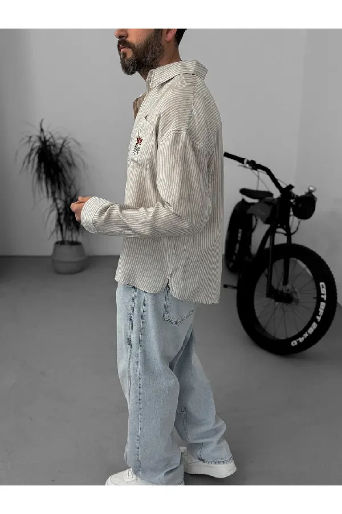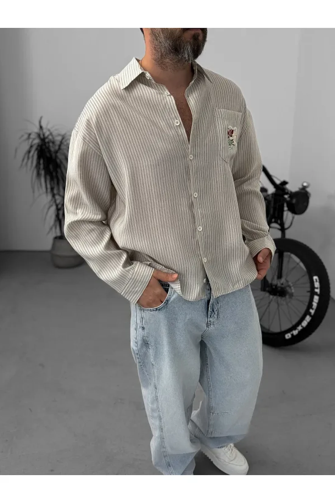 BYBASICMAN Beige Striped Pocket Embroidered Shirt G-5612/1
