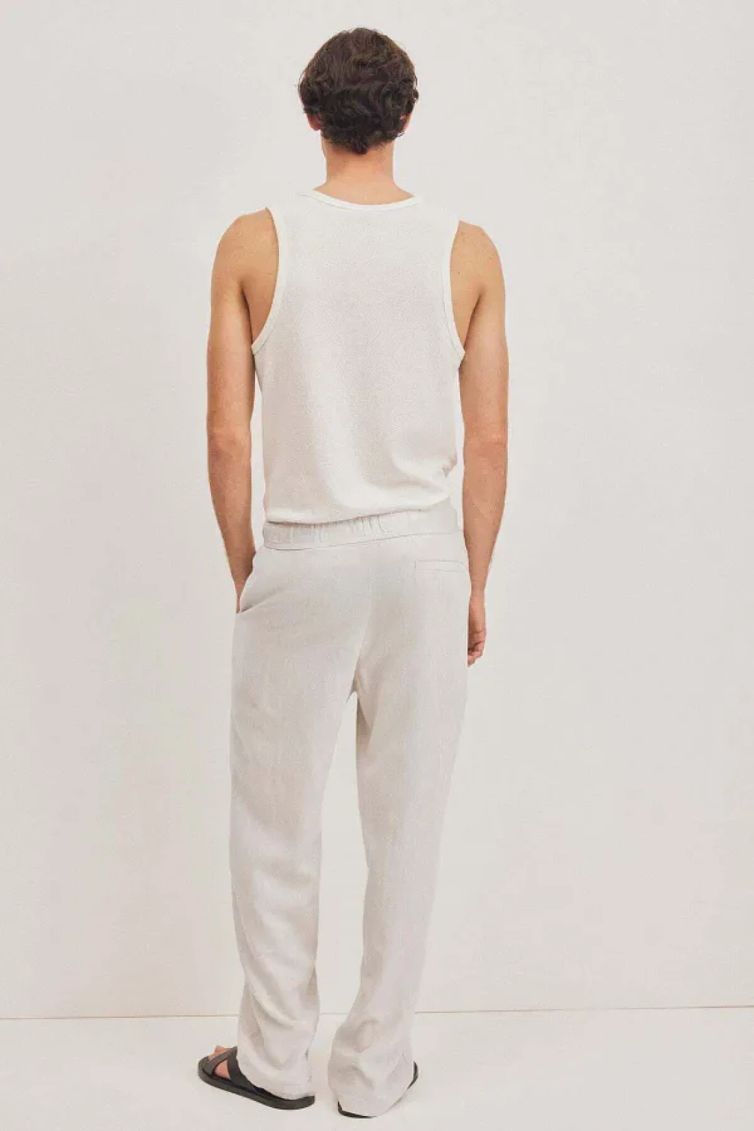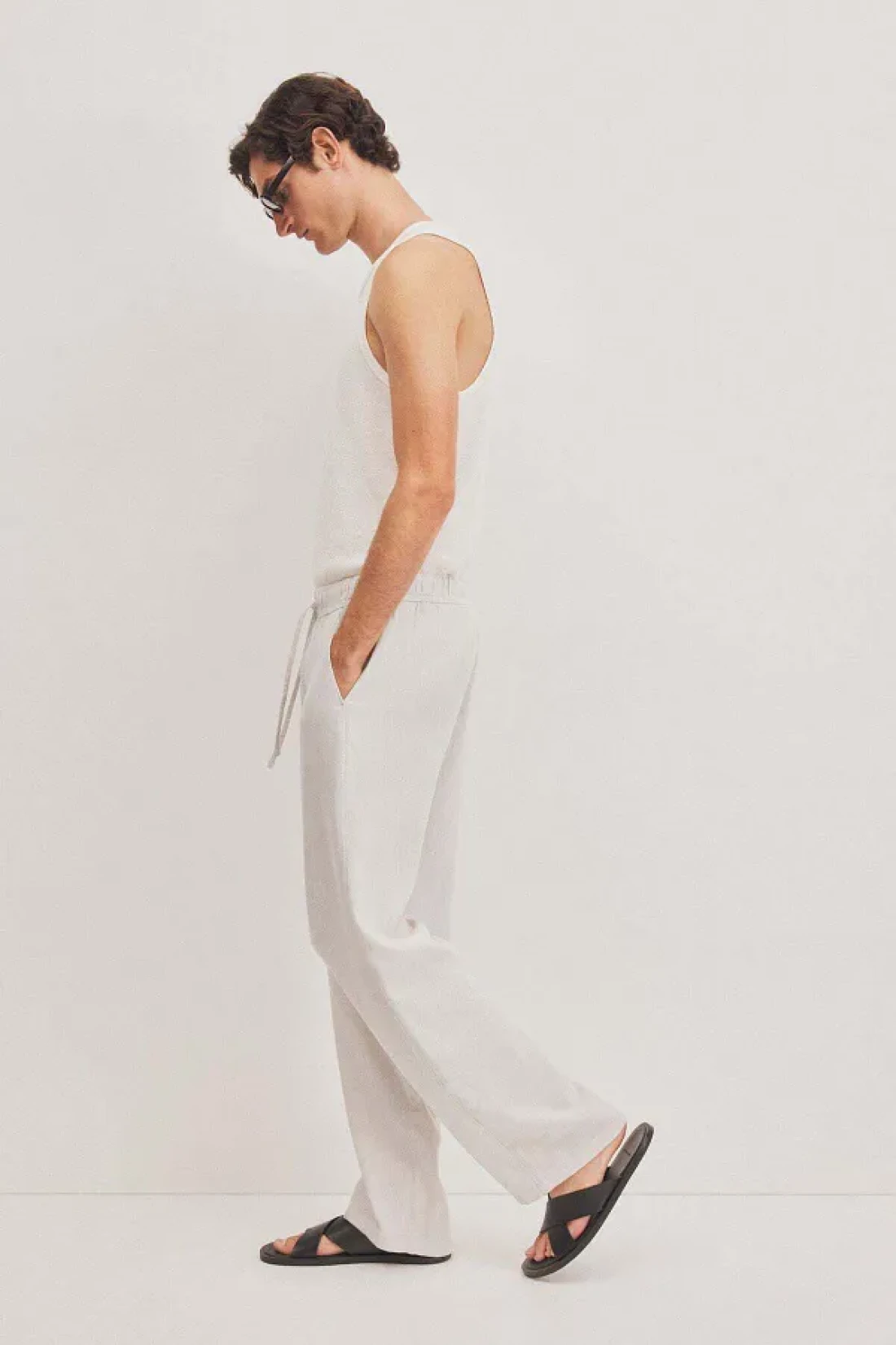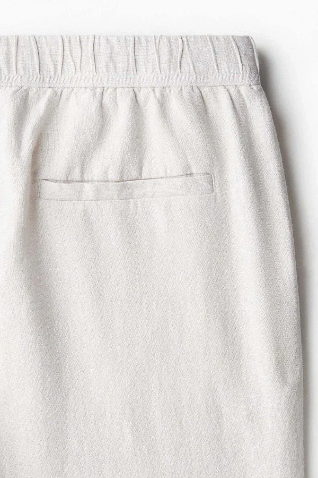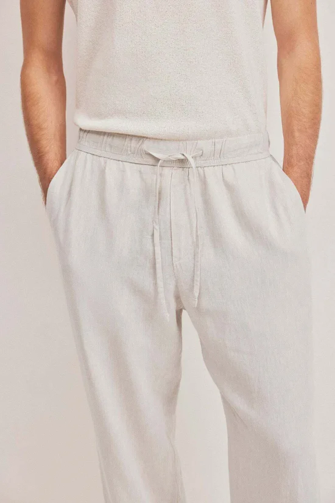 Trousers in a soft weave made from a viscose and linen blend with covered elastication and a drawstring at the waist, a fake fly, diagonal side pockets and a welt back pocket.