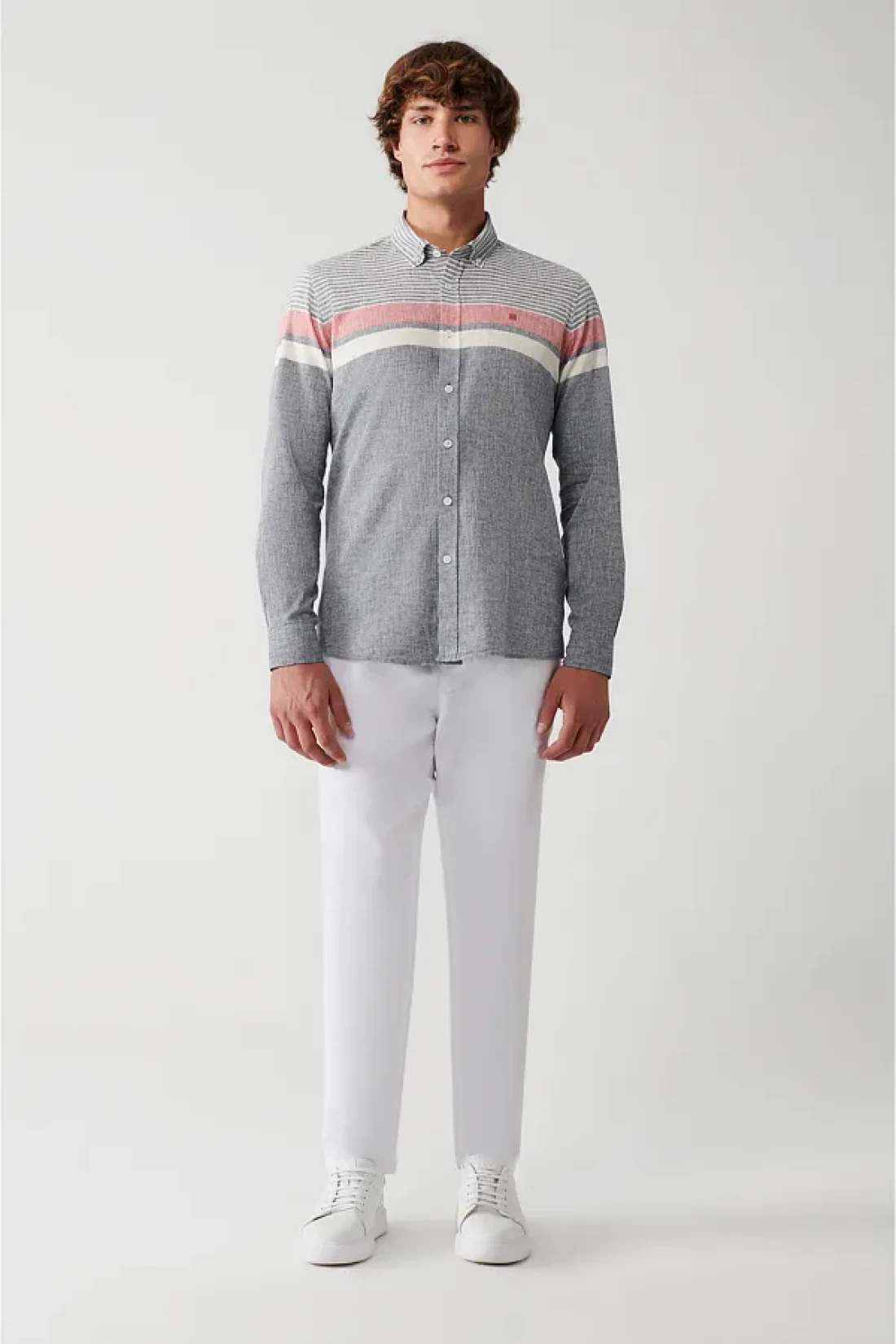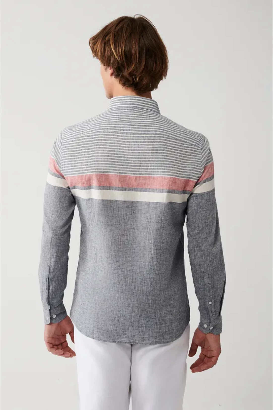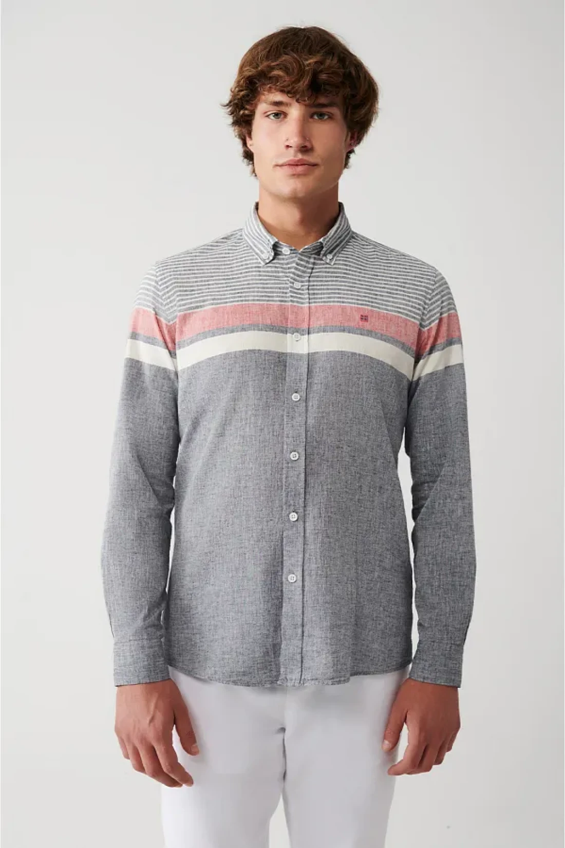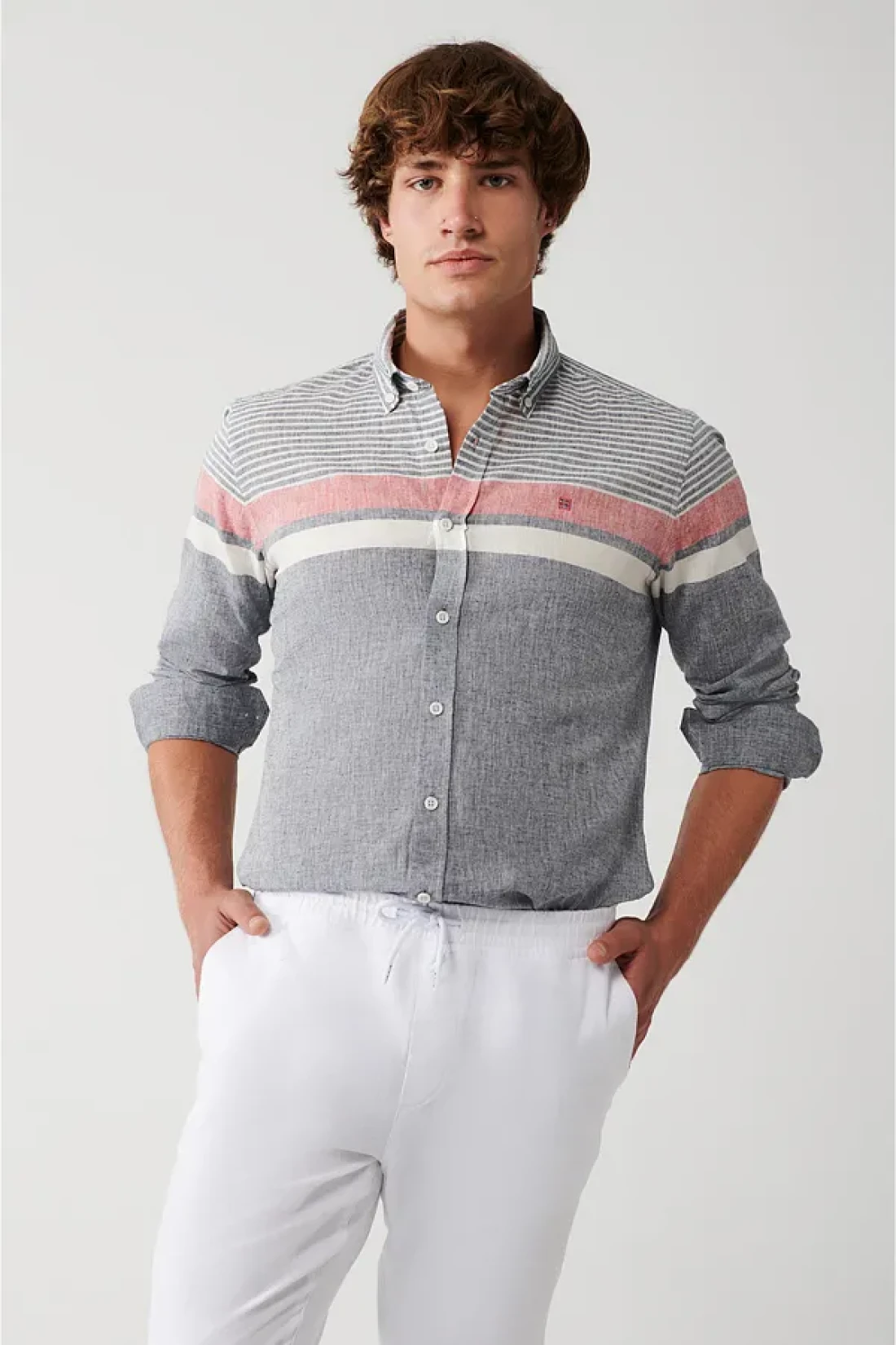 Cotton linen blend, buttoned collar, striped color block, slim fit narrow cut shirt