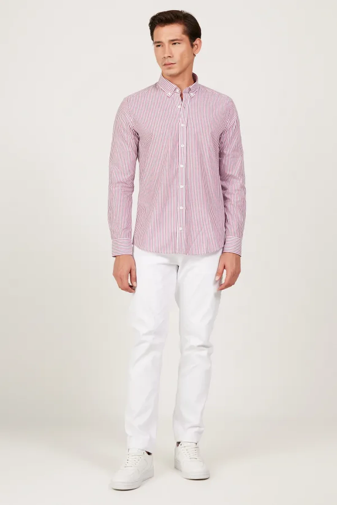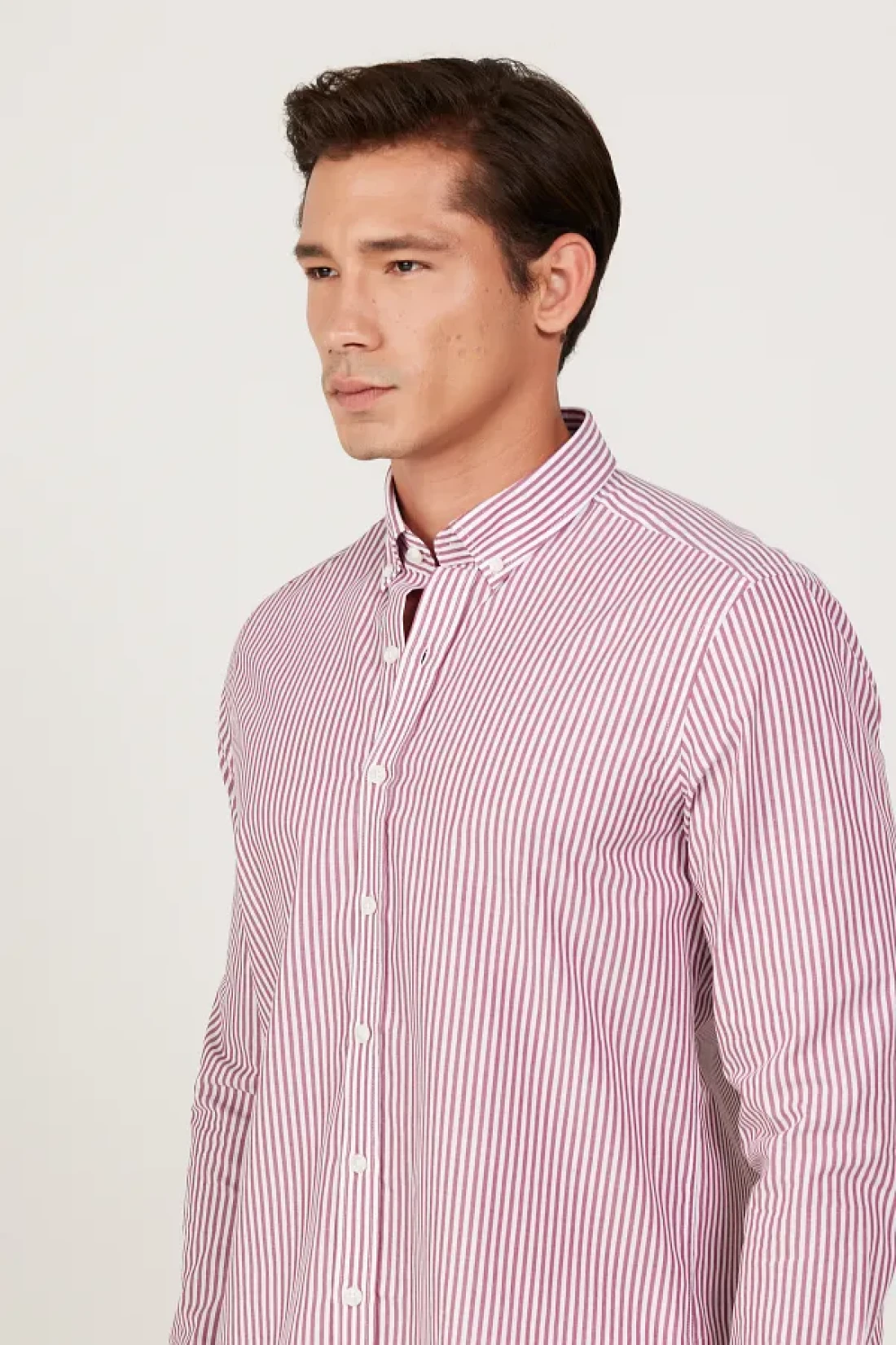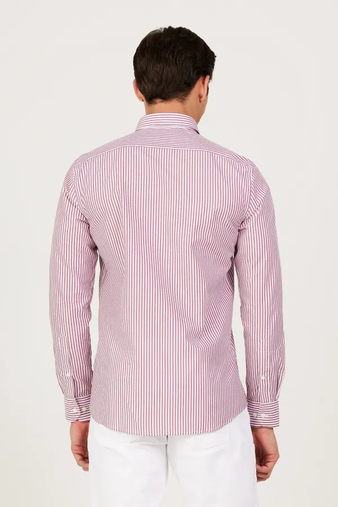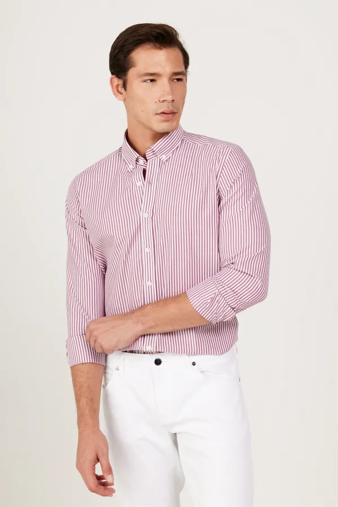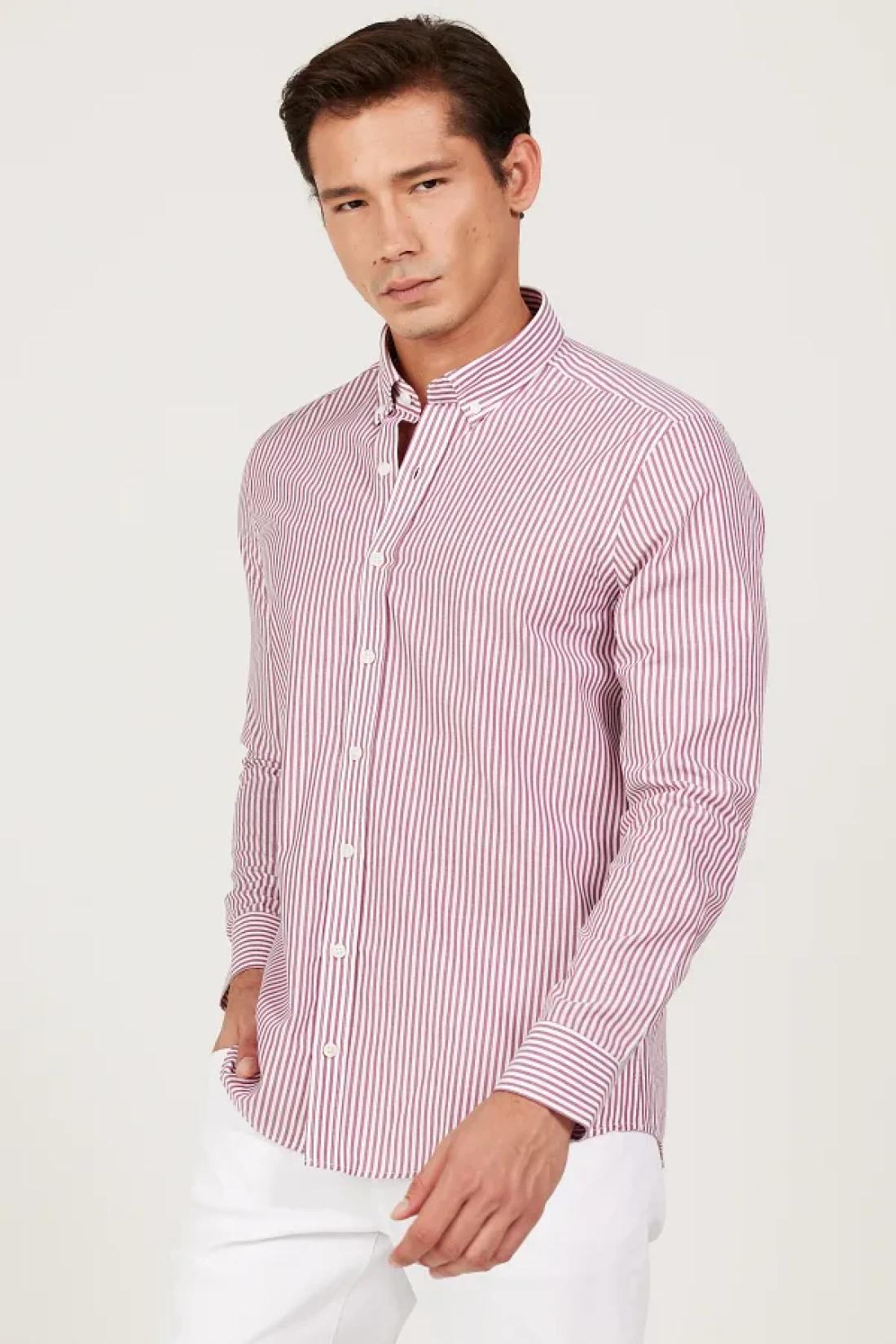 60% cotton, 40% polyester, striped white-burgundy, Slim Fit , long sleeve, buttoned collar, summer collection, no pocket, altınyıldız collectıon / acco Slim Fit slim fit buttoned collar cotton striped yarn dyed shirt, product size: l, model information: height: 1. 89cm, weight: 80kg, product code: 4a2023200225byd.
