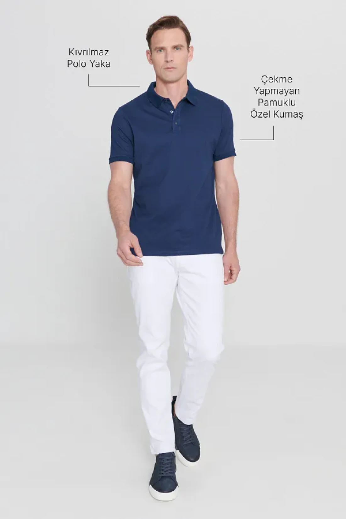 55% cotton, 45% polyester, plain navy-navy, casual model, slim fit, non-curling Polo neck, short sleeve, no pockets, summer collection, ac basics slim fit no curling Polo collar t-shirt, Product size: m, model measurements: height: 1.89cm, weight: 80kg, Product code: 4a 4820200047 Laa. Washing Instructions: Machine washing water temperature should not exceed 40 degrees. Sensitive dry cleaning can be done. No bleach. Dry by Spreading. It should be ironed at low temperature. It is not squeezable in a centrifugal machine.