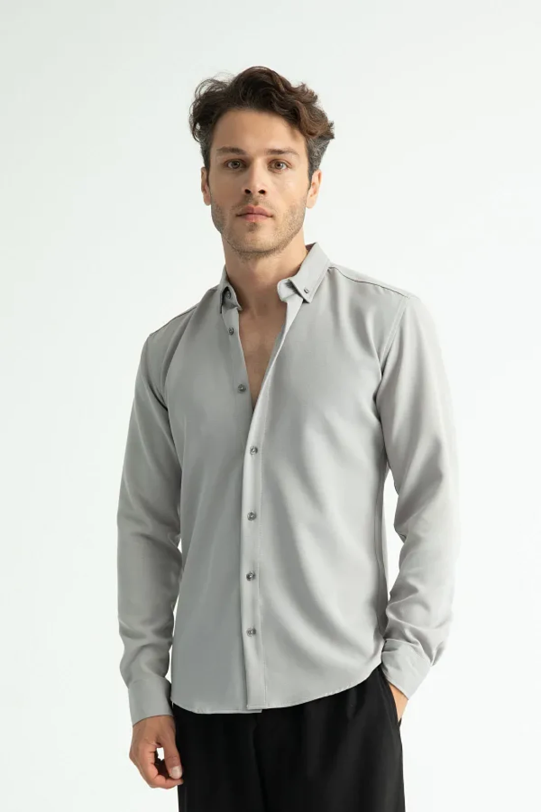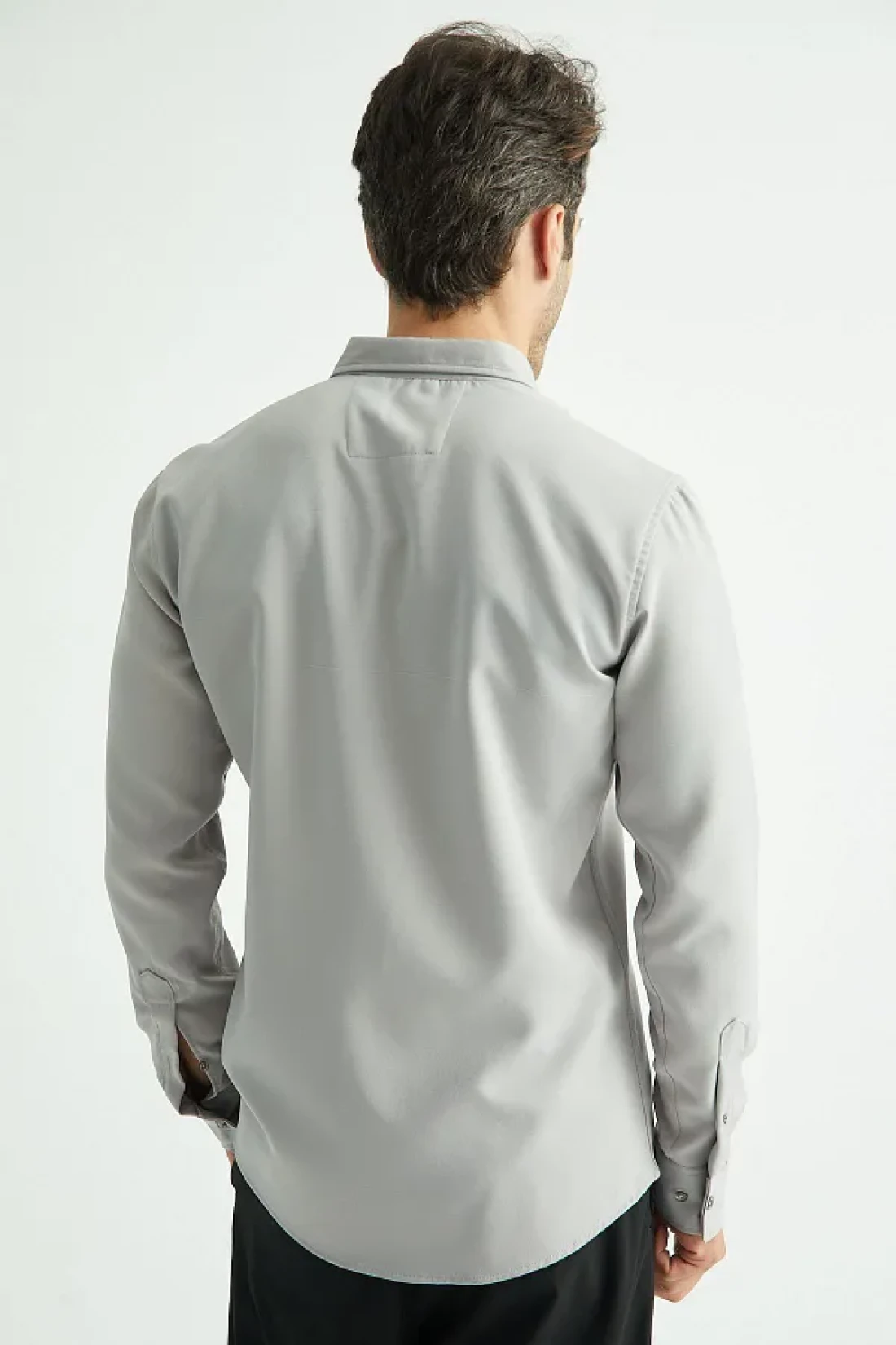 the long sleeve design offers ideal comfort during seasonal transitions, while the smoked color adds suitability for any environment. With its regular cut, it has a structure that hugs the body but does not squeeze, allowing for comfortable movement throughout the day. It combines the classic shirt look with modern touches using natural button details. The buttoned closure style provides practical use while not compromising its elegance.