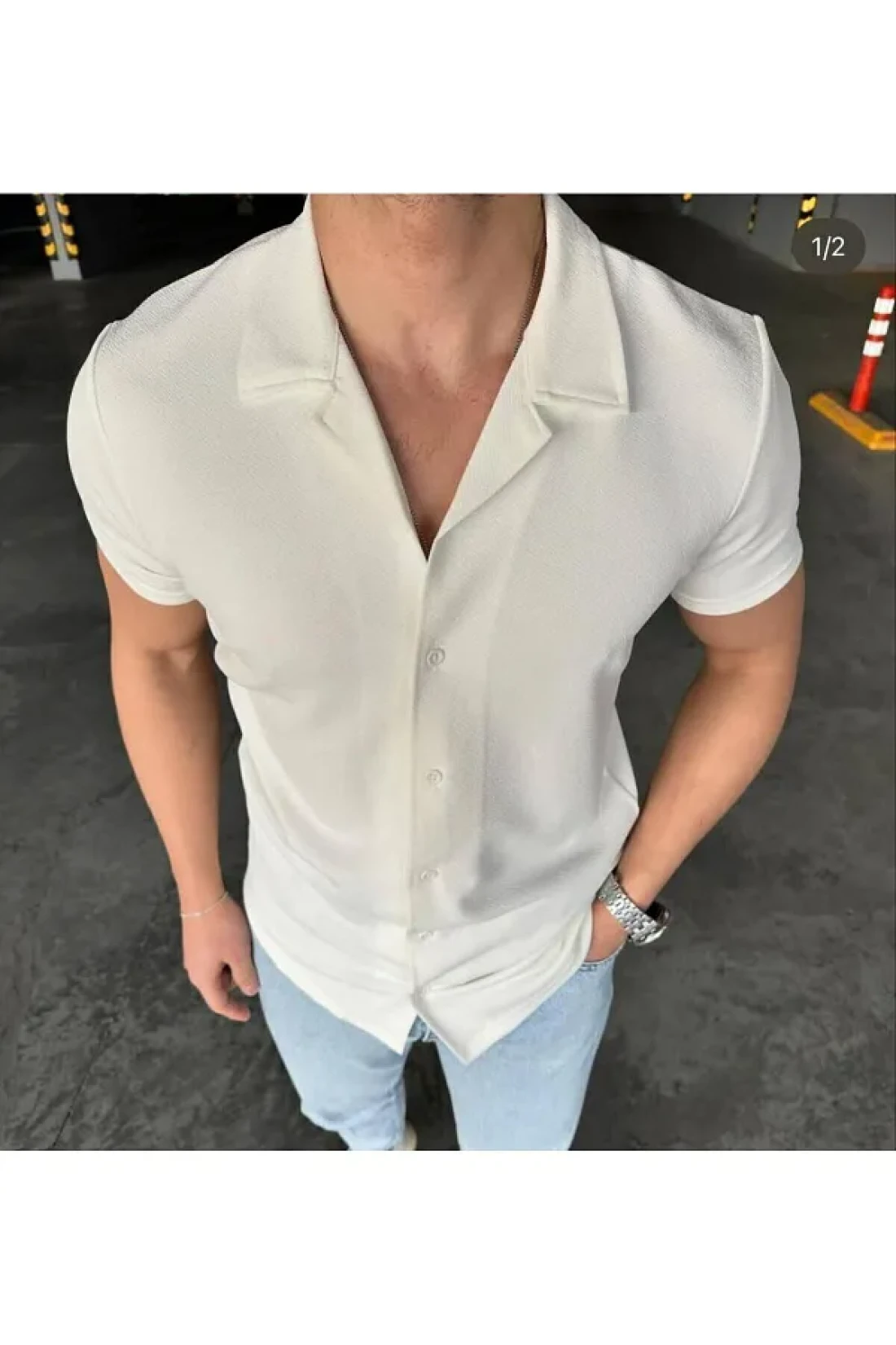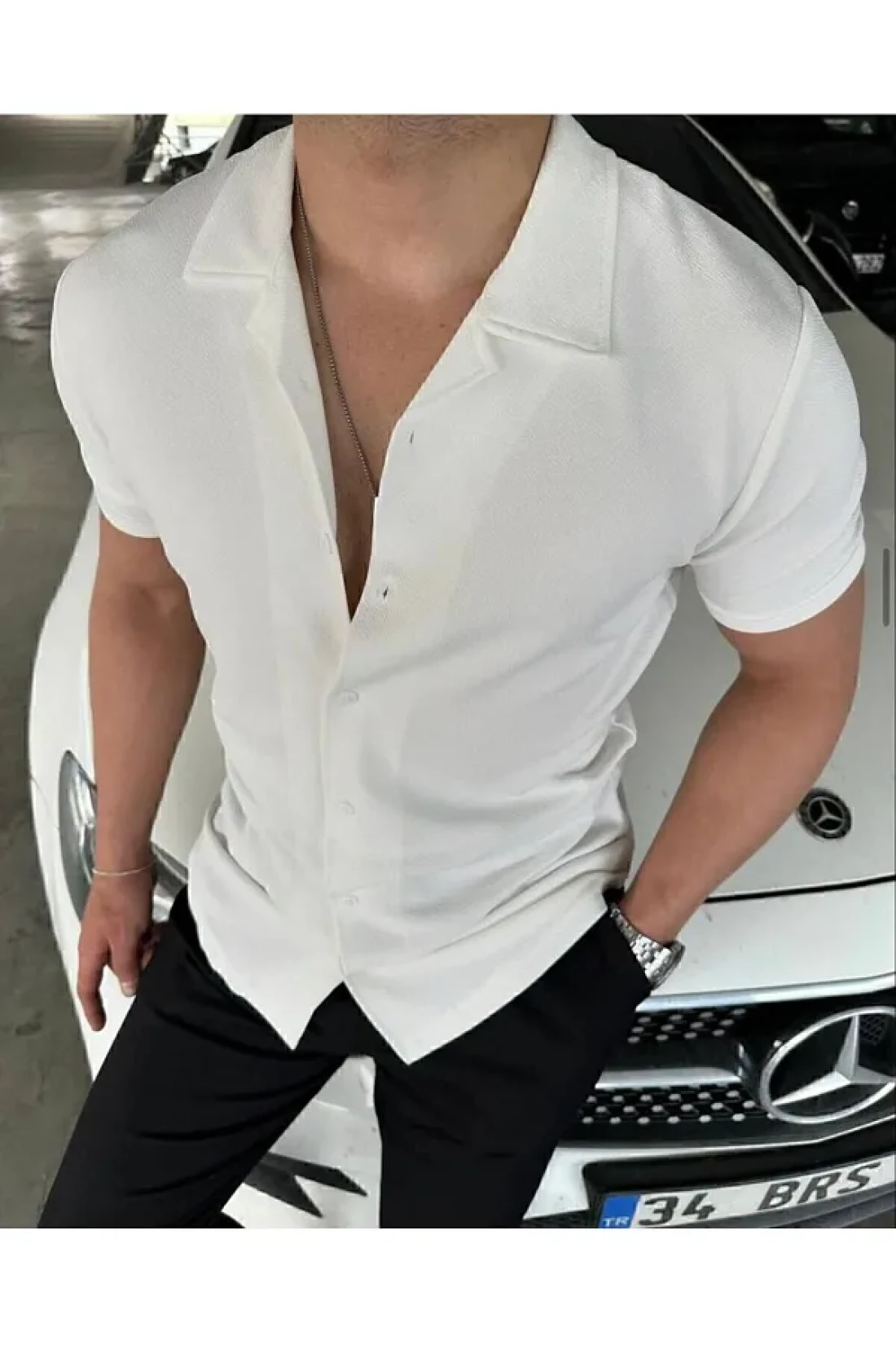 Men's white apaj collar short sleeve shirt fabric zara crepe width Stretch Fabric comfortable fit height 1.78 kilo 80 l size