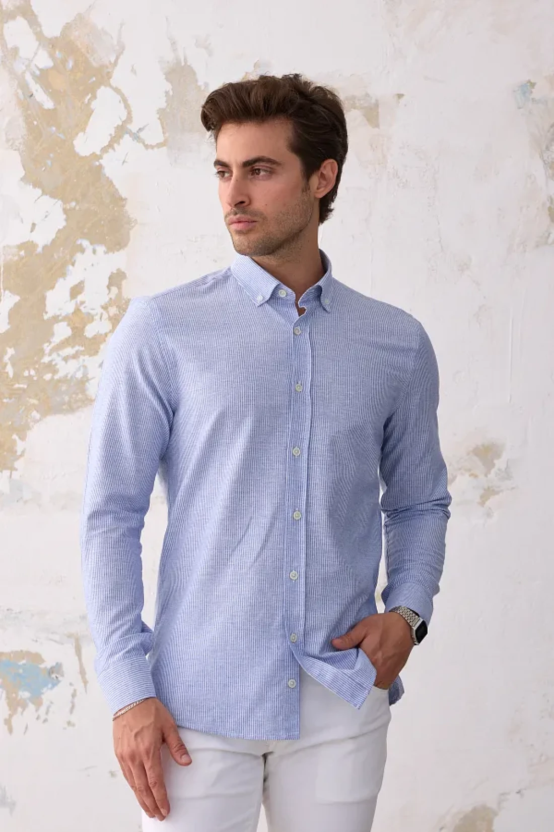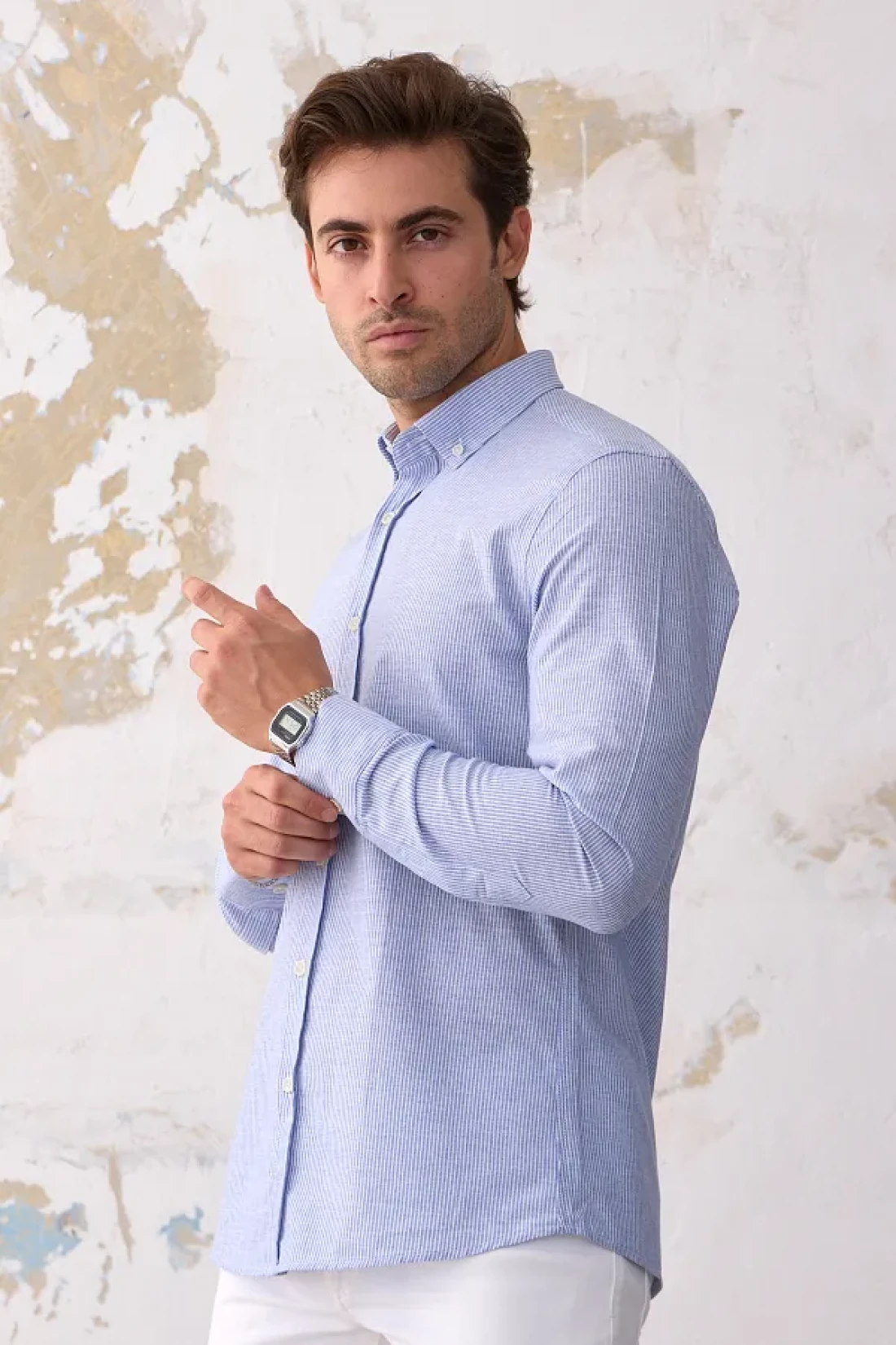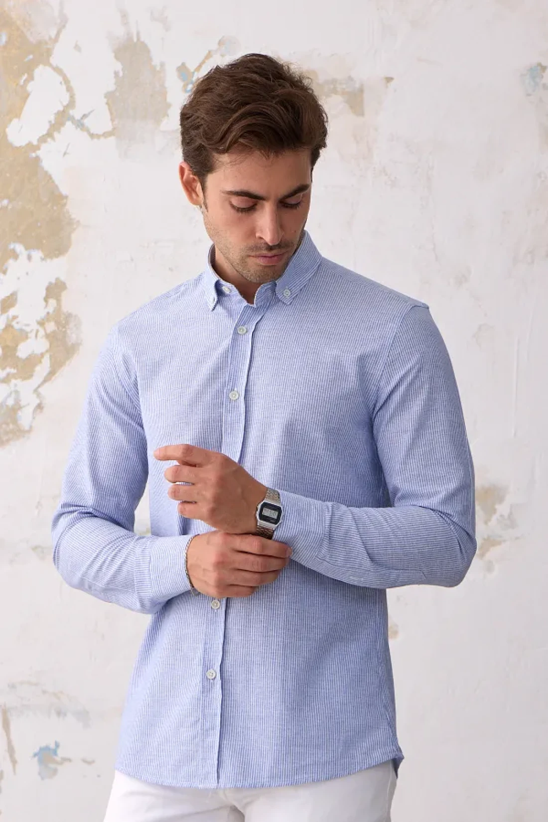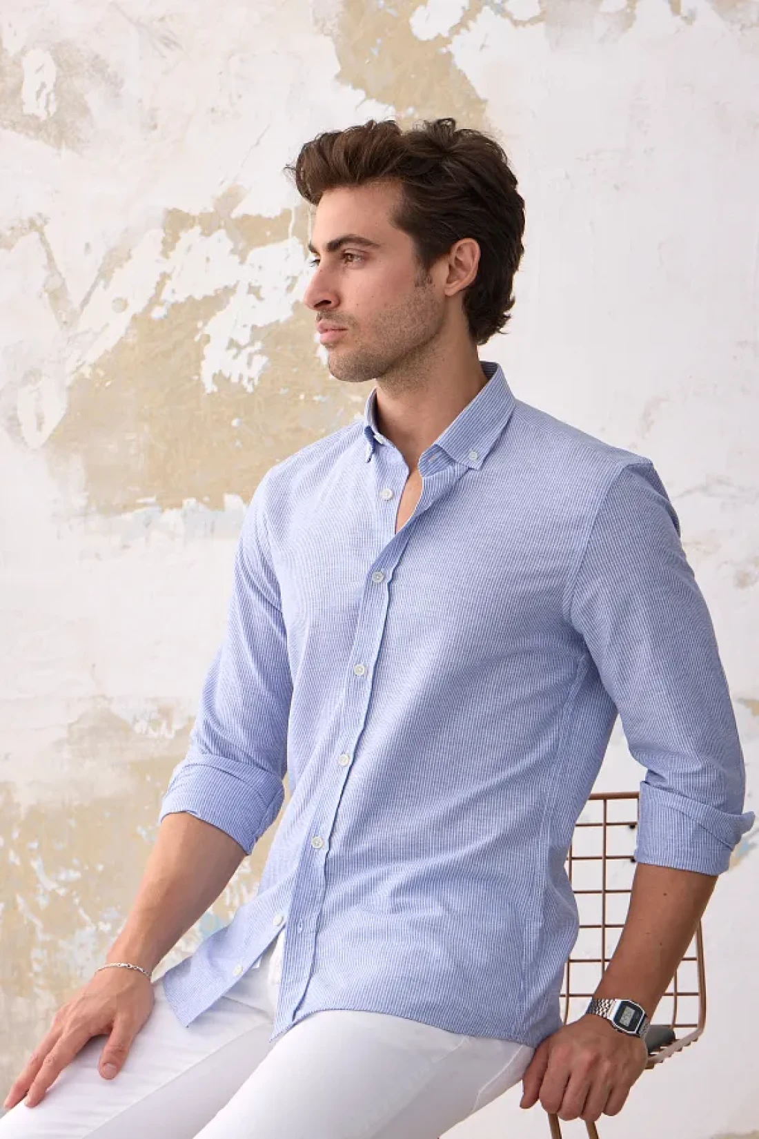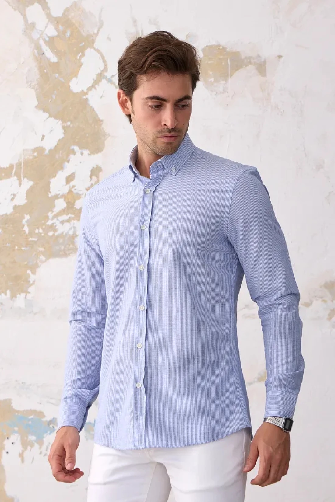 RAVANELLI Giza Men's Striped Slim Fit Shirt - Blue-White, Linen Look Cotton, Buttoned Collar