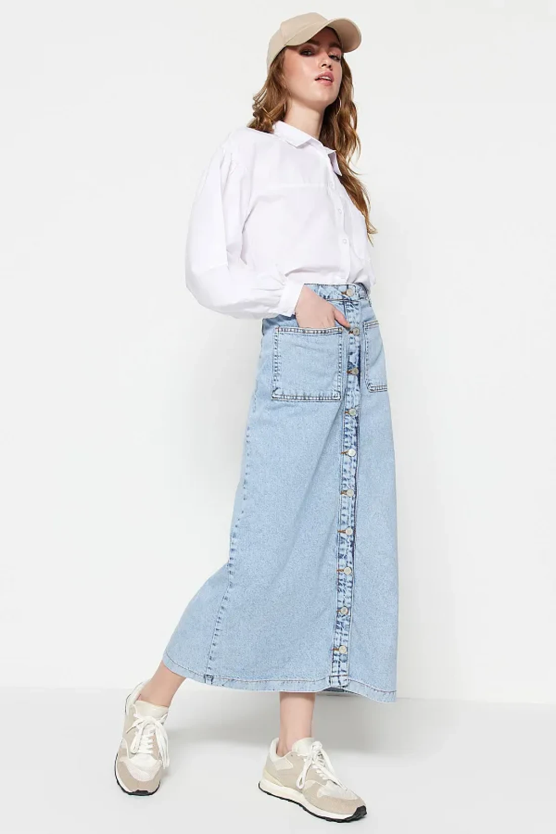 Straight cut denim skirt that appeals to all age groups and offers a timeless style. It emphasizes your waist elegantly with its belt detail, which is an ideal, comfortable and stylish option for daily use. It provides a modern and sophisticated look thanks to its pencil silhouette. It offers a comfortable experience all day long with its 100% cotton material component. It is a perfect choice for daily wear, which you can easily prefer in casual environments. While increasing durability with its rigid woven type, it promises long-lasting use with its denim fabric