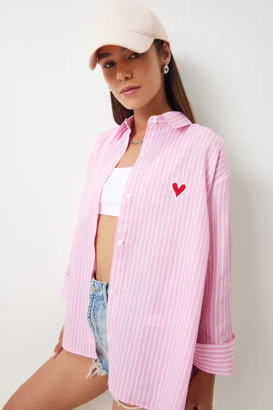 Happiness İstanbul Pink and White Embroidered Heart Striped Oversize Women's Shirt - DX00016