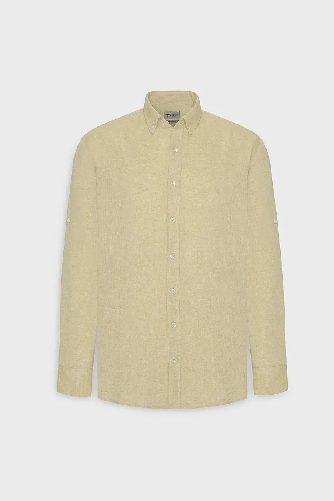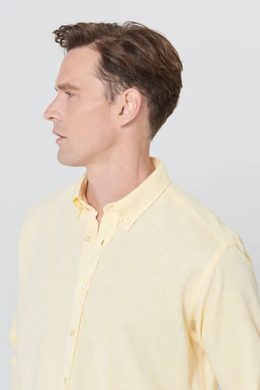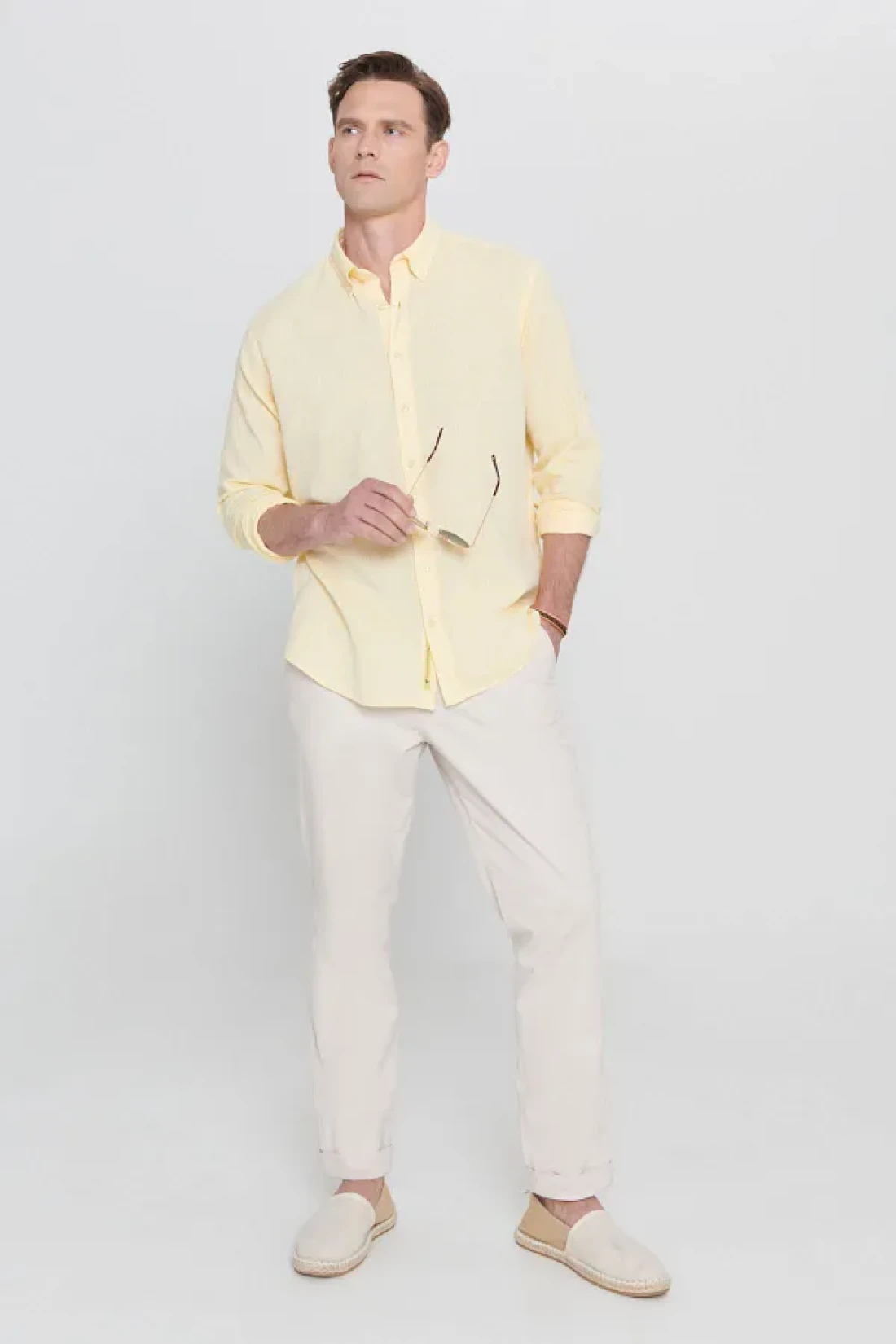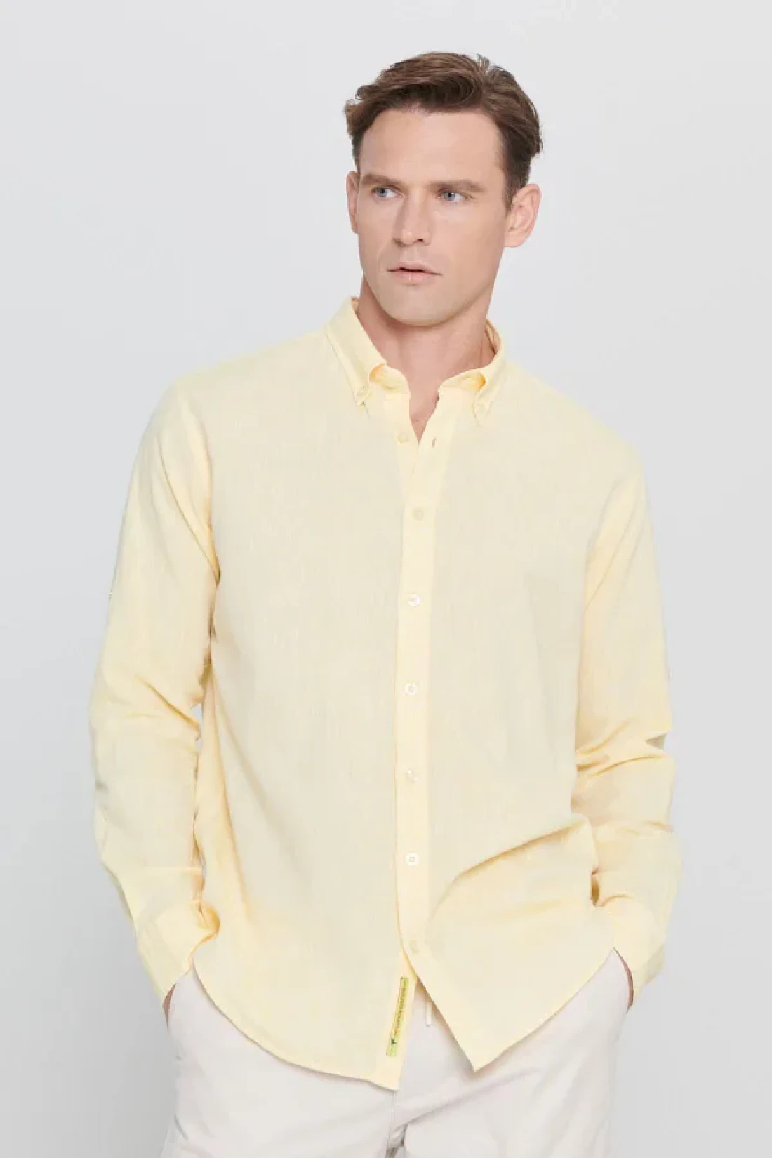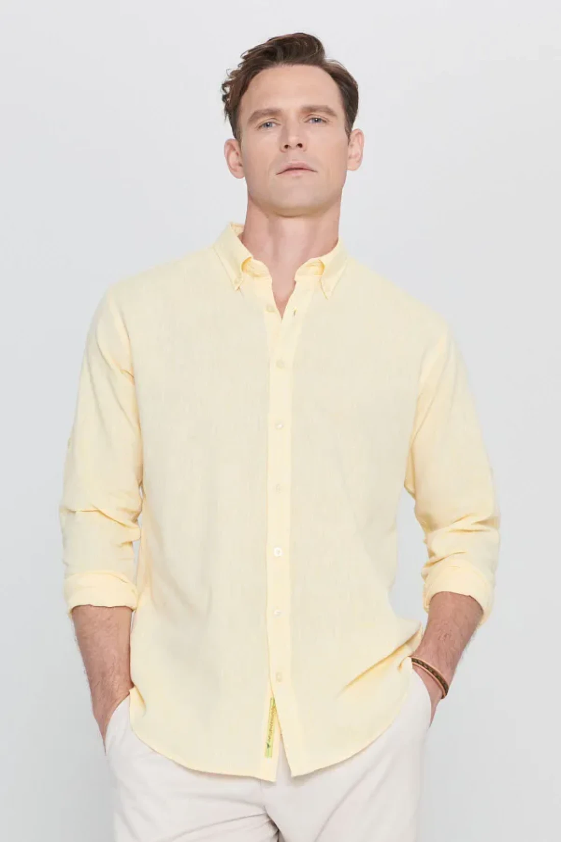 70% Cotton, 30% Linen, Solid Yellow, Classic Model, Comfort Fit, Button-down Collar, Long Sleeve, Pocketless, Summer Collection, Altınyıldız Classics / Ac&CO Comfort Fit Button-down Collar Linen Plain Casual Shirt, Product Size: L, Model Information: Height: 1.89cm, Weight: 80kg, Product Code: 4A2022200085SAR.