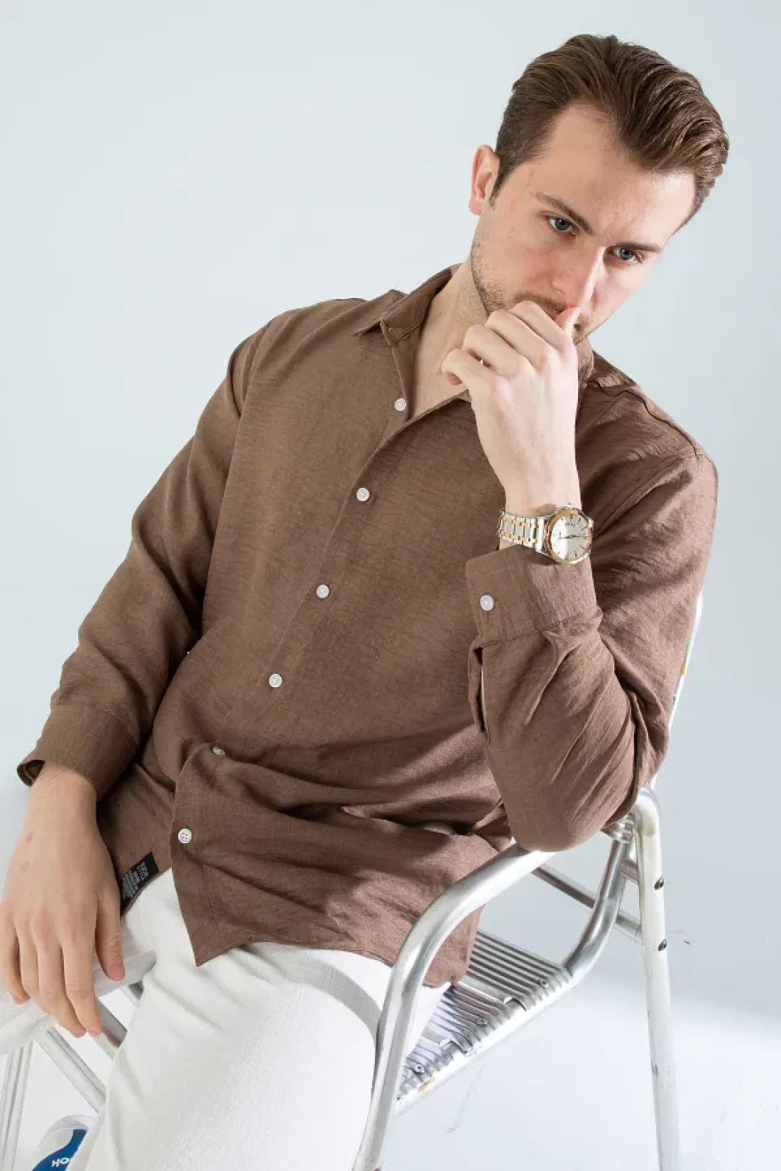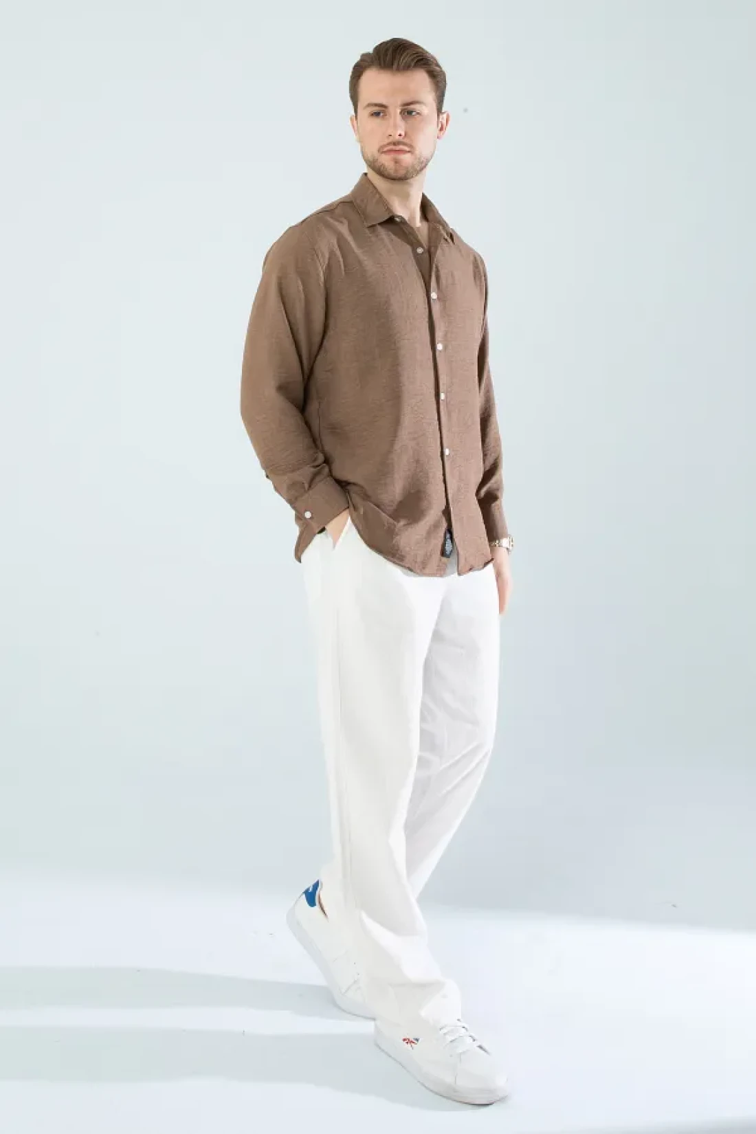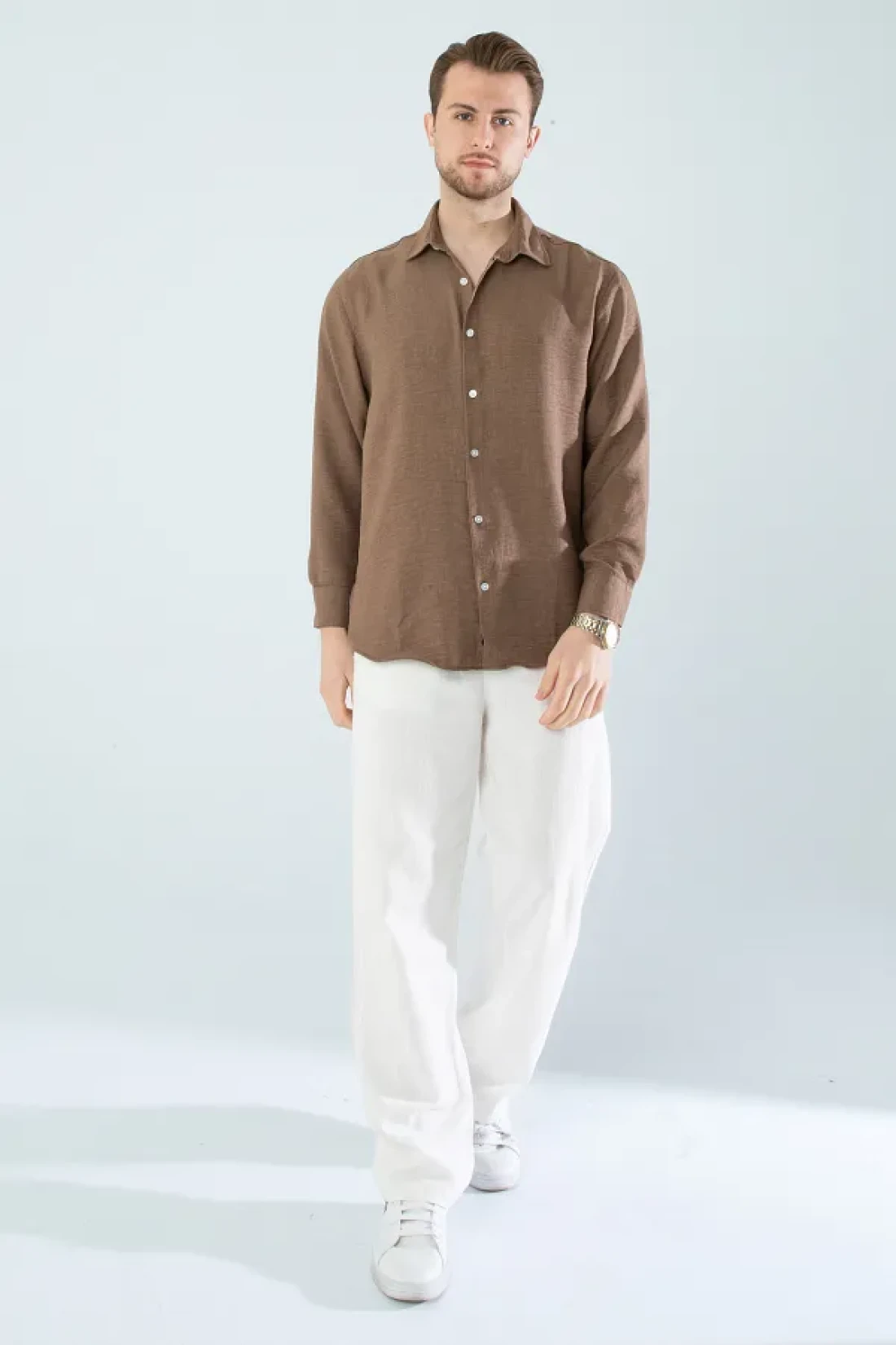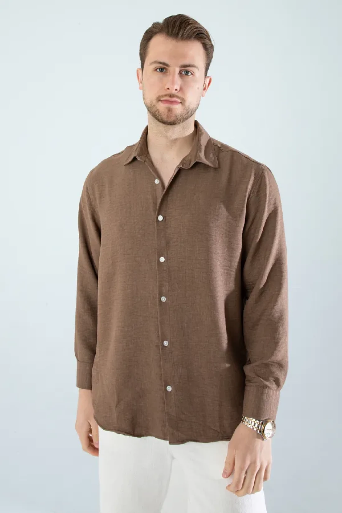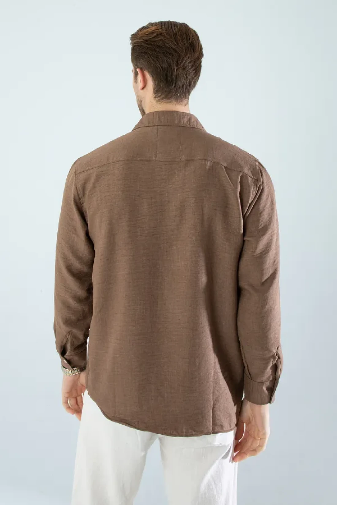YXC Trend Maker Seasonal Linen Textured Long Sleeve Oversize Men's Shirt (Product Is Wide Fit) Dark Brown