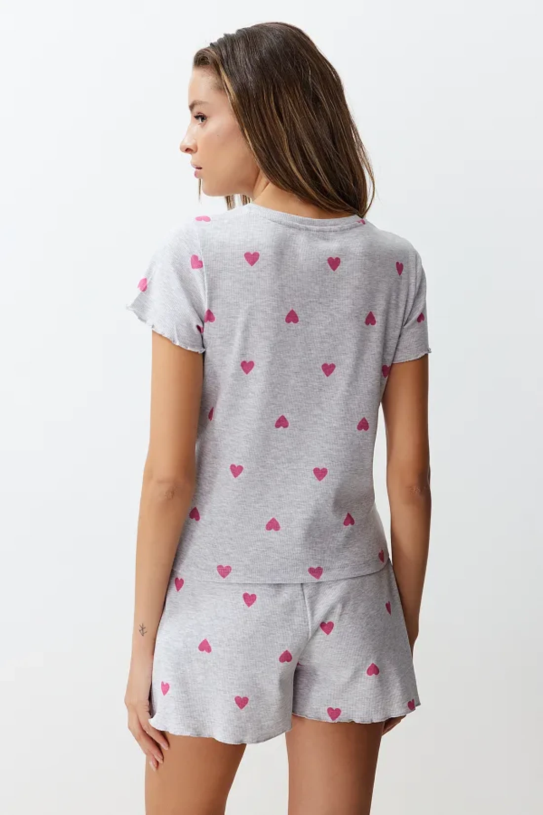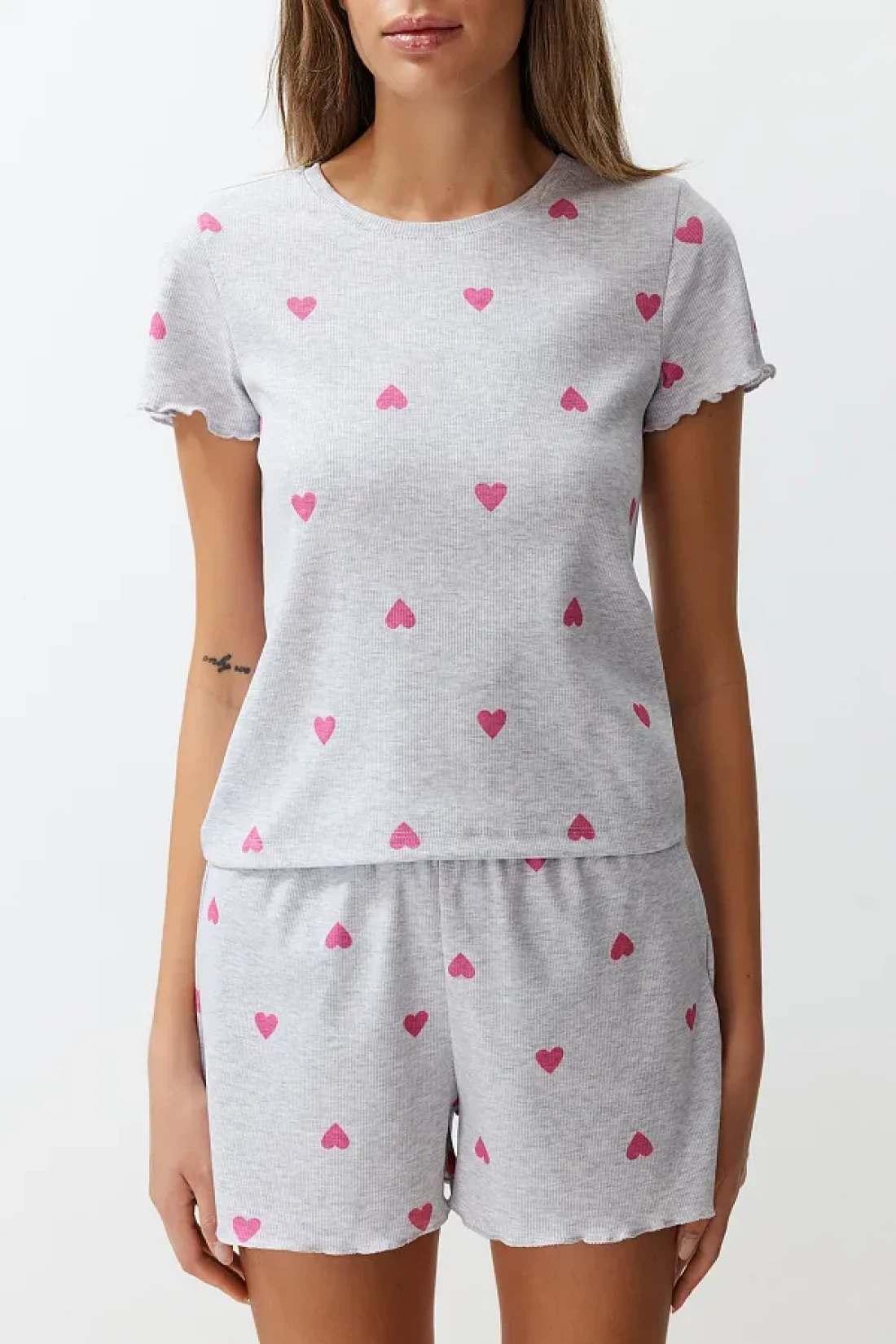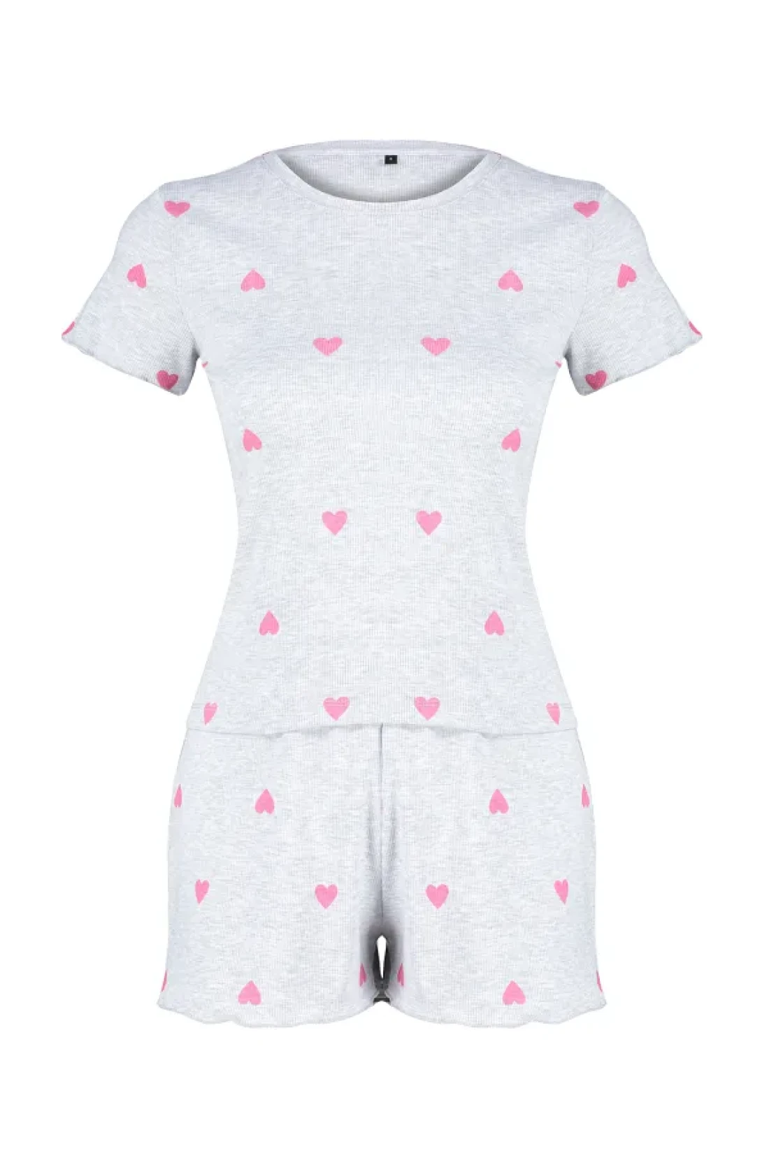 Collection Heart-Printed Grey Melange Slogan Pajama Shorts Set - THMSS24PT00220