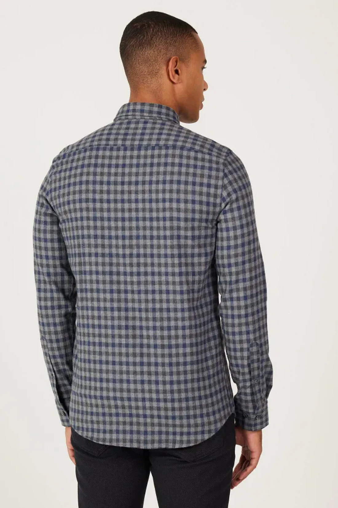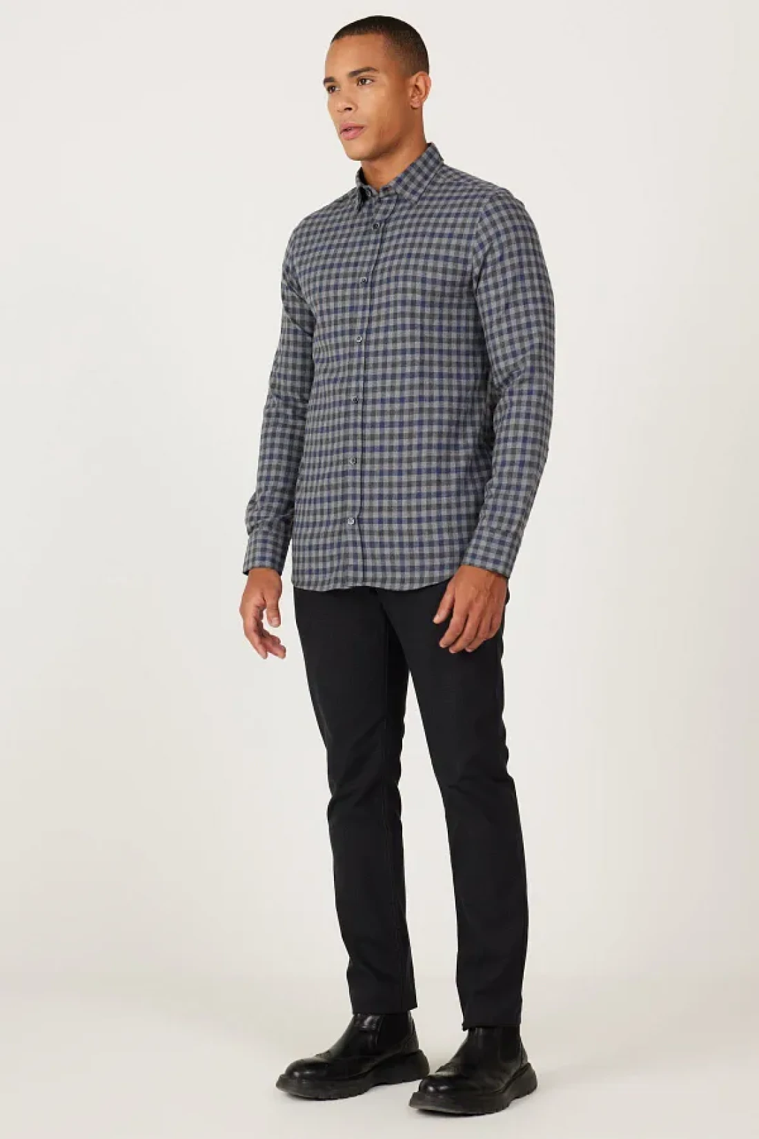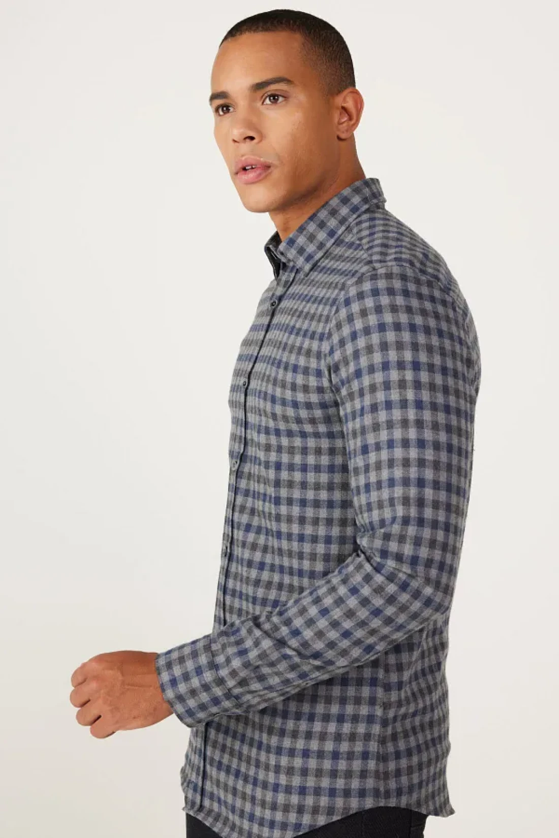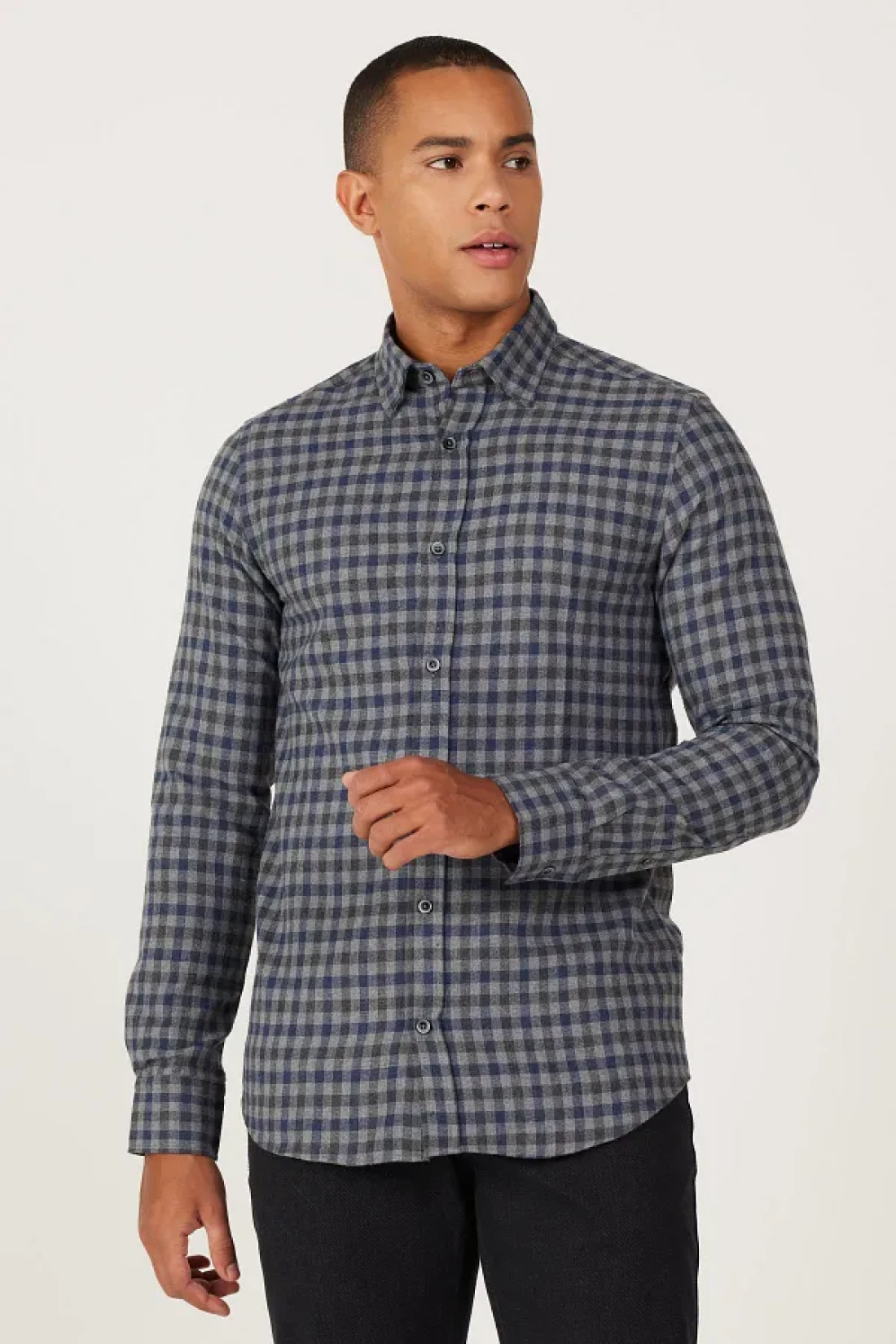 AC&Co / Altınyıldız Classics Men's Navy Blue Slim Fit Slim Fit Hidden Button Collar Checkered Thick Tufted Winter Shirt