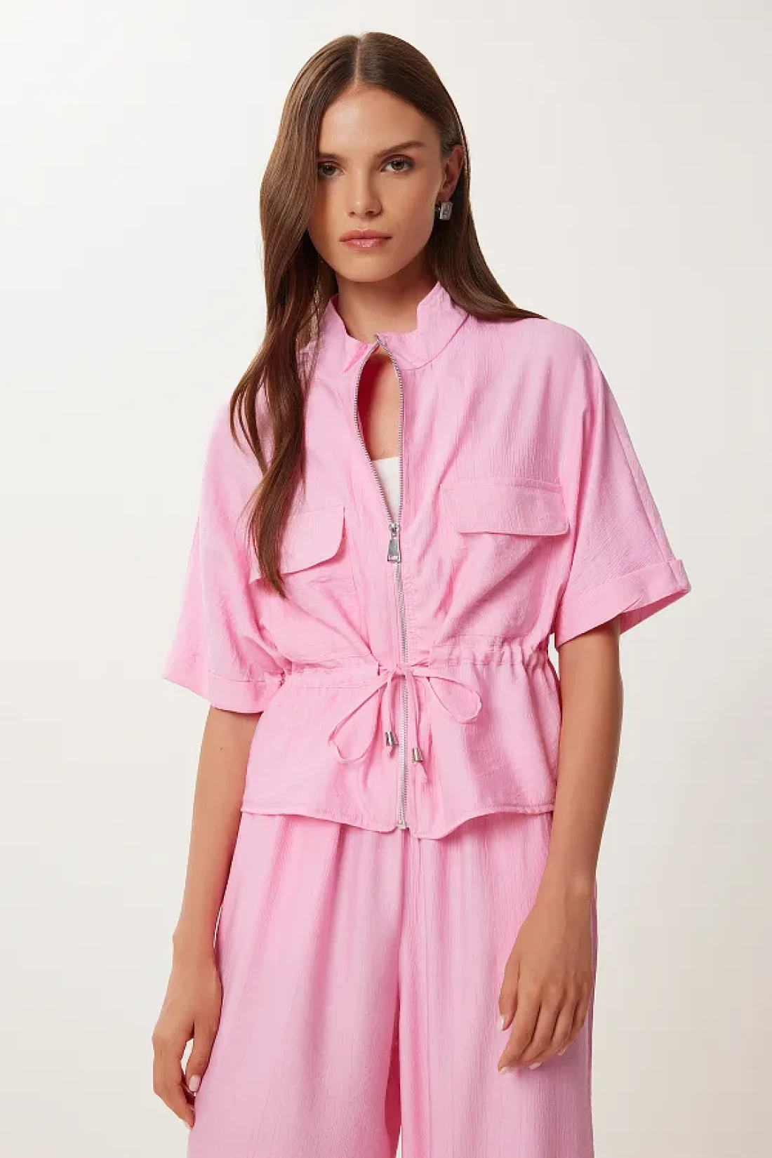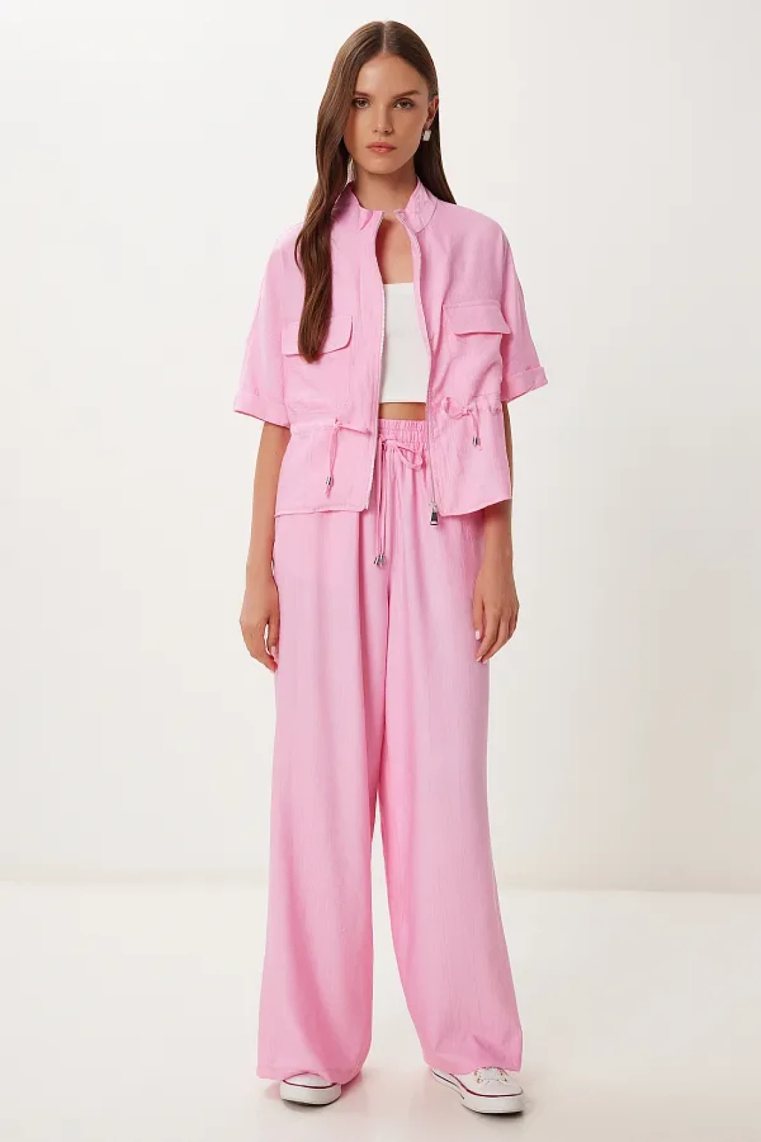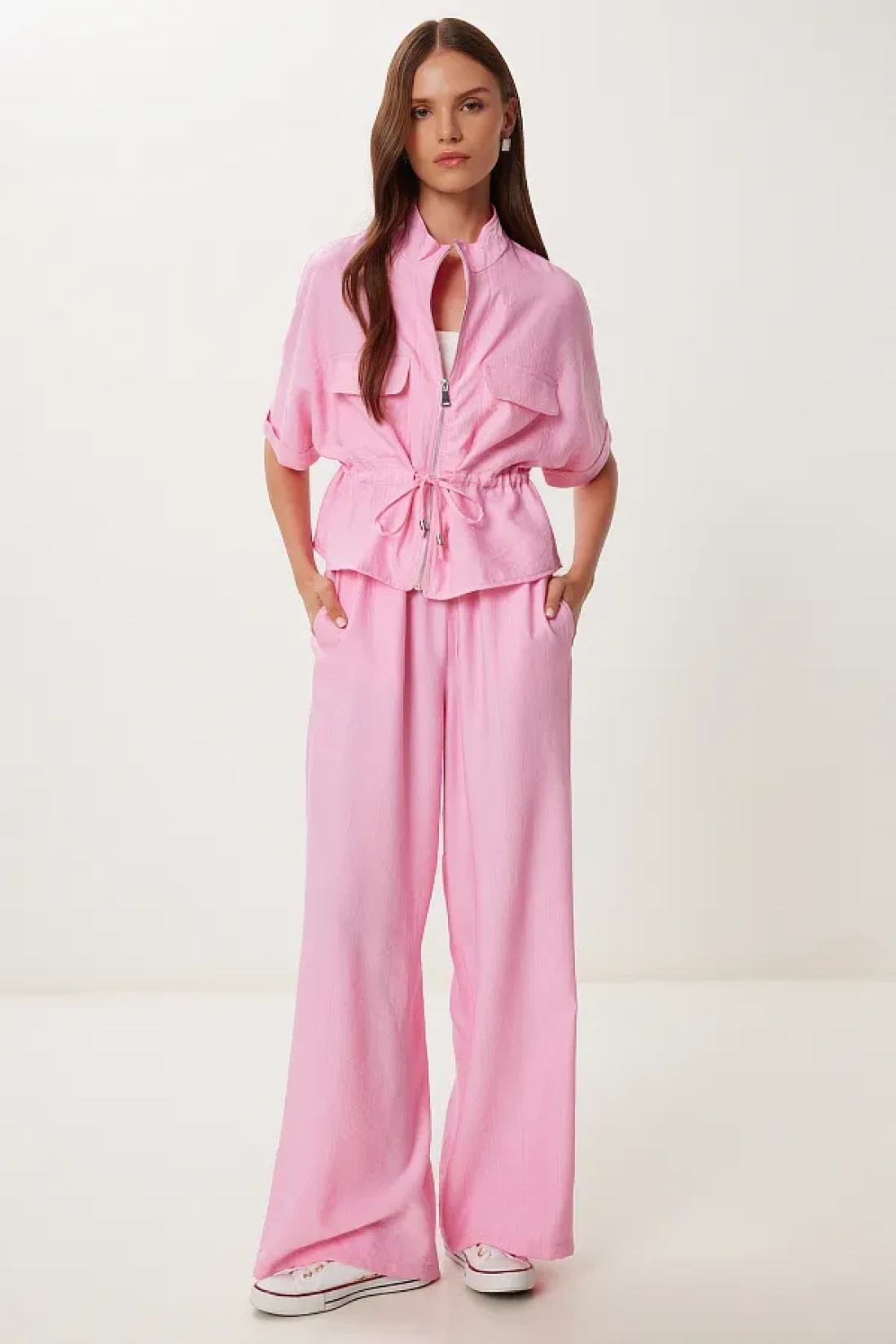 Stand collar, zip closure, tie detail jacket and elastic waist, side pocket, wide leg pants consisting of a wrinkled effect suit content: 70% polyviscon 30% polyester jacket length: 54 cm pants length: 104 cm 30 ° Machine washable.