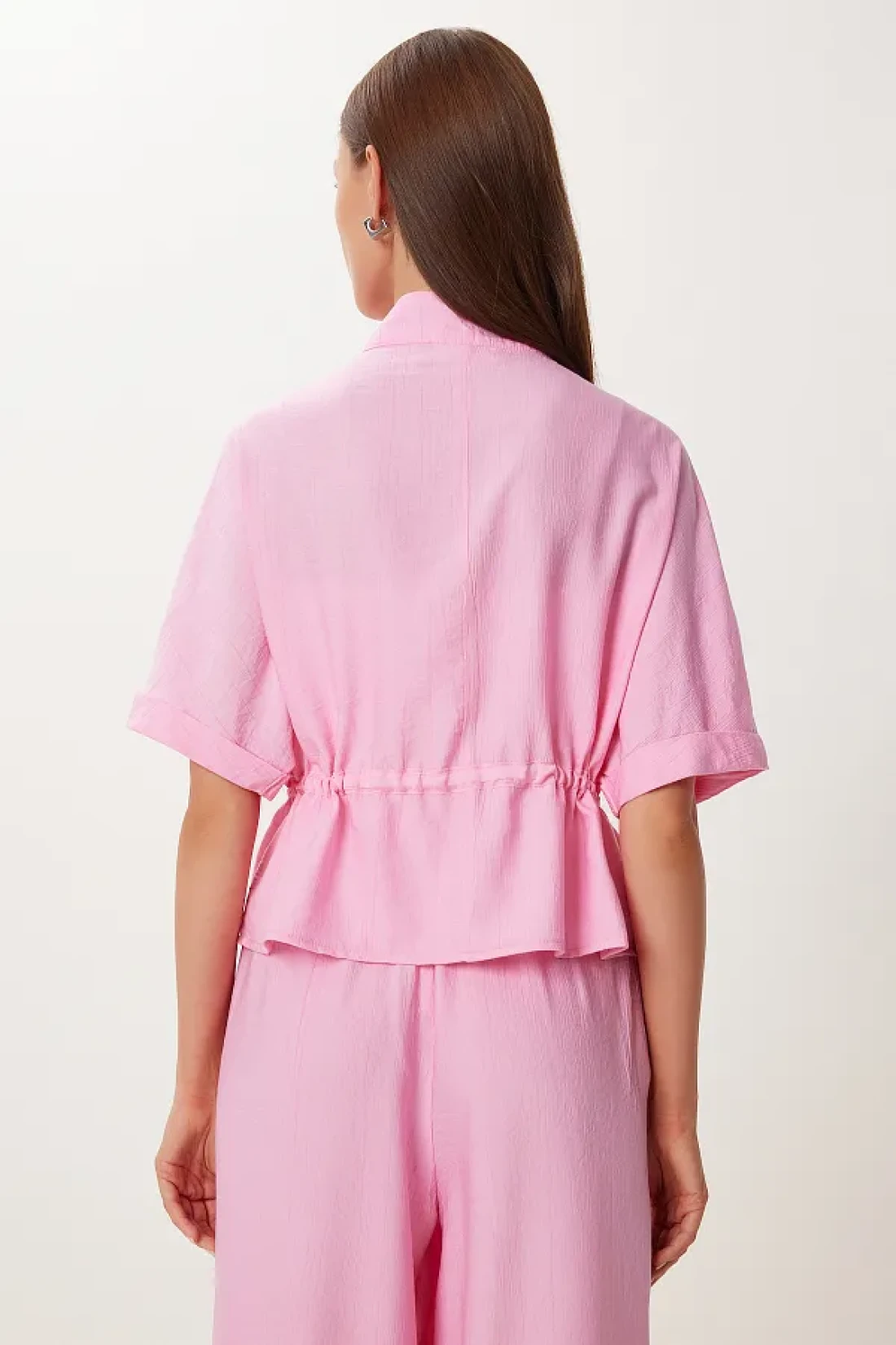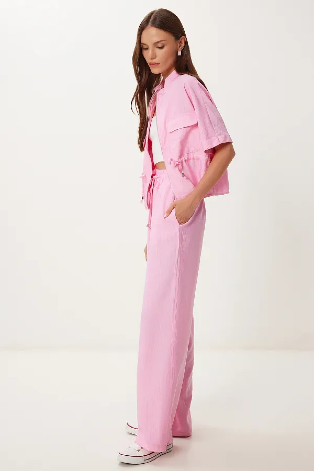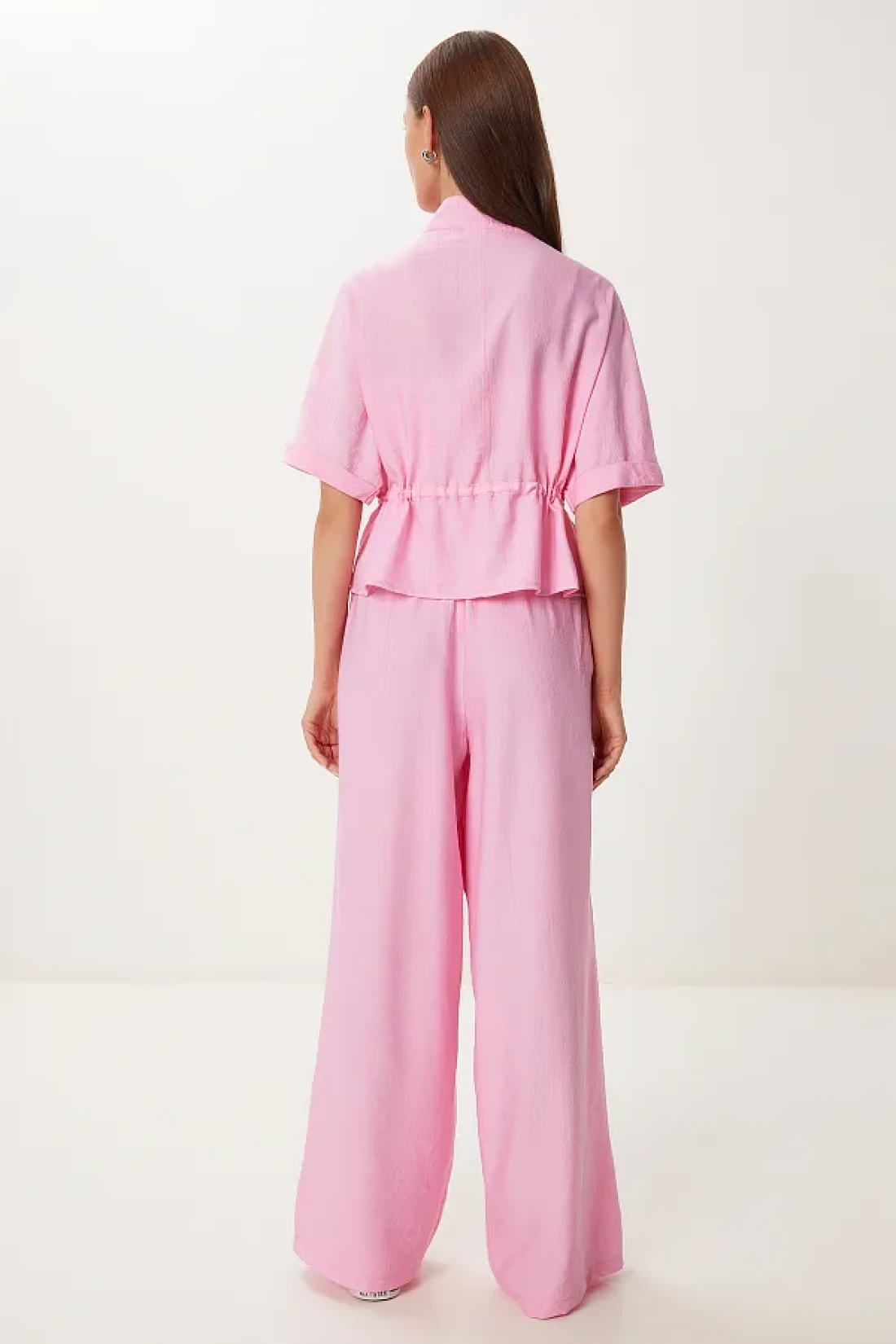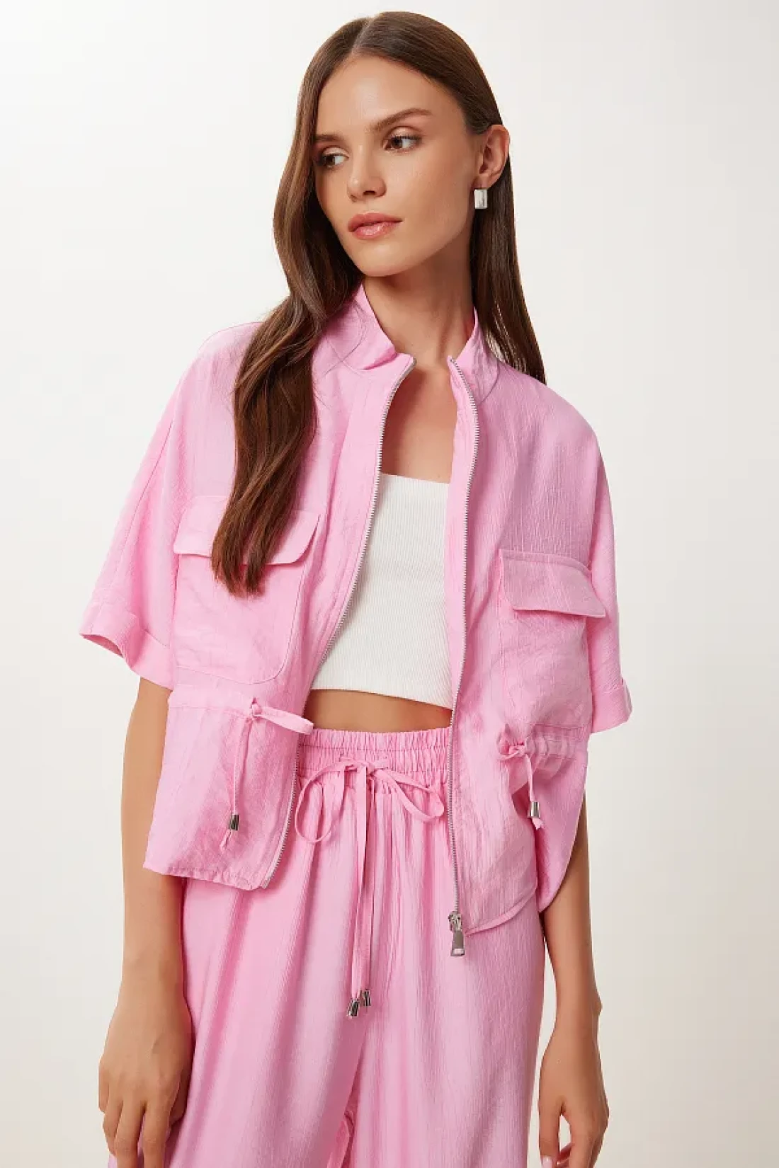 Stand collar, zip closure, tie detail jacket and elastic waist, side pocket, wide leg pants consisting of a wrinkled effect suit content: 70% polyviscon 30% polyester jacket length: 54 cm pants length: 104 cm 30 ° Machine washable.