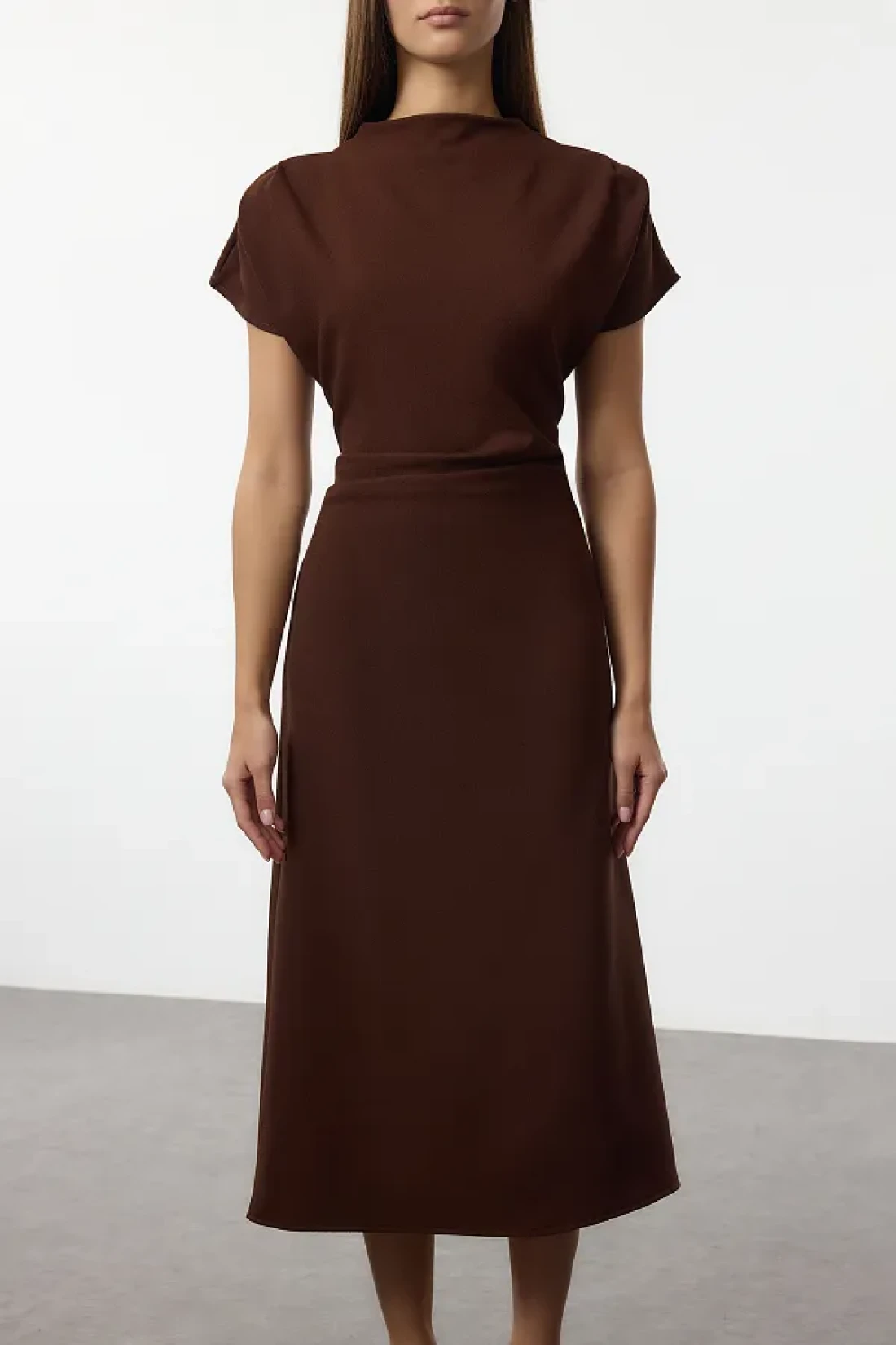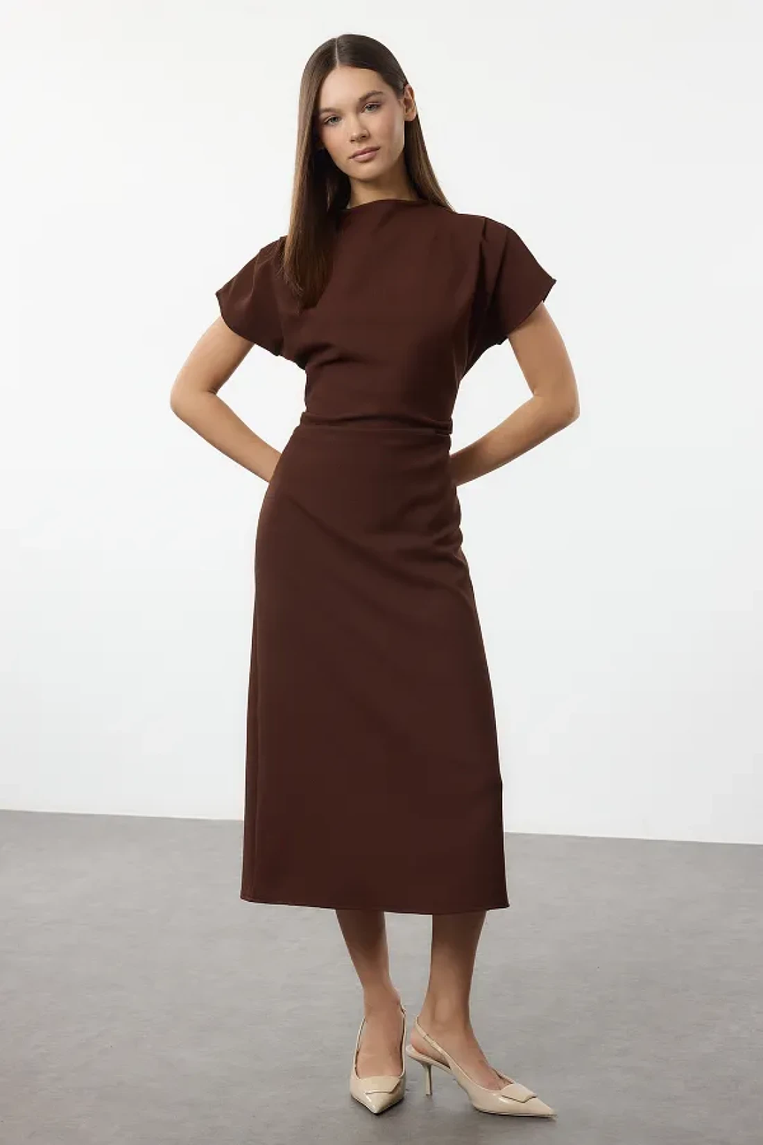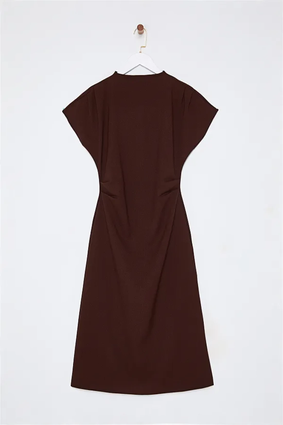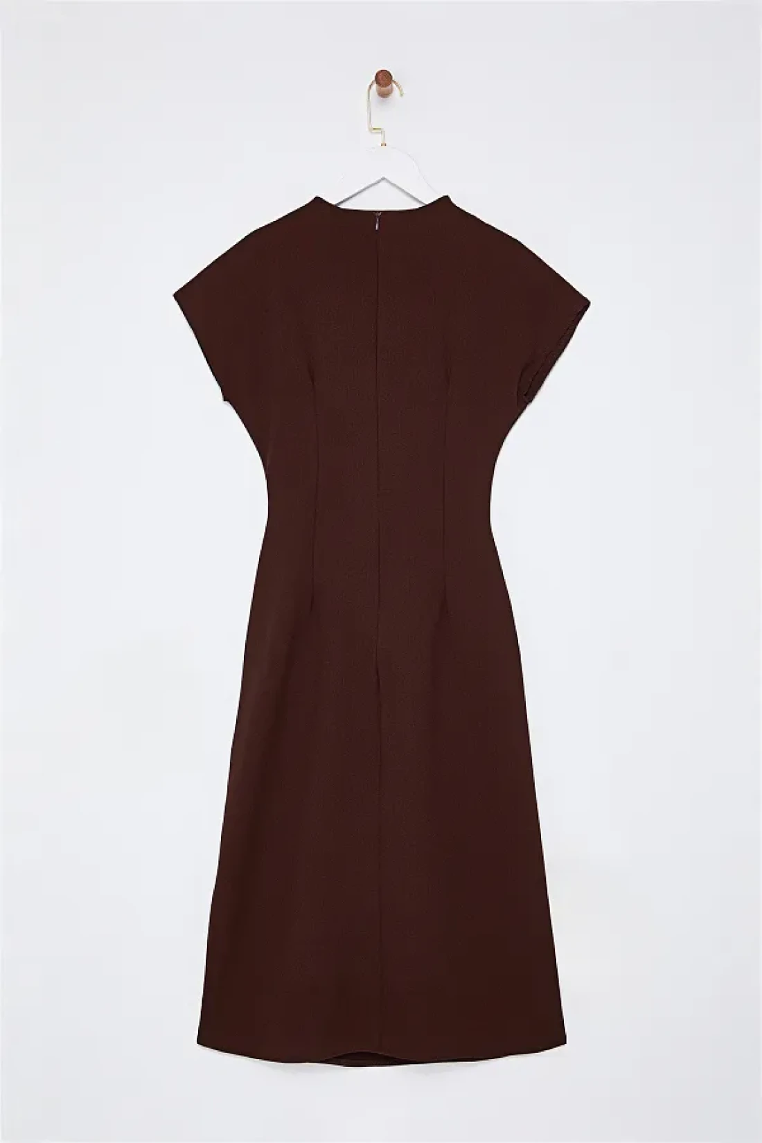 Collection A-Line Midi Dress - Brown, Degaje Collar, Crepe Woven Twoaw25El00393