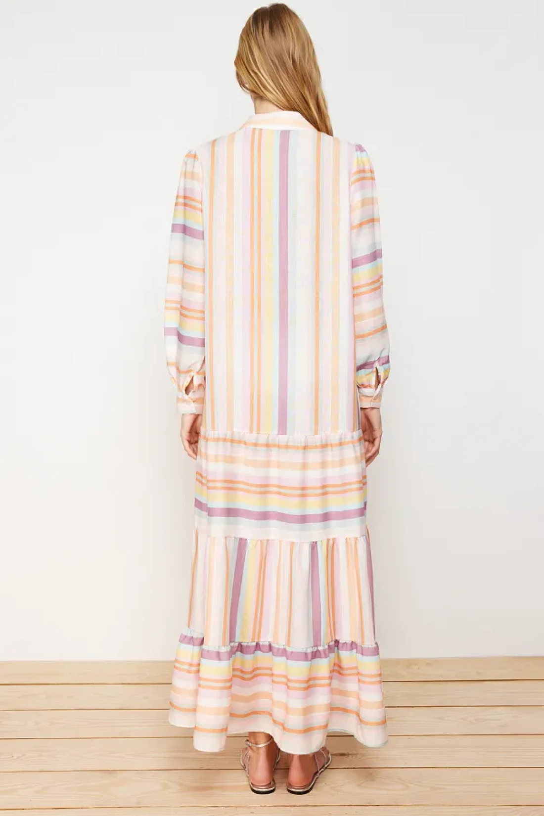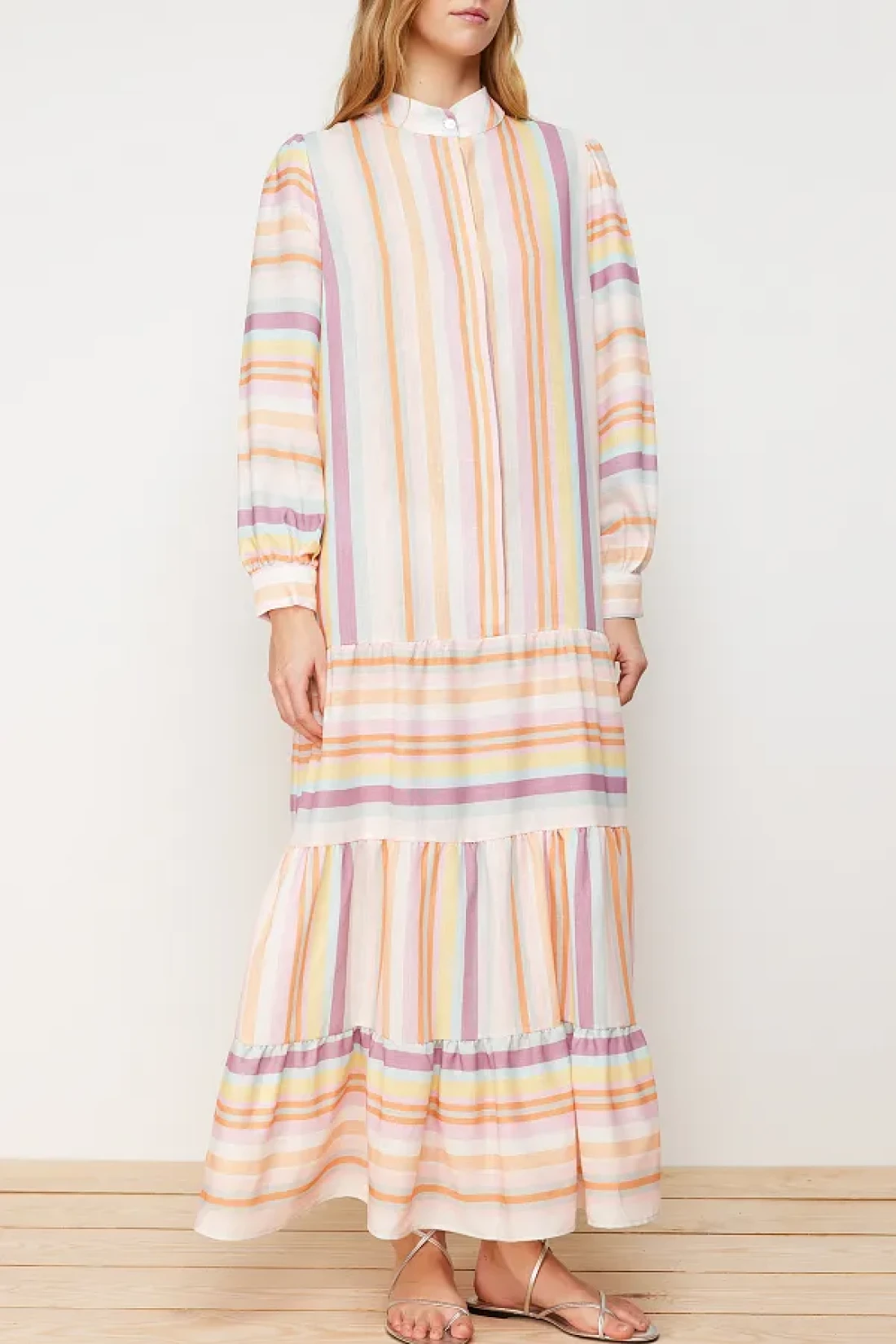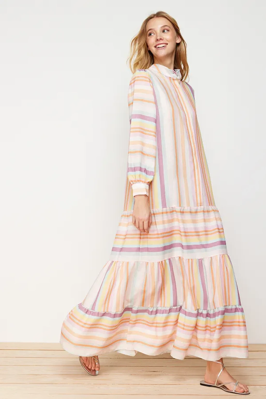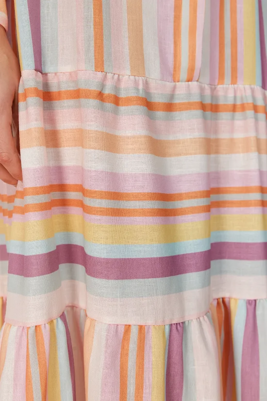 Modest Linen Look Woven Dress with Multi-Colored Striped Skirt and Ruffles TCTSS24EB00105