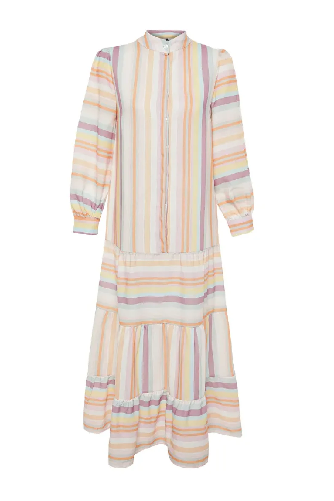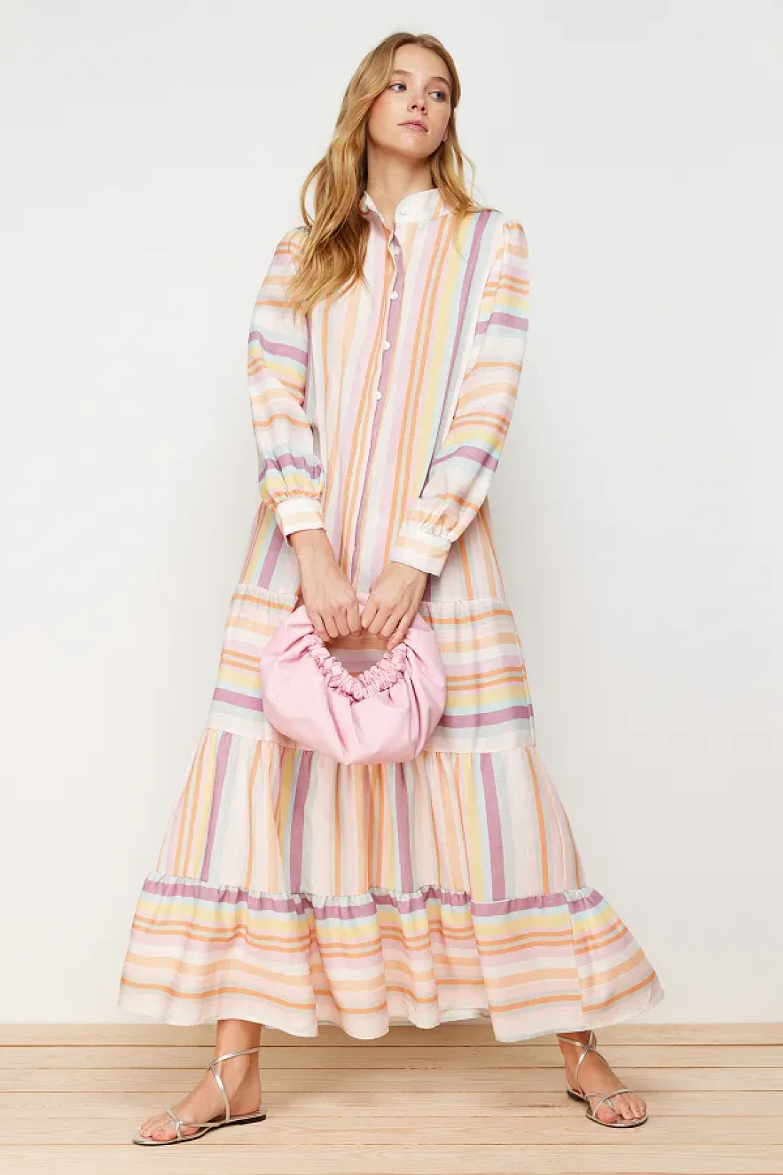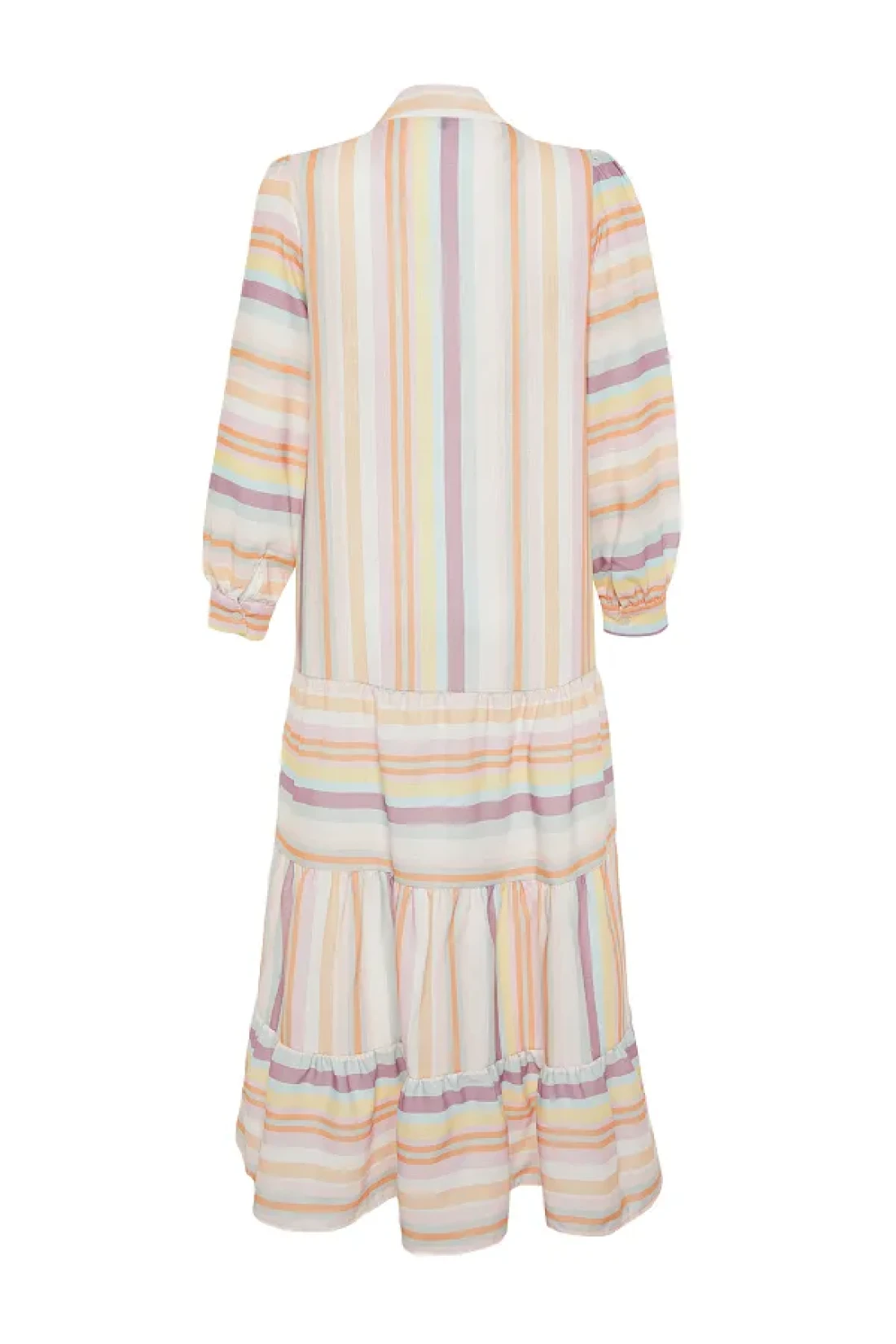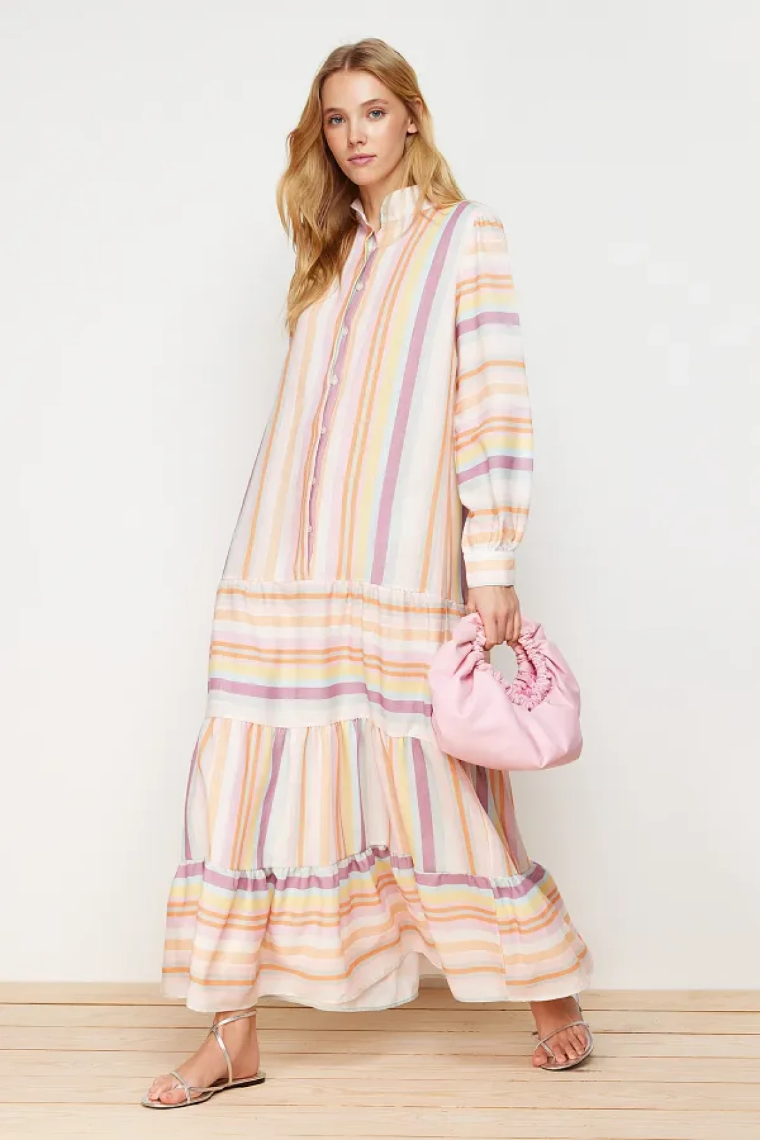 Modest Linen Look Woven Dress with Multi-Colored Striped Skirt and Ruffles TCTSS24EB00105