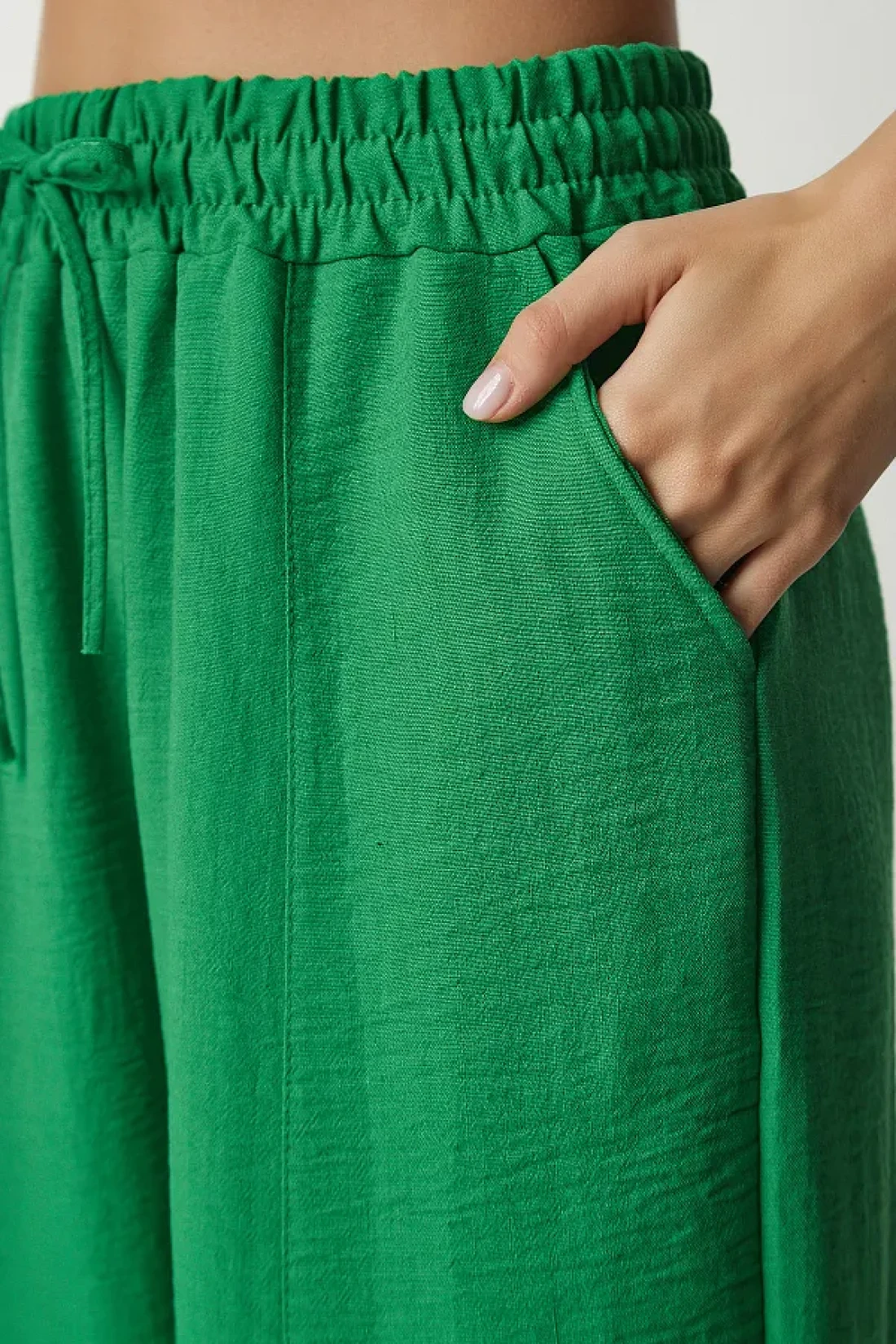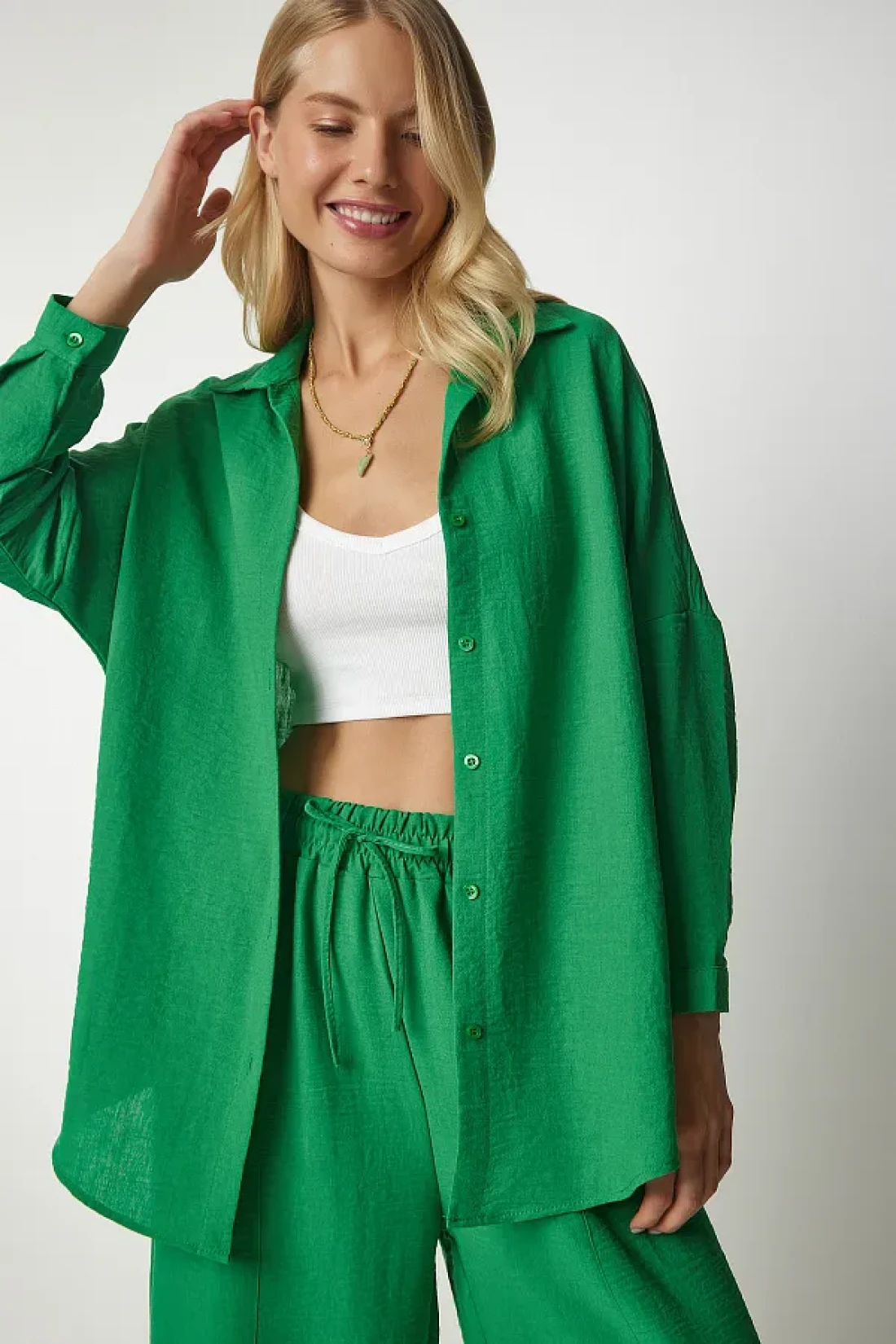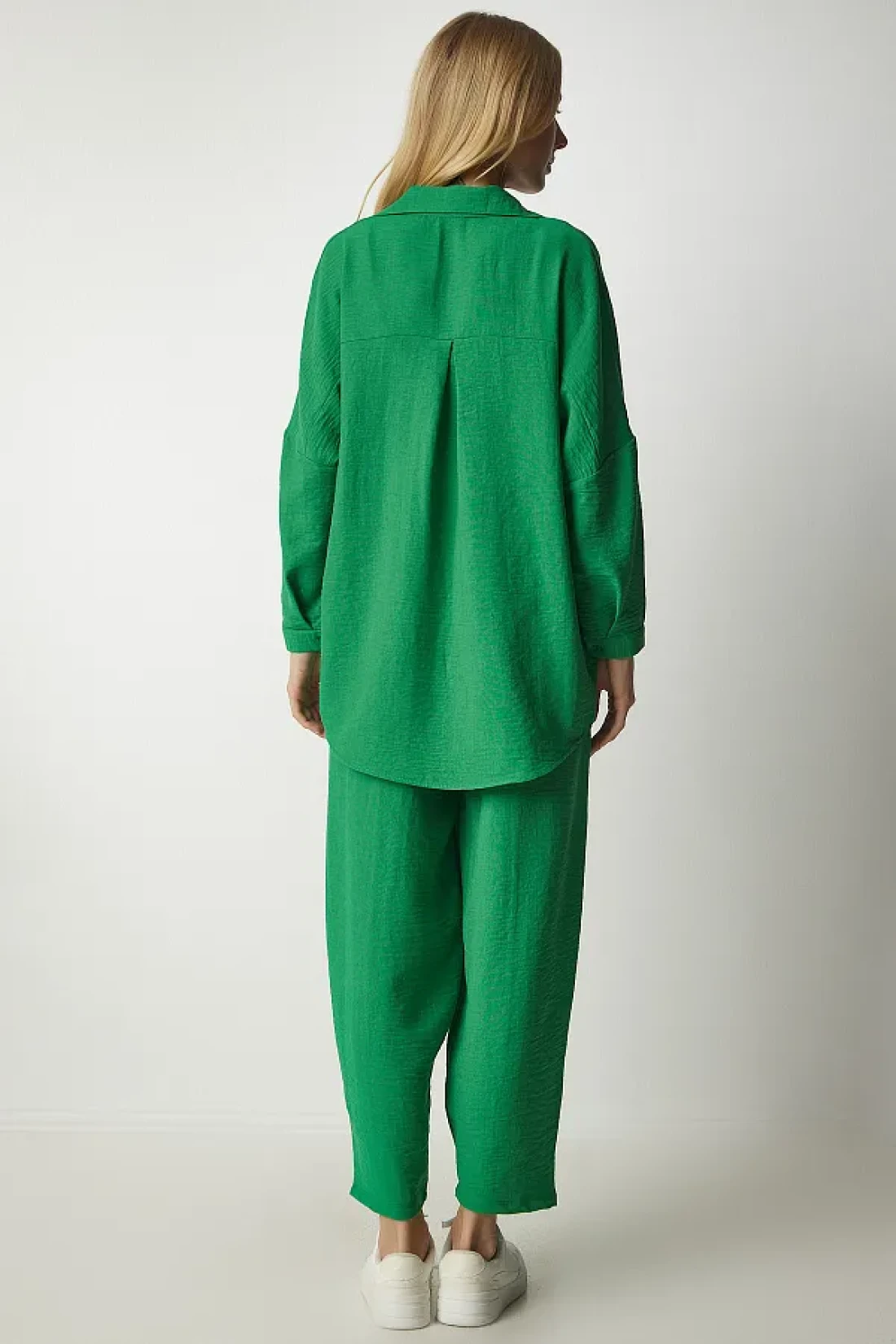Happiness İstanbul Women's Green Linen Shirt Baggy Trousers Set DZ00080