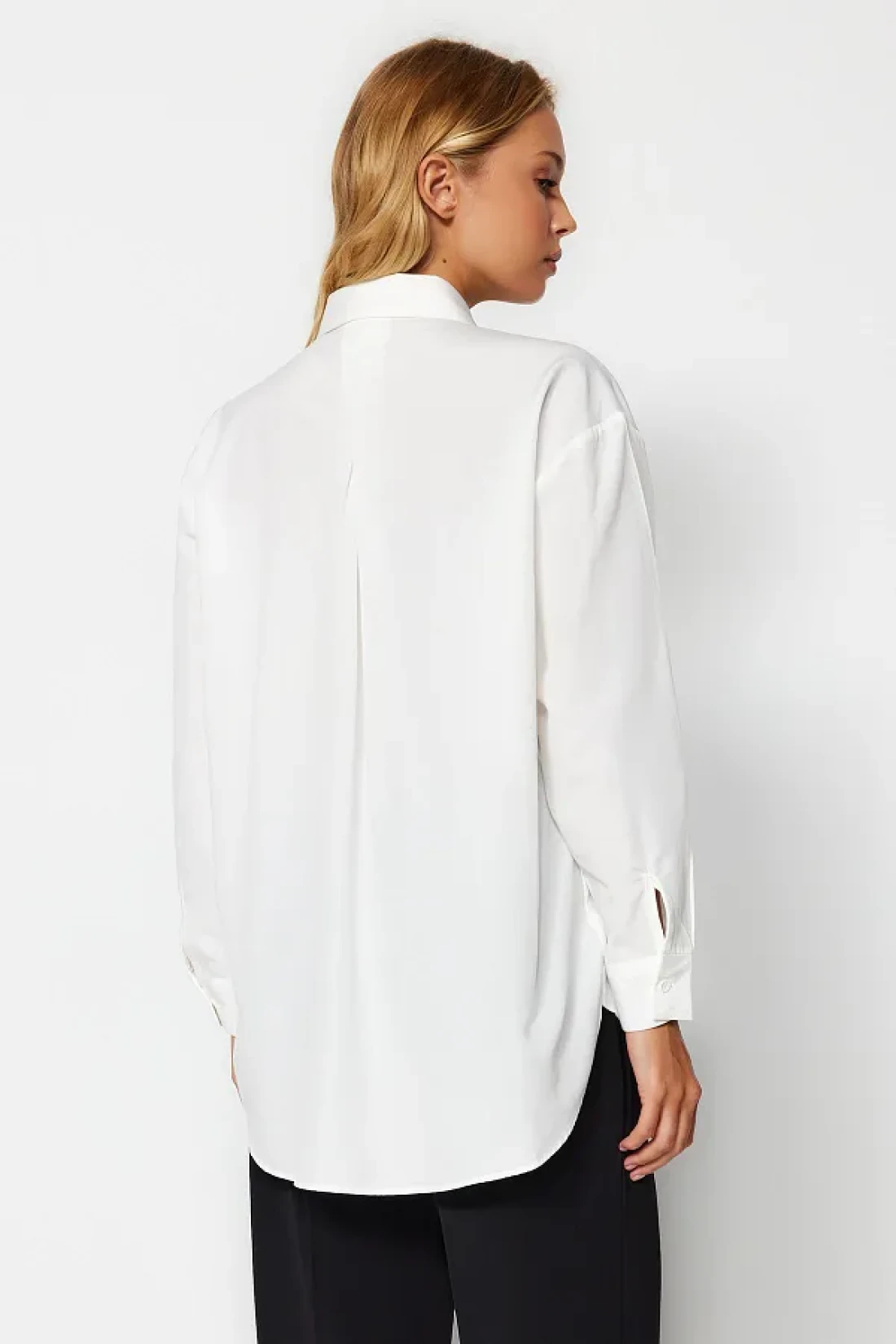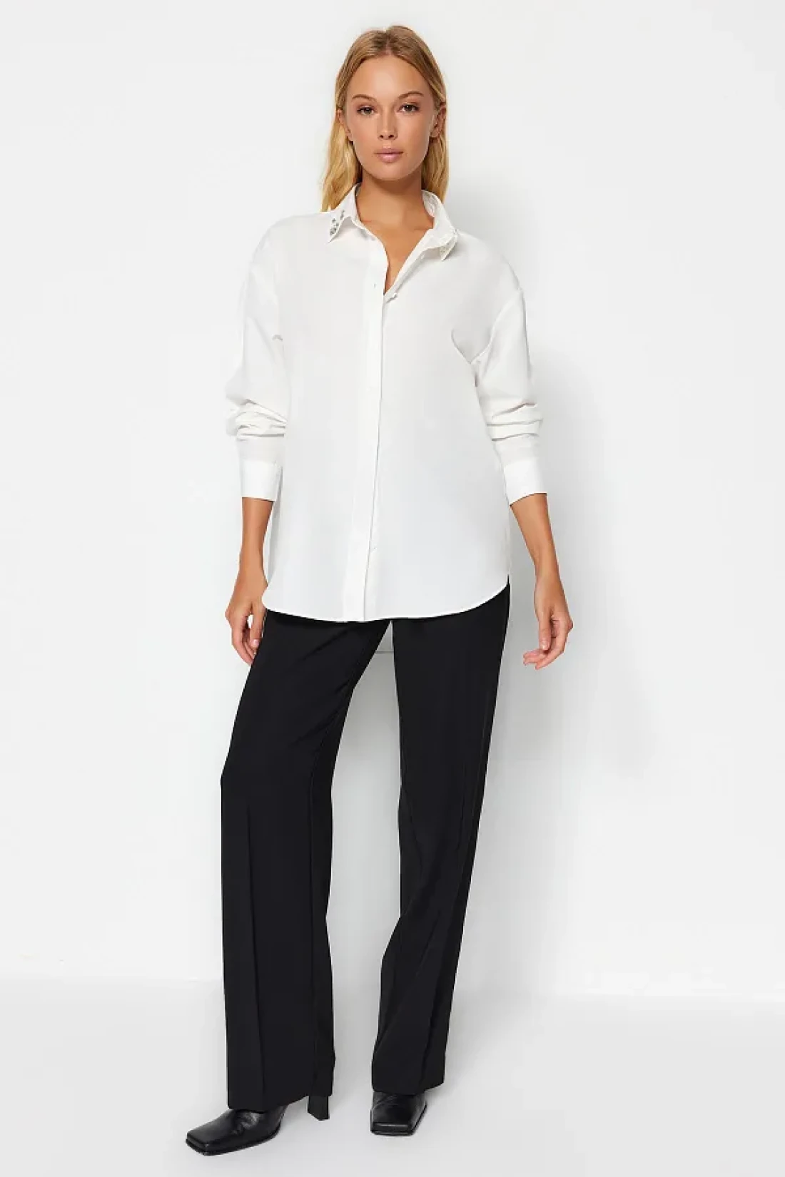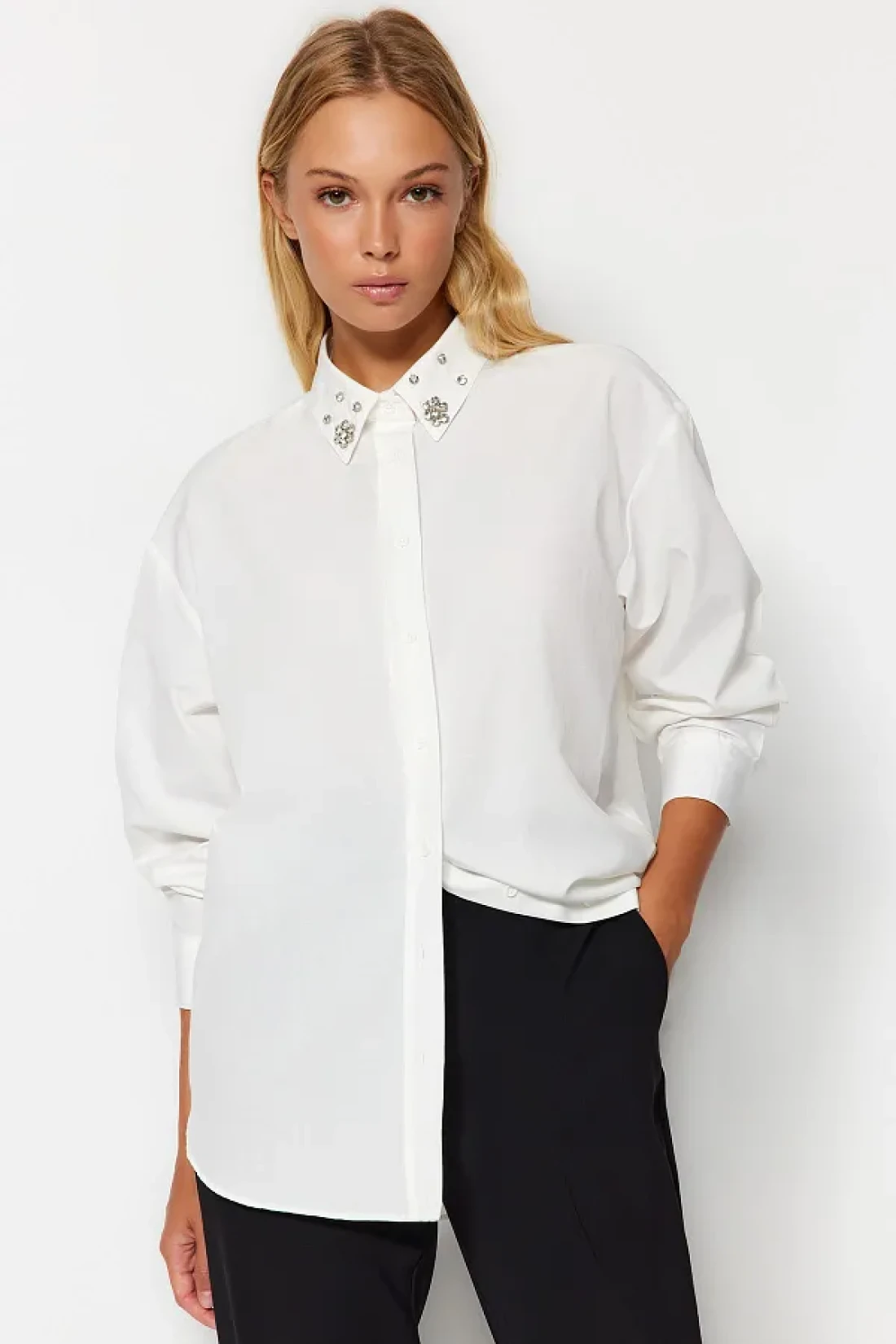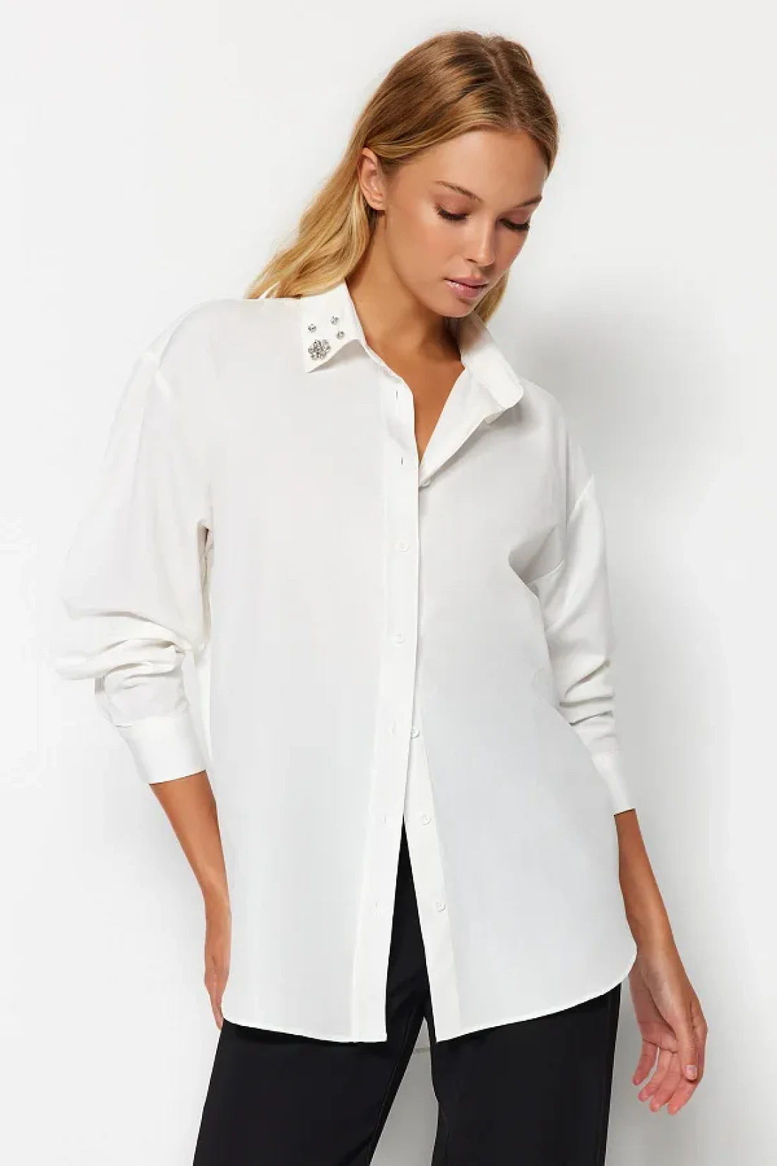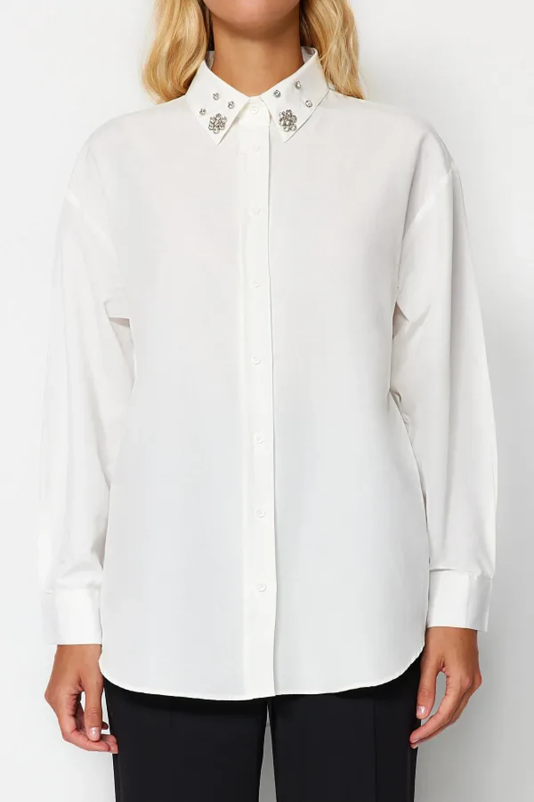 Collection Ecru Oversize Woven Shirt with Stone Collar Detail TWOAW24GO00168
