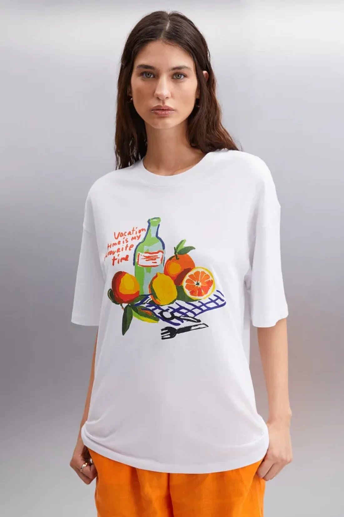 It is made of 100% cotton material, has a structure that allows your skin to breathe and provides comfort all day long. As part of the basic collection, it is ideal for daily use. Offers comfort and elegance together Thanks to its Oversized mold, it provides a modern and trendy look without restricting your freedom of movement. Knitted fabric type, with its flexible structure, adapts to your body lines and offers comfortable use. You get a simple and stylish look with the crew neck design. It goes well with all kinds of combinations It allows you to create a timeless style with its basic silhouette, while adding striking details with its Printed pattern. Product details enriched with accessory details, t