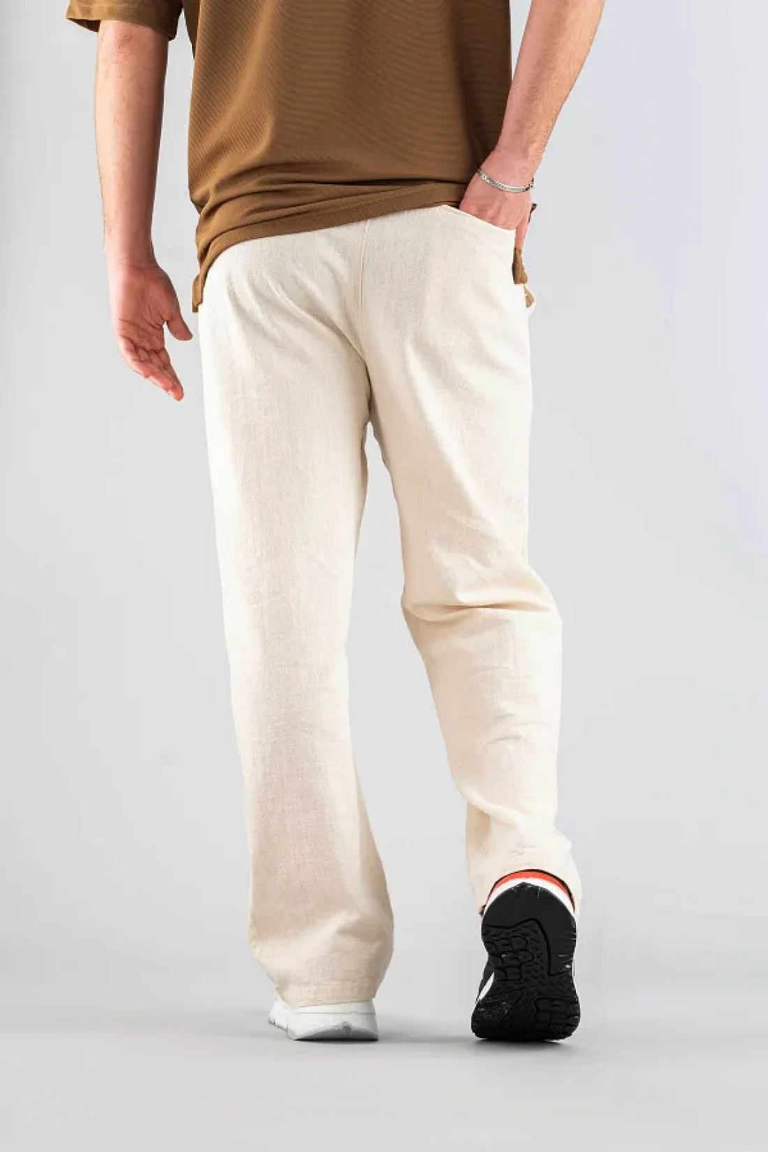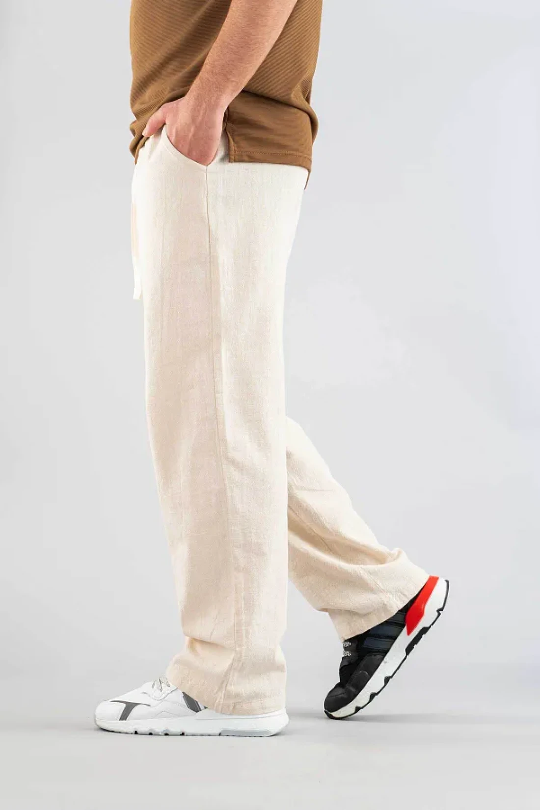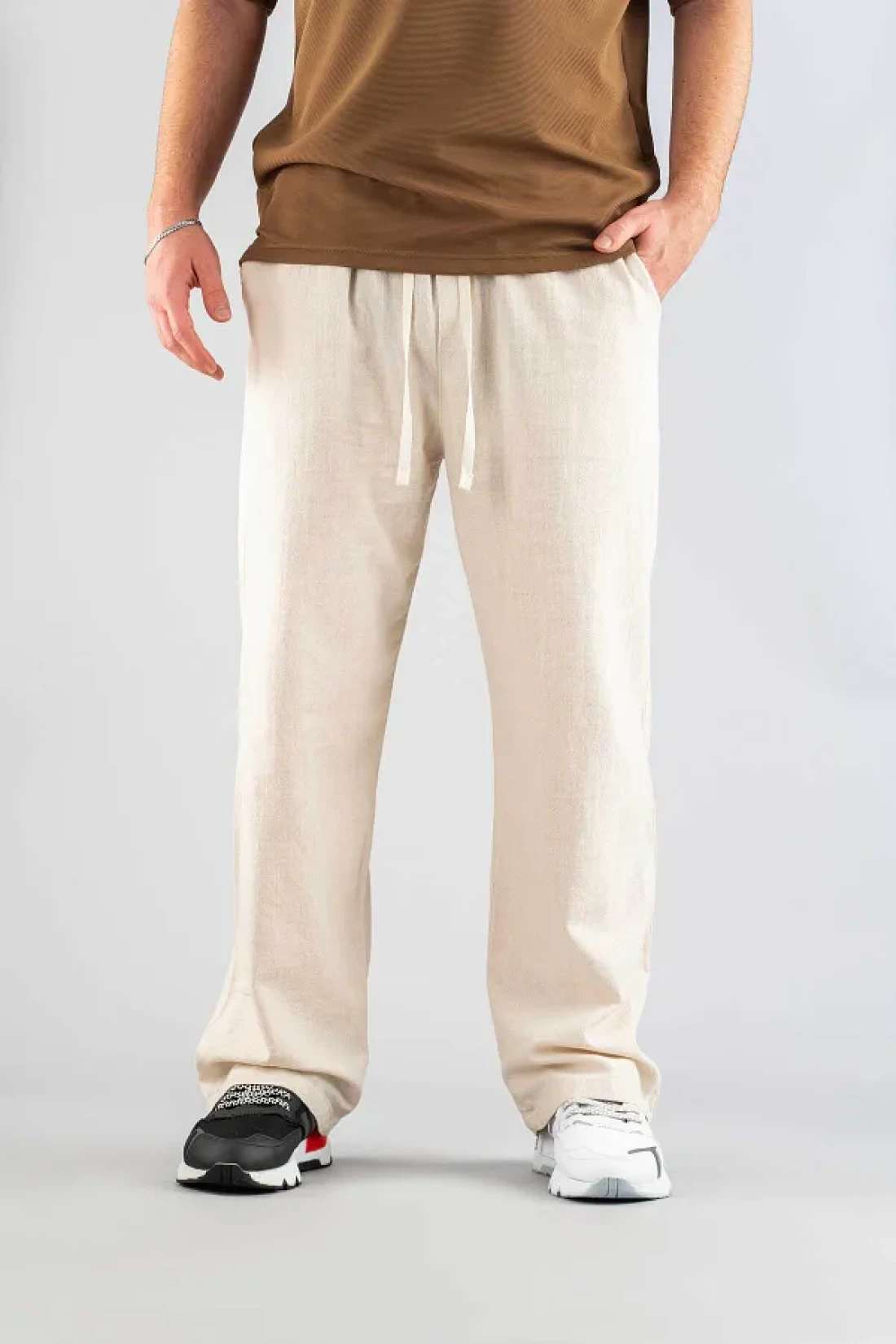 bombe Men's Beige Linen Trousers Comfortable Fit Belted Drawstring Elastic Waist Linen Trousers