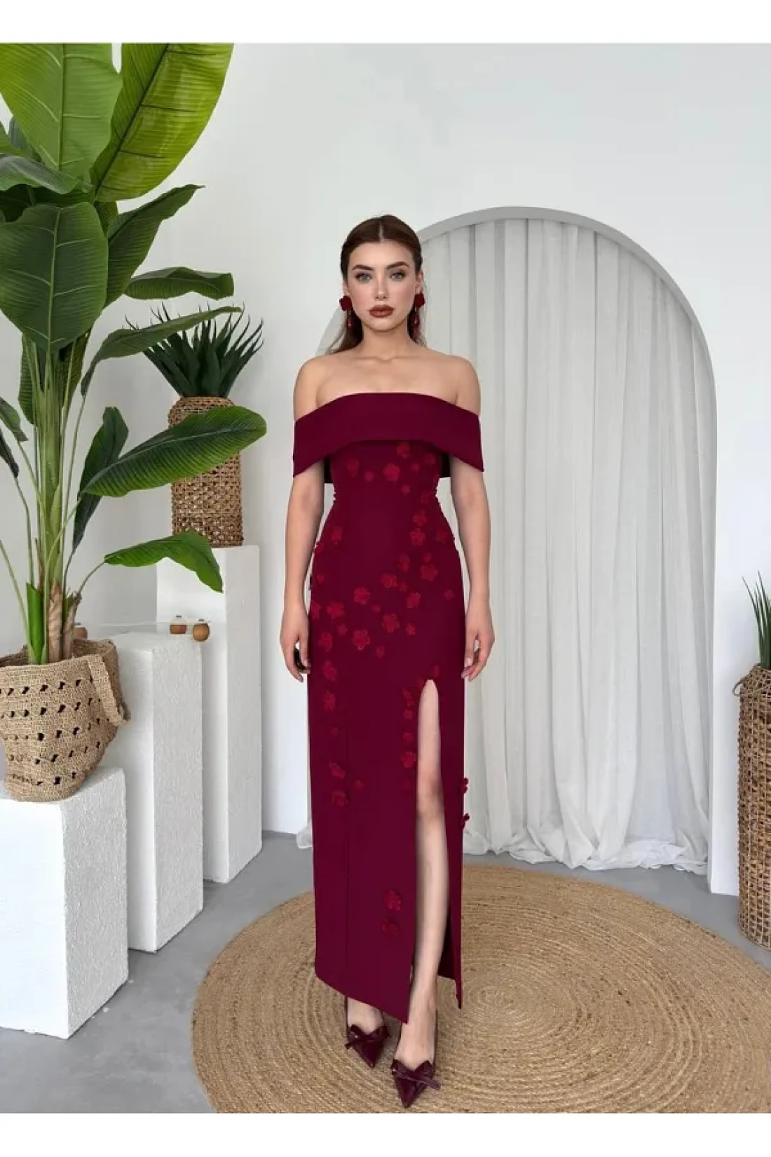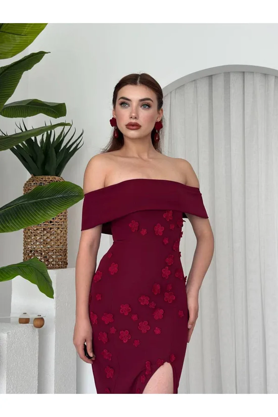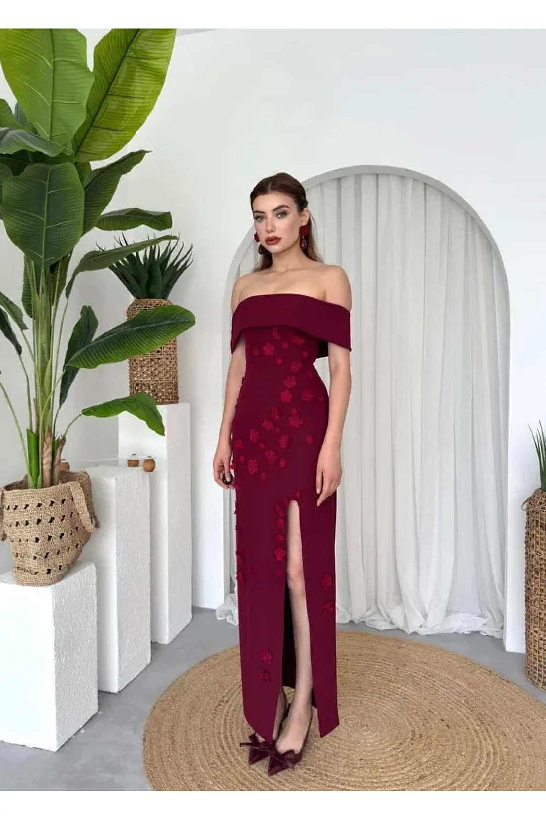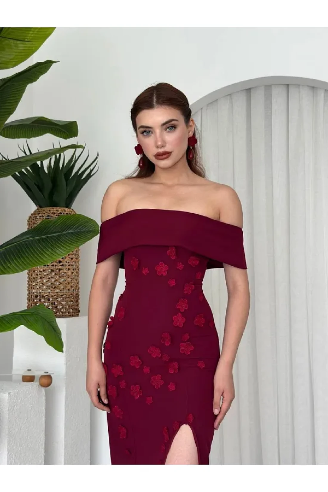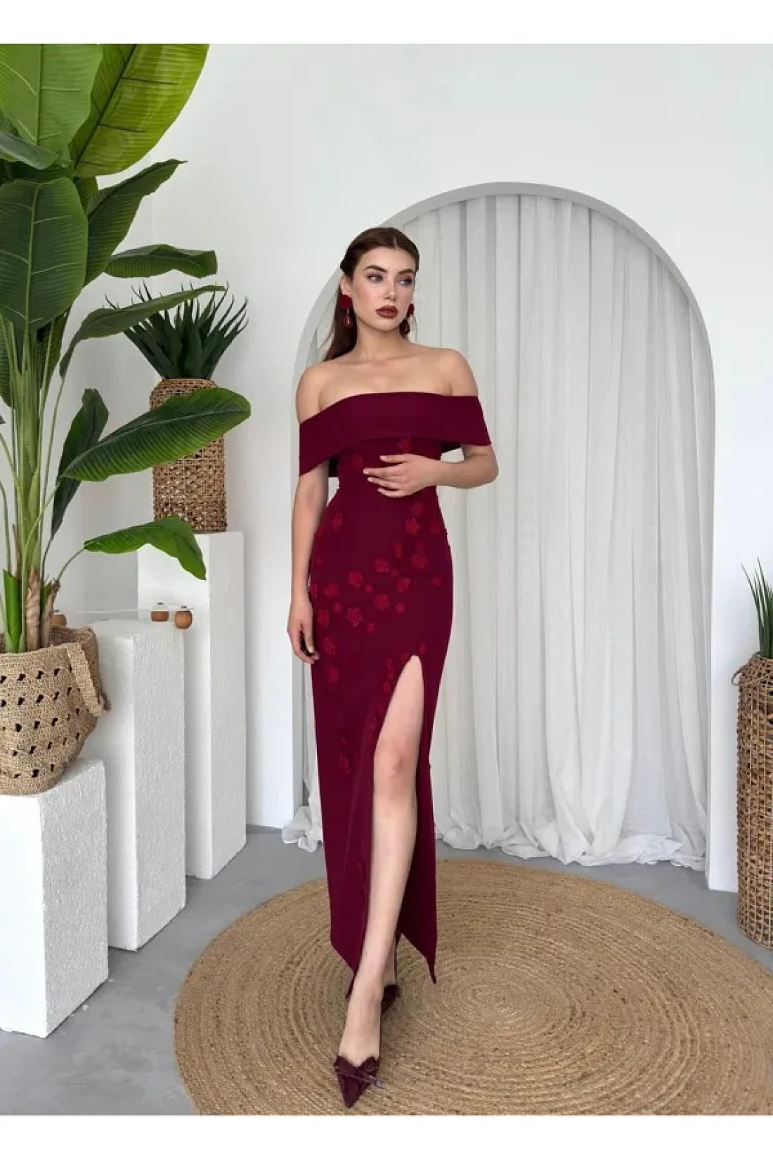 Afiş Butik Burgundy Madonna Collar Floral Embroidered Slit Long Dress