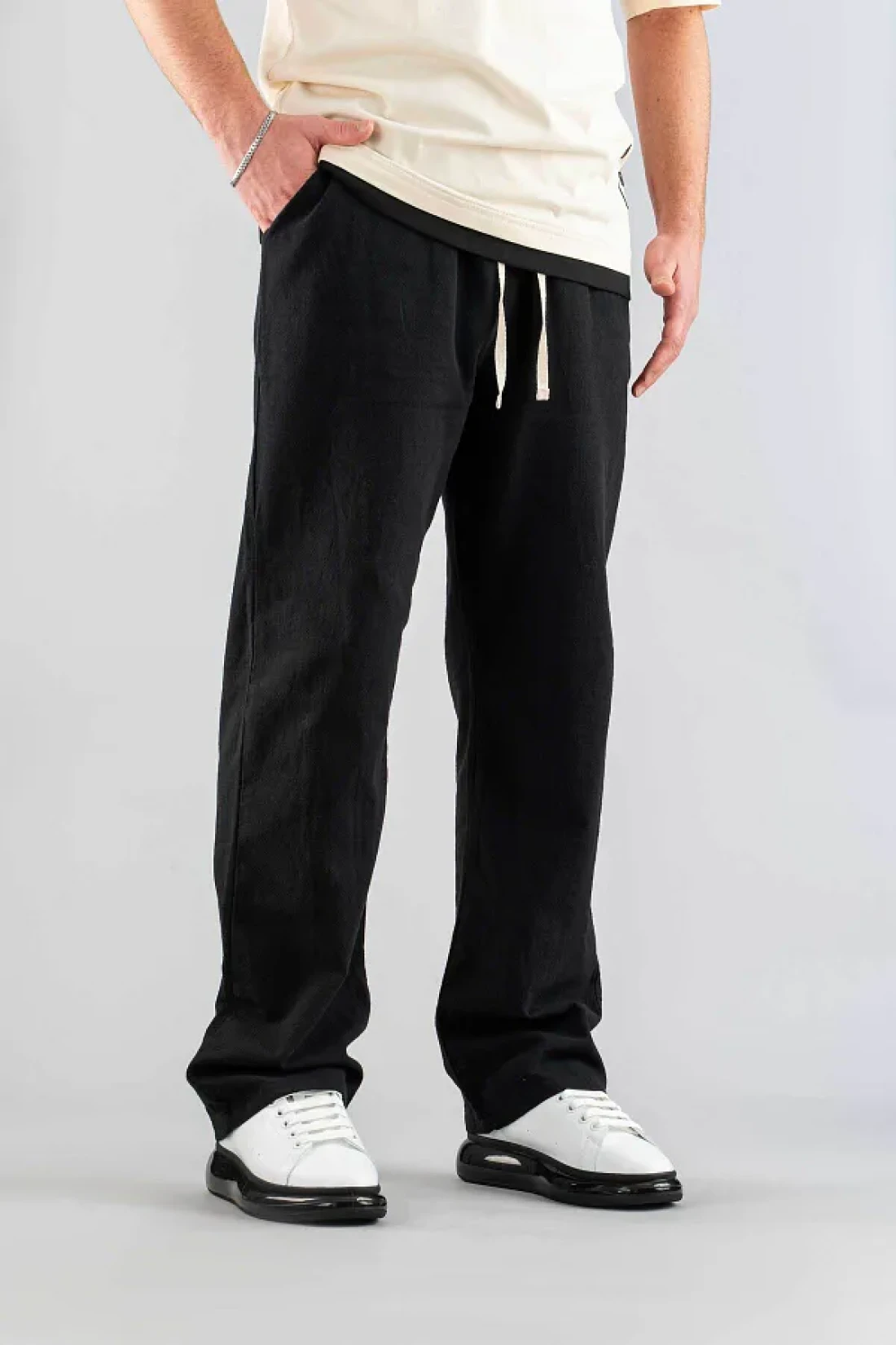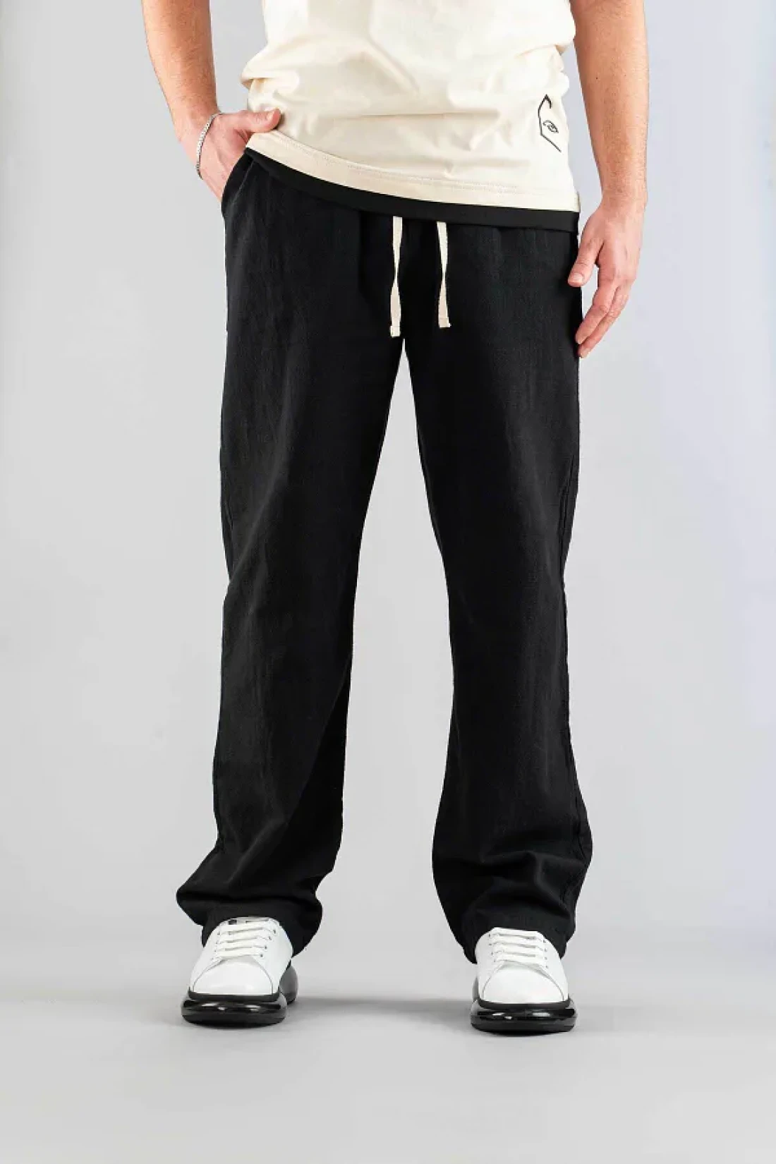 bombe Men's Black Linen Trousers Comfortable Fit Belted Drawstring Elastic Waist Linen Trousers
