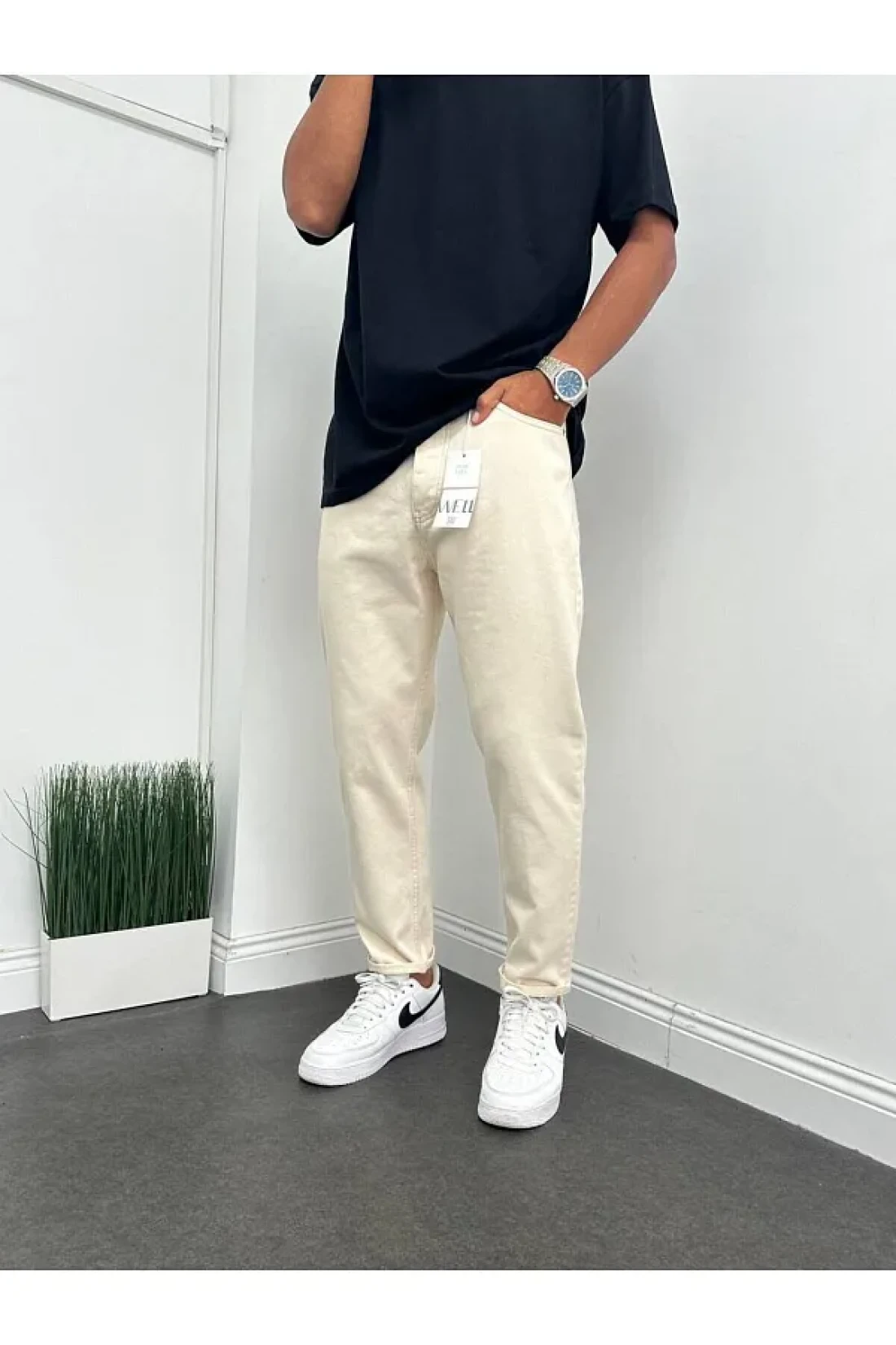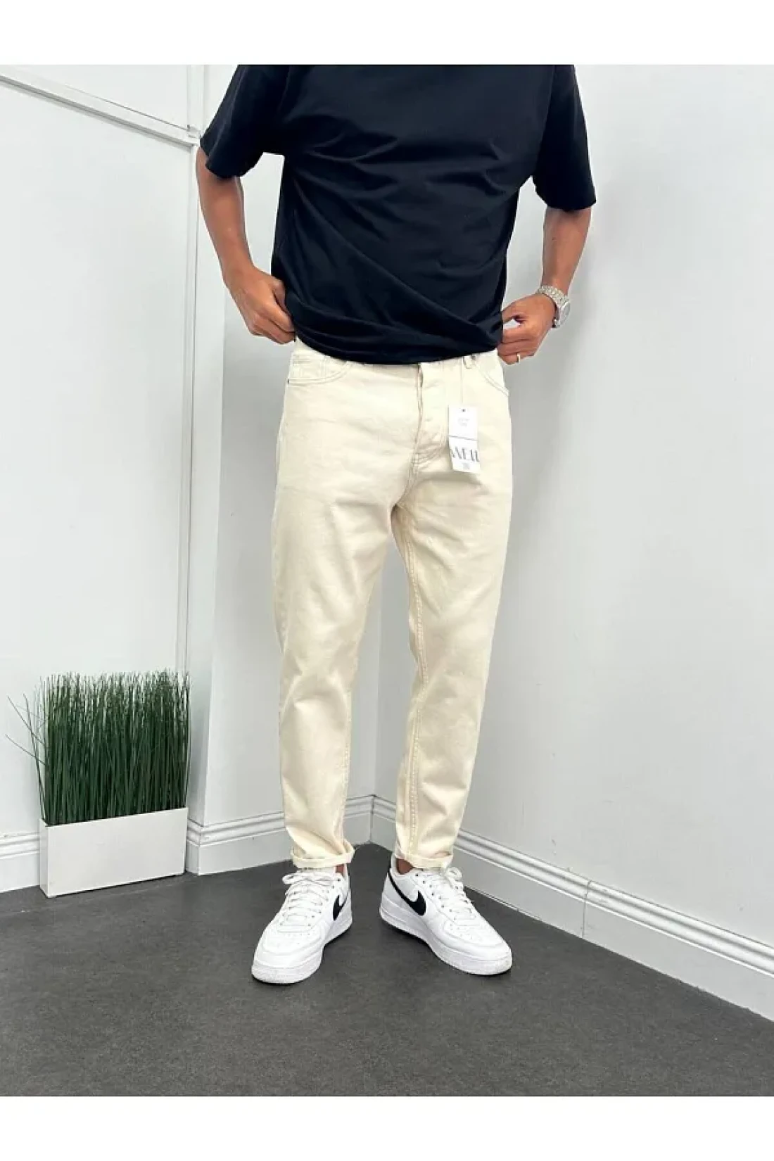 Straight patterned and relaxed fit boyfriend cream-colored trousers that adapt to every environment from day to night.