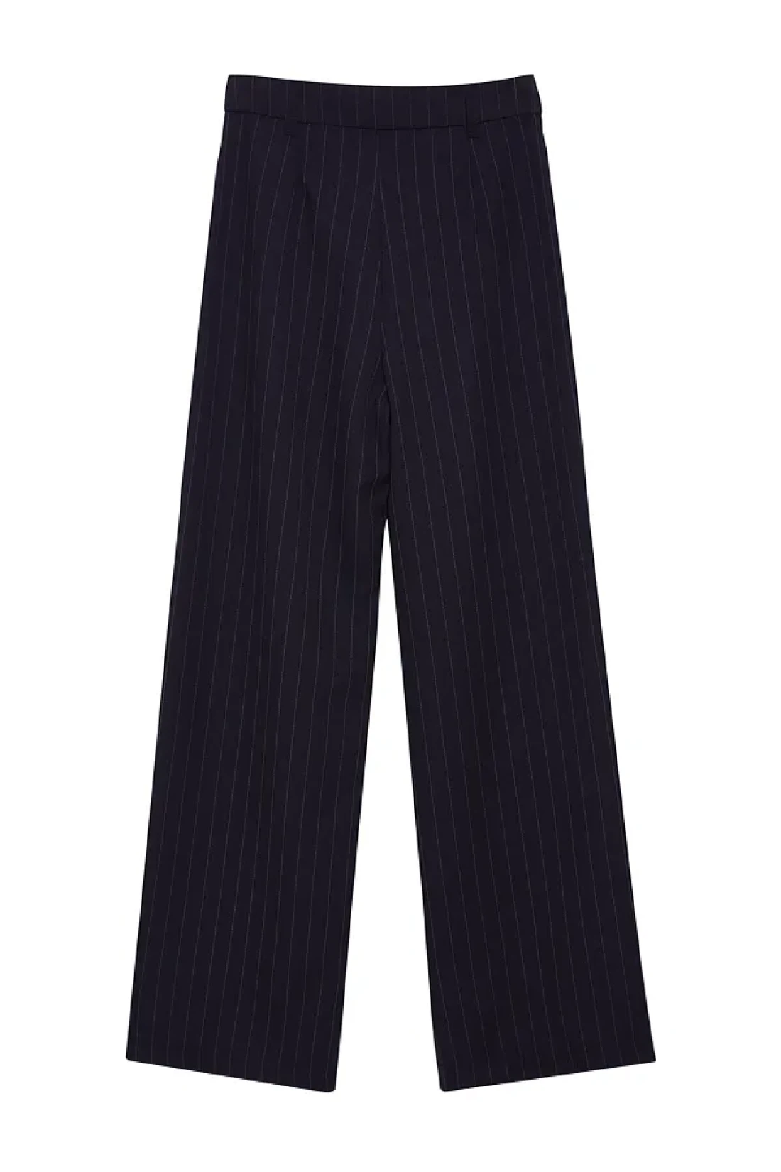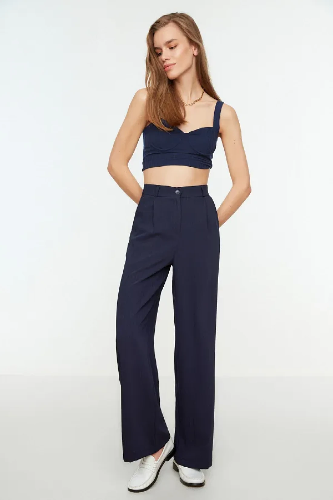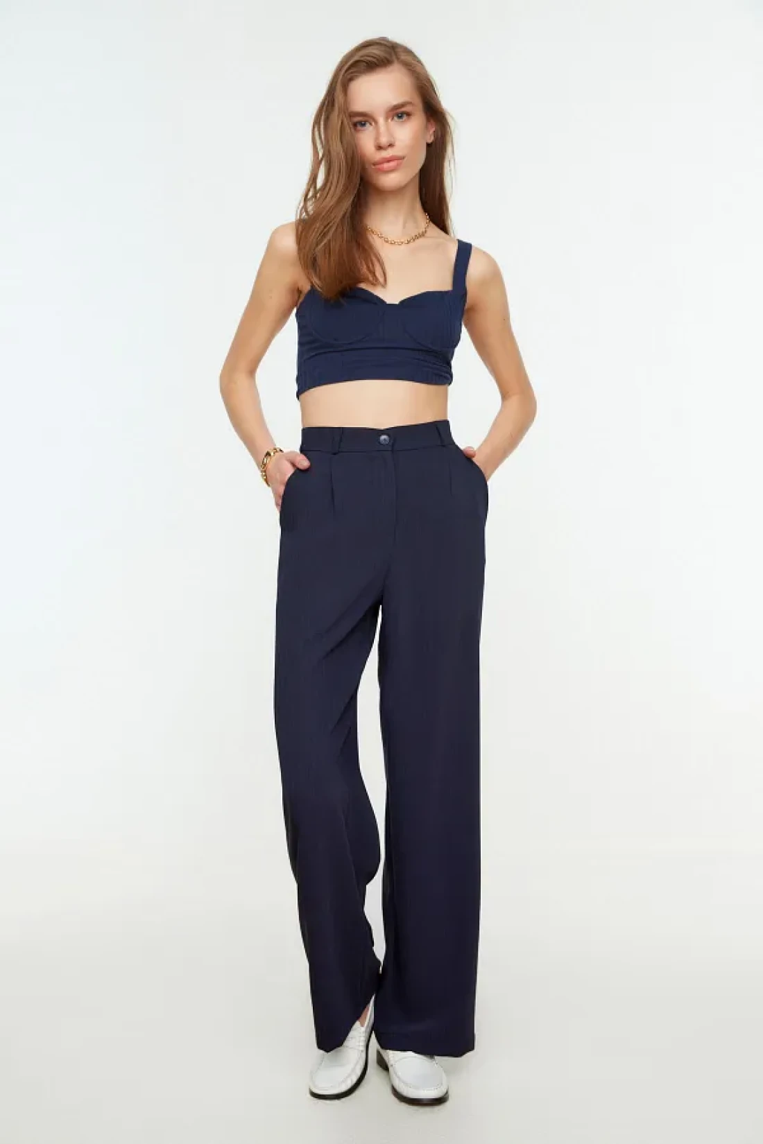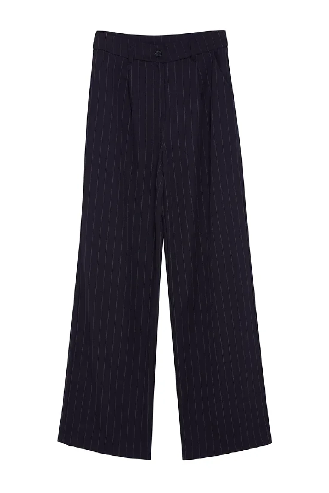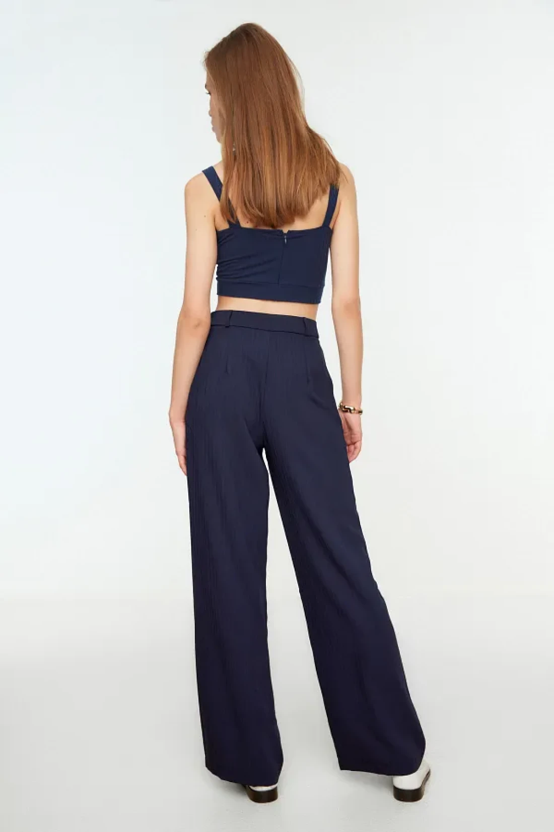 Collection Navy Blue High Waist Wide Leg / Wide Leg Striped Woven Trousers TWOSS22PL0100
