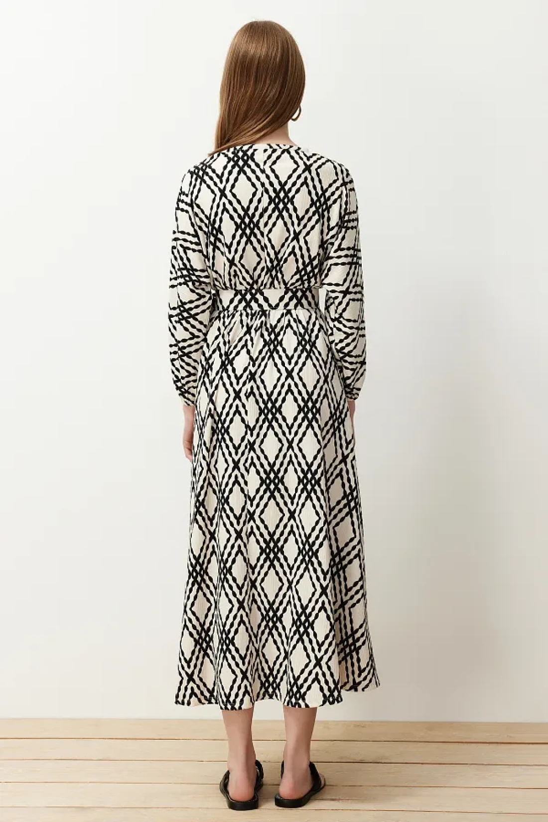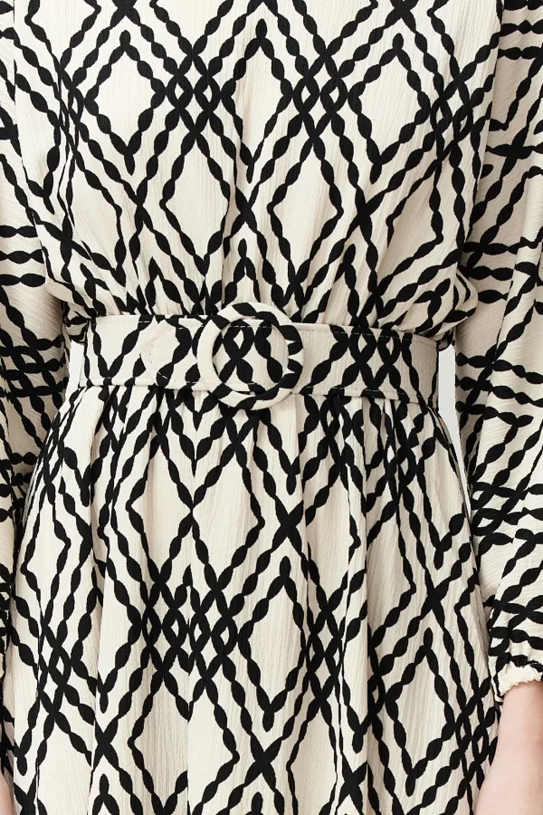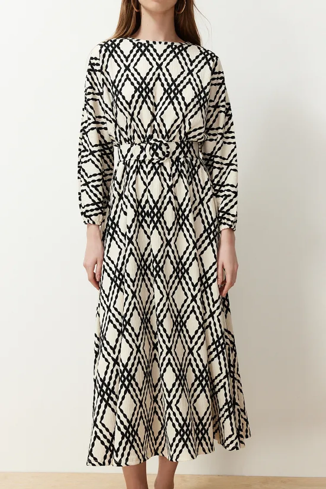 Modest Black Patterned Belt Detailed Crinkle Woven Dress TCTSS24EB00233