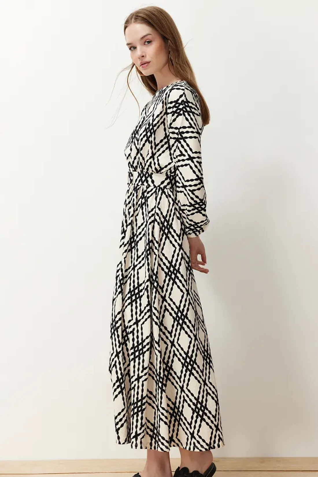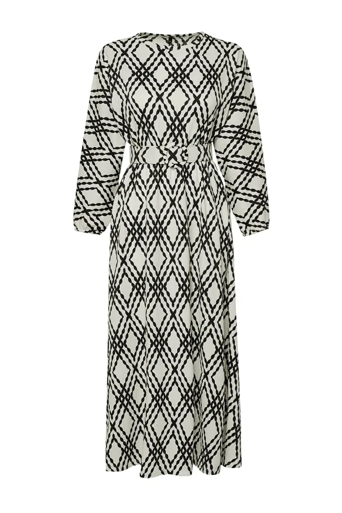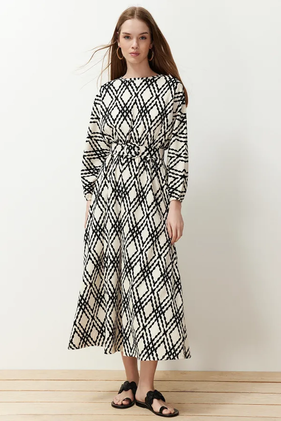 Modest Black Patterned Belt Detailed Crinkle Woven Dress TCTSS24EB00233