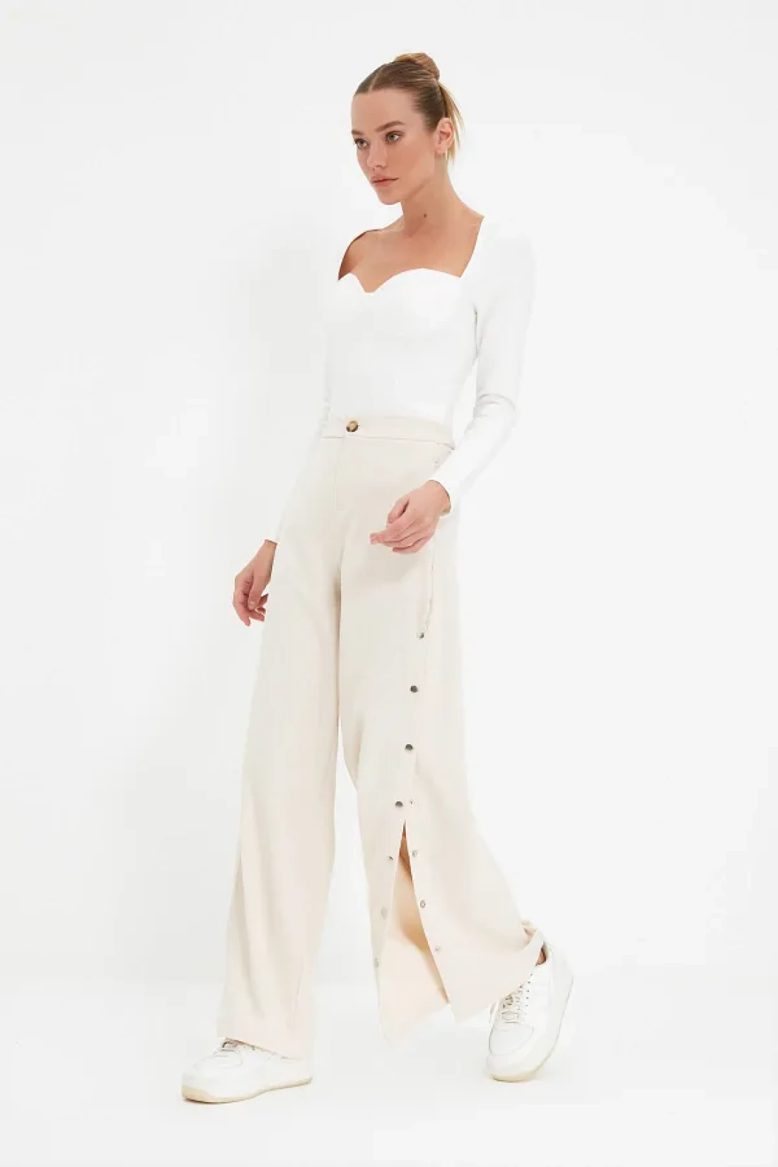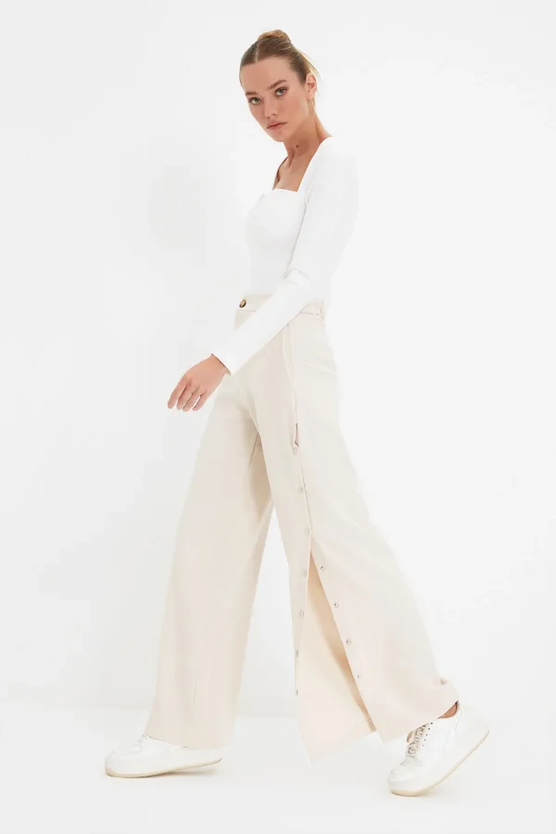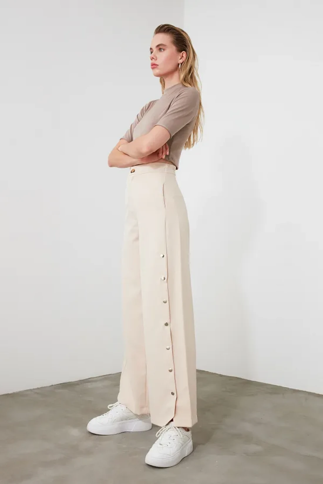 Collection Wide Leg and Buttons Side Woven Fabric Pants - Twoss20Pl0398