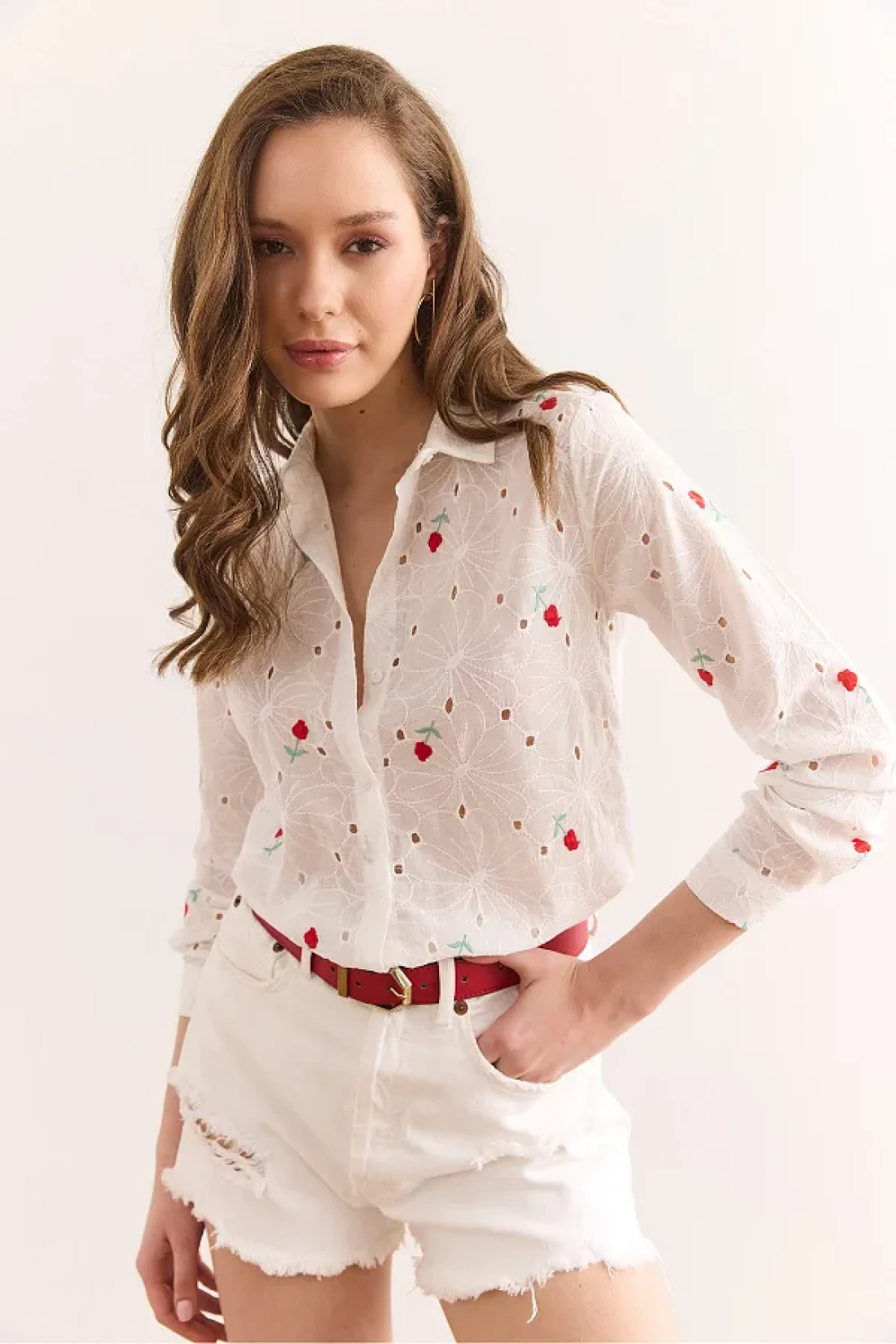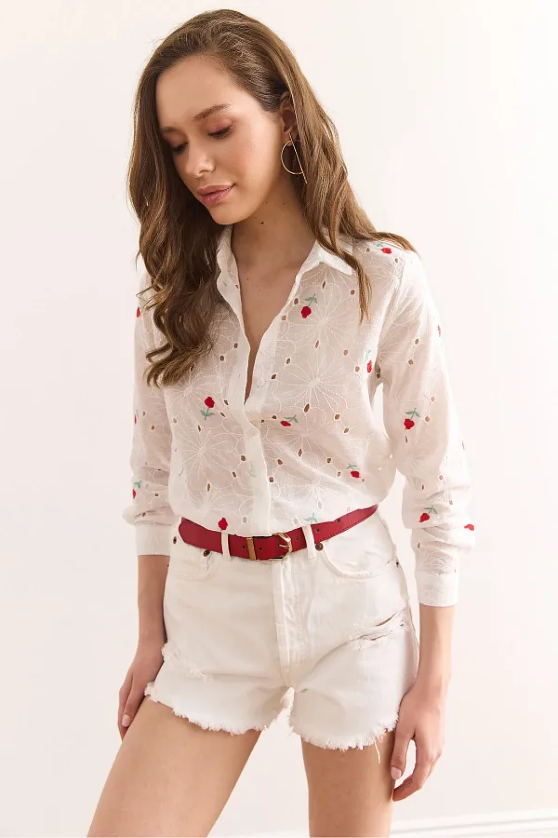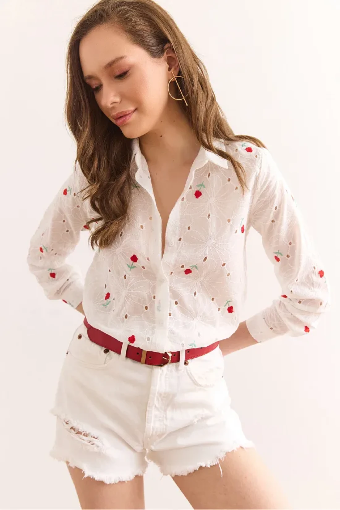 Olalook Women's White Red Colorful Floral Cotton Scallop Shirt Gml-19001326